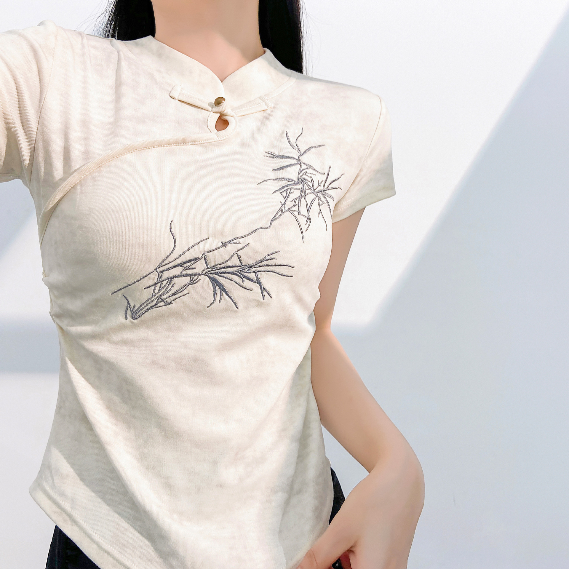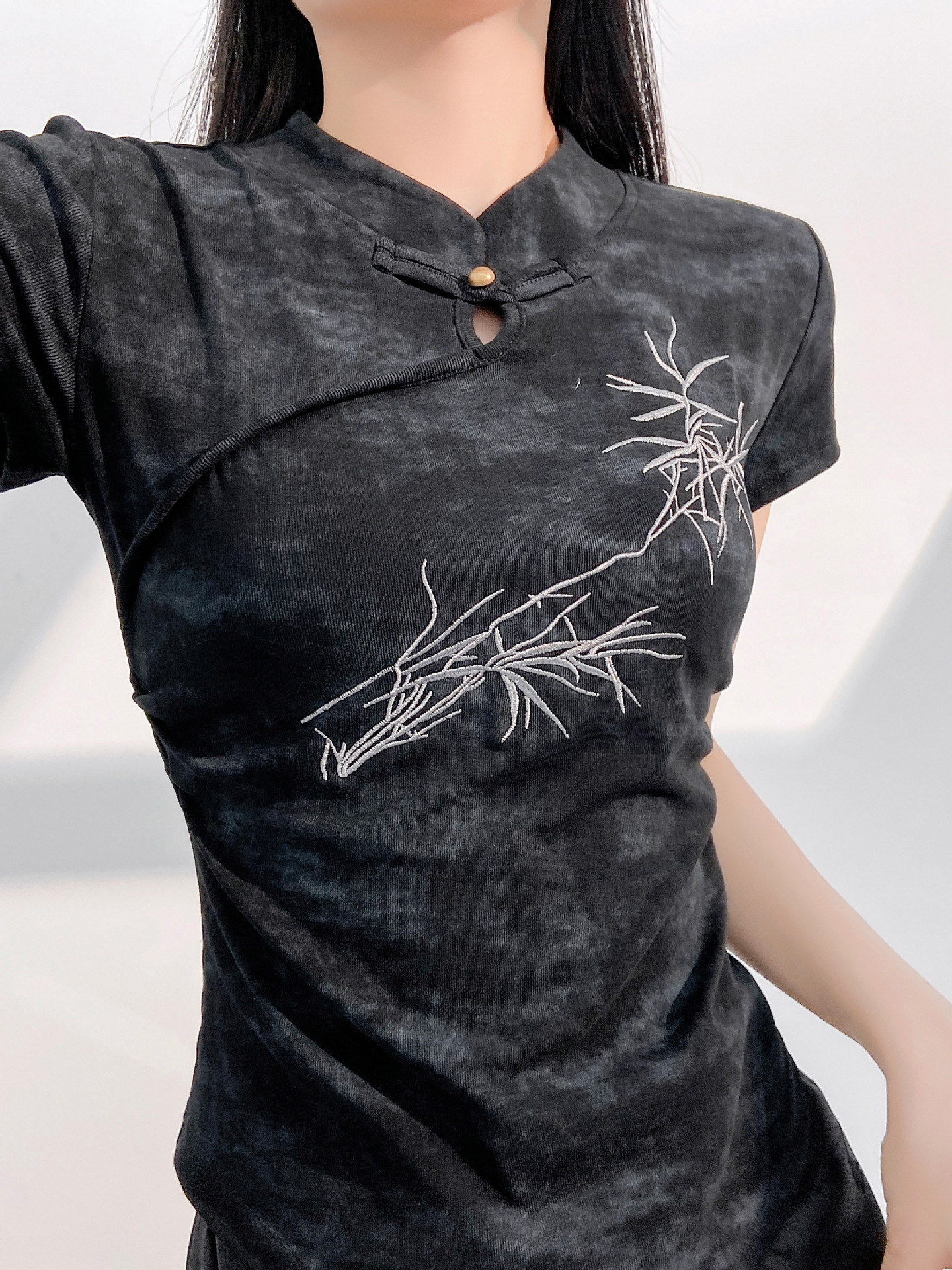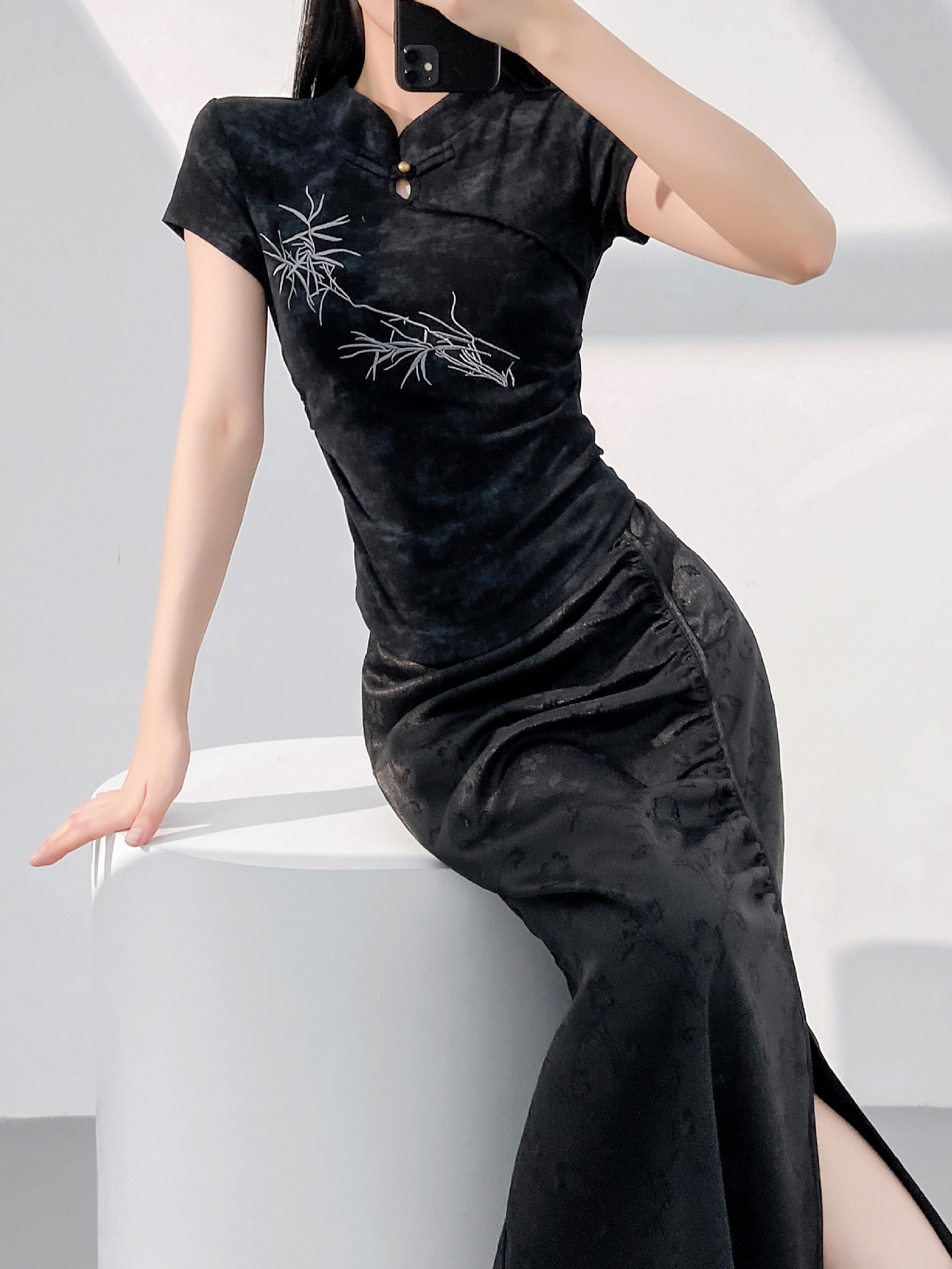 Главная страница > 2025 новый летний костюм в китайском стиле для женщин, утягивающий талию, с открытым животом, короткий рукав, атласный жаккард, элитная юбка