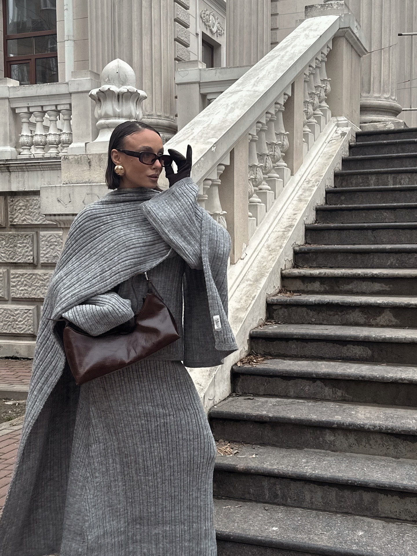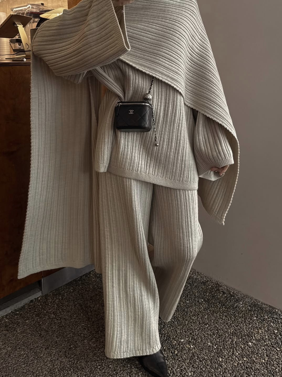 Главная страница > Европейский и американский осенне-зимний однотонный свитер с круглым вырезом, женский свободный вязаный свитер, широкие брюки, шарф, комплект из трех предметов