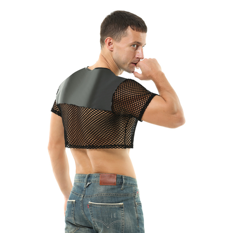 Главная страница > Оптовая Продажа с фабрики Мужская футболка сексуальная кокетливая искусственная кожа прозрачная рыболовная сеть с круглым вырезом полый топ больших размеров без штанов