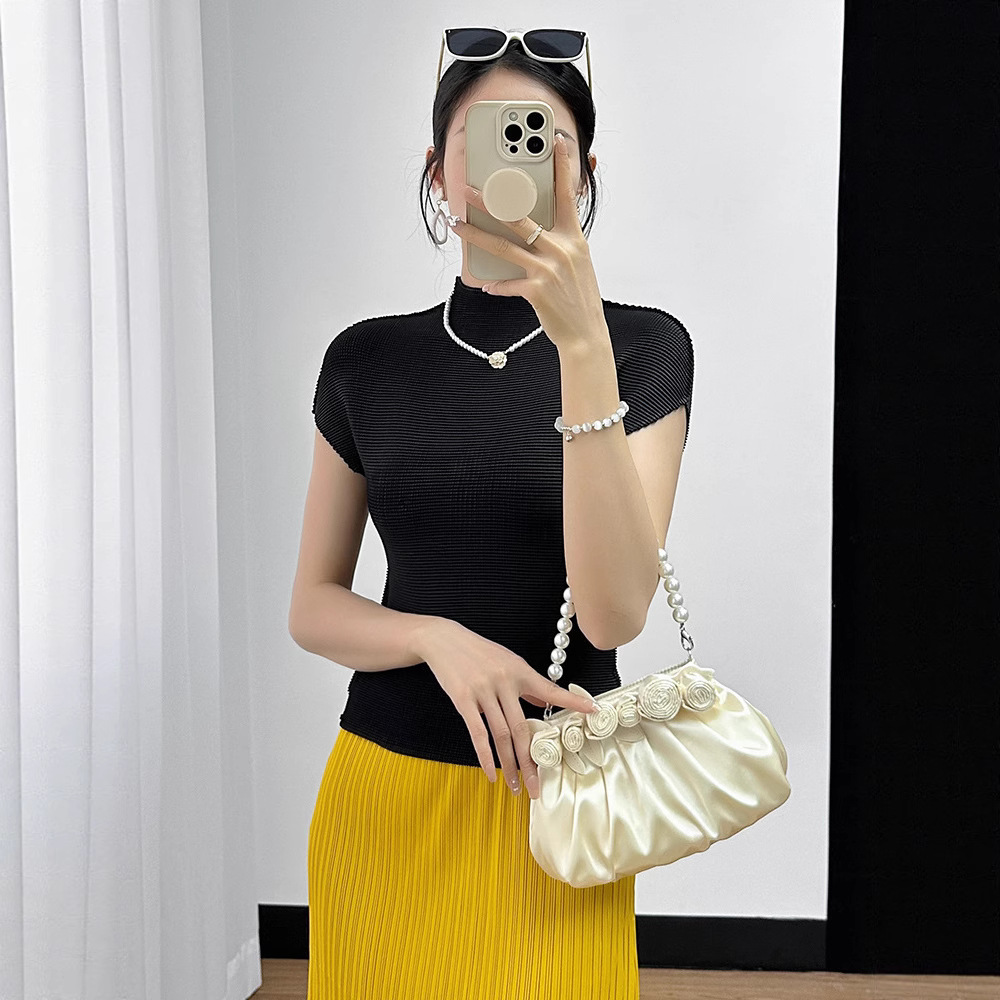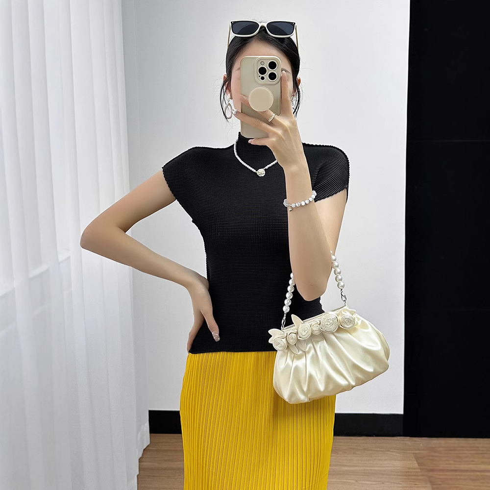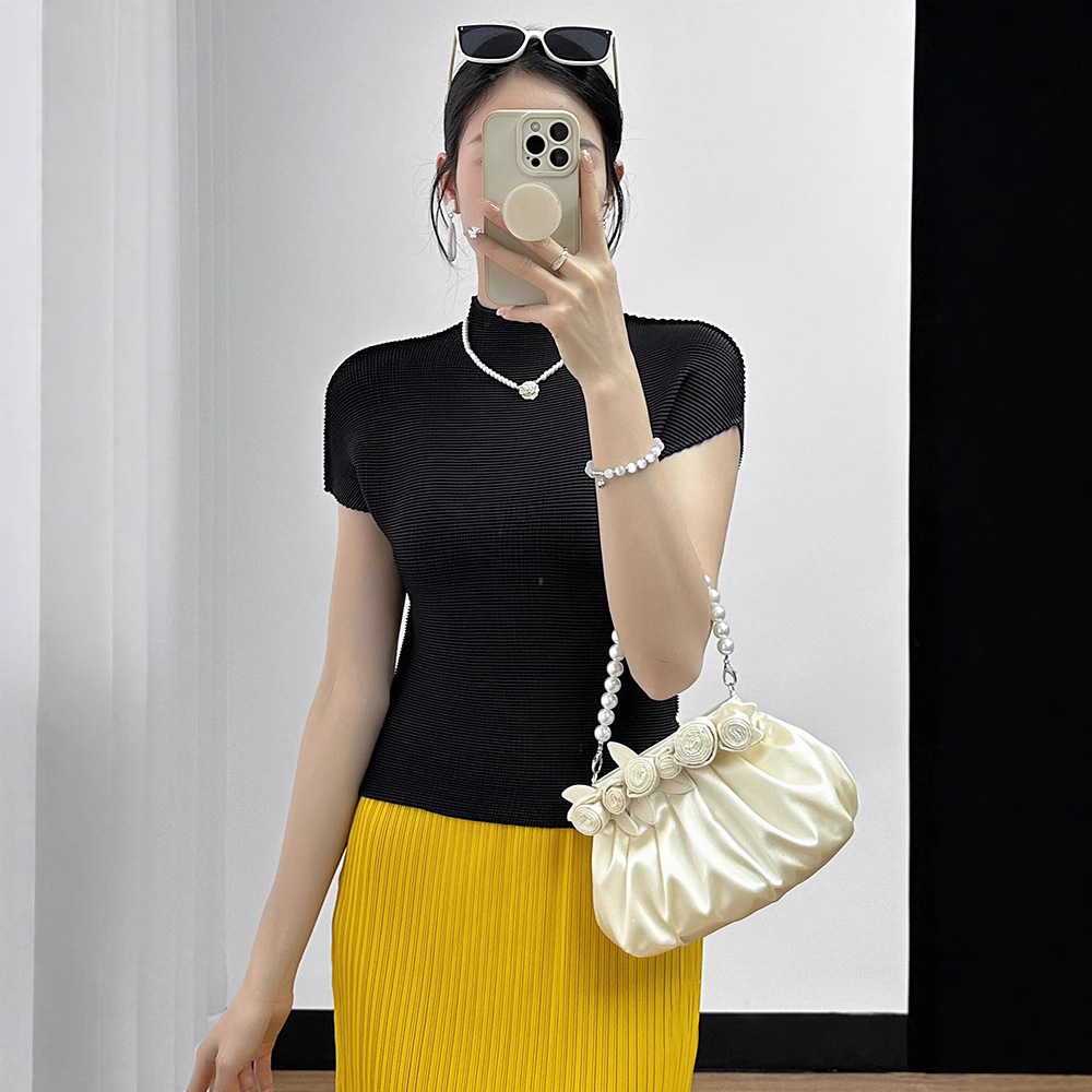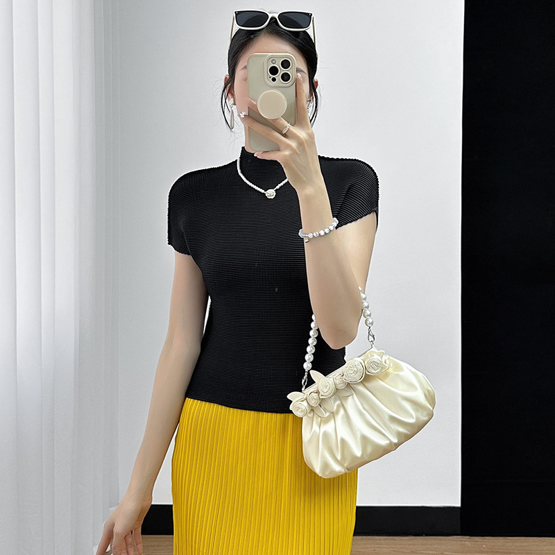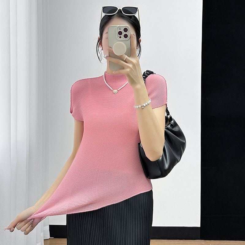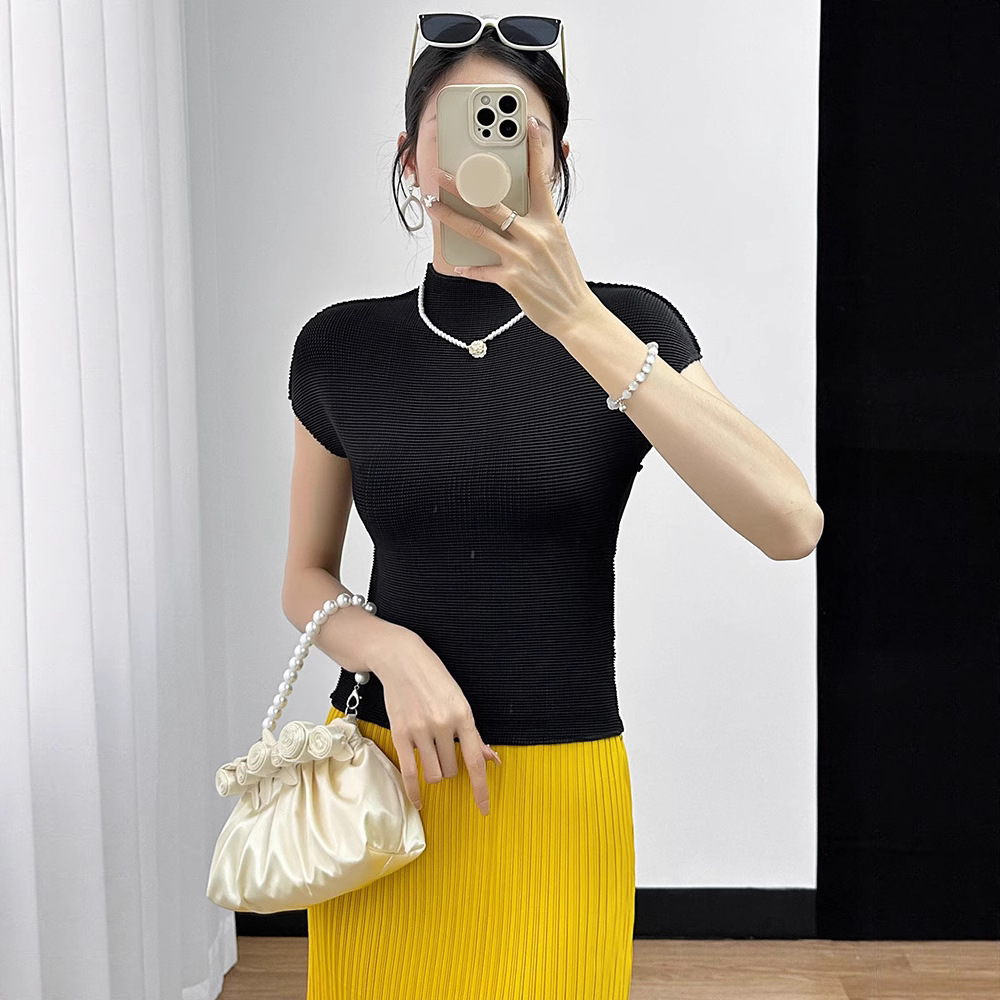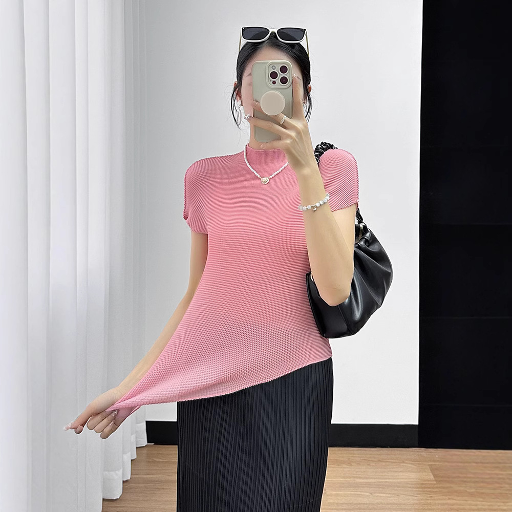 Главная страница > Miyake 2024, летняя модная футболка, новые женские элегантные однотонные плиссированные топы с короткими рукавами и круглым вырезом, уменьшающие возраст