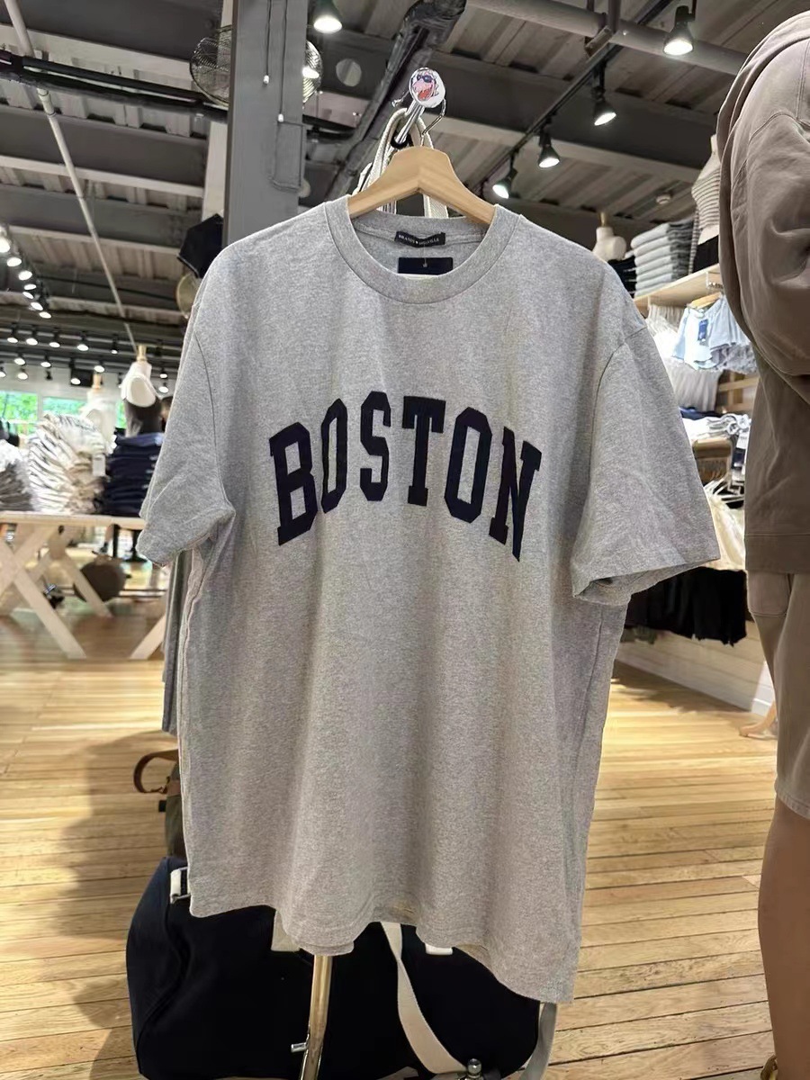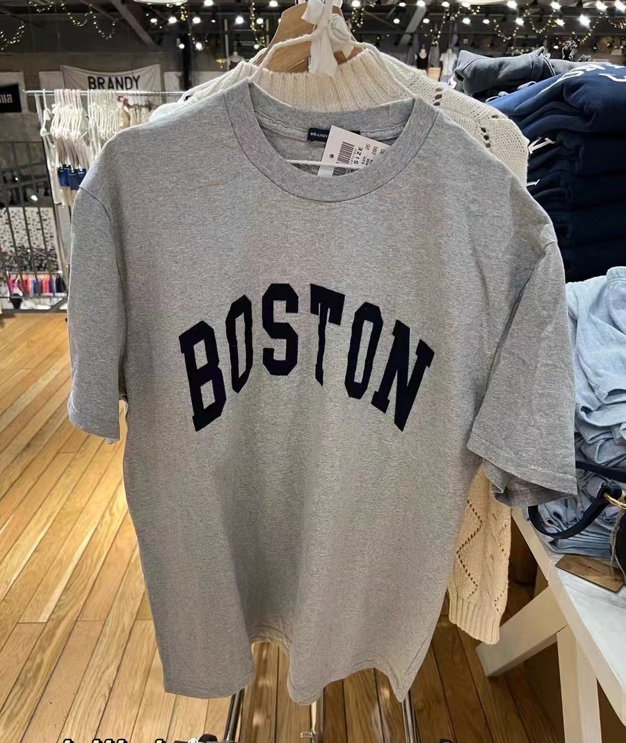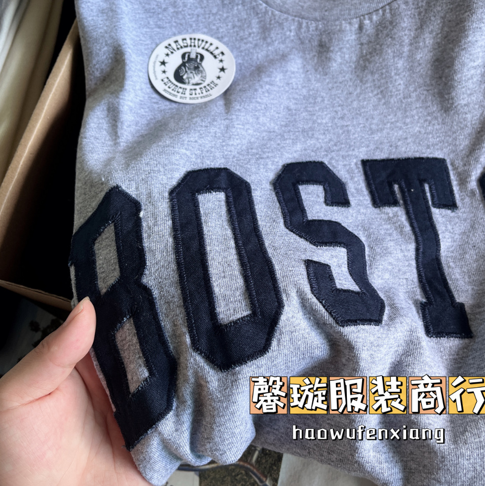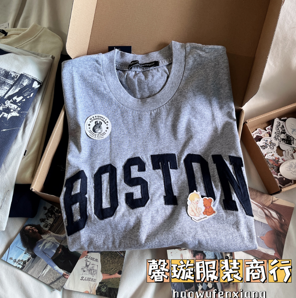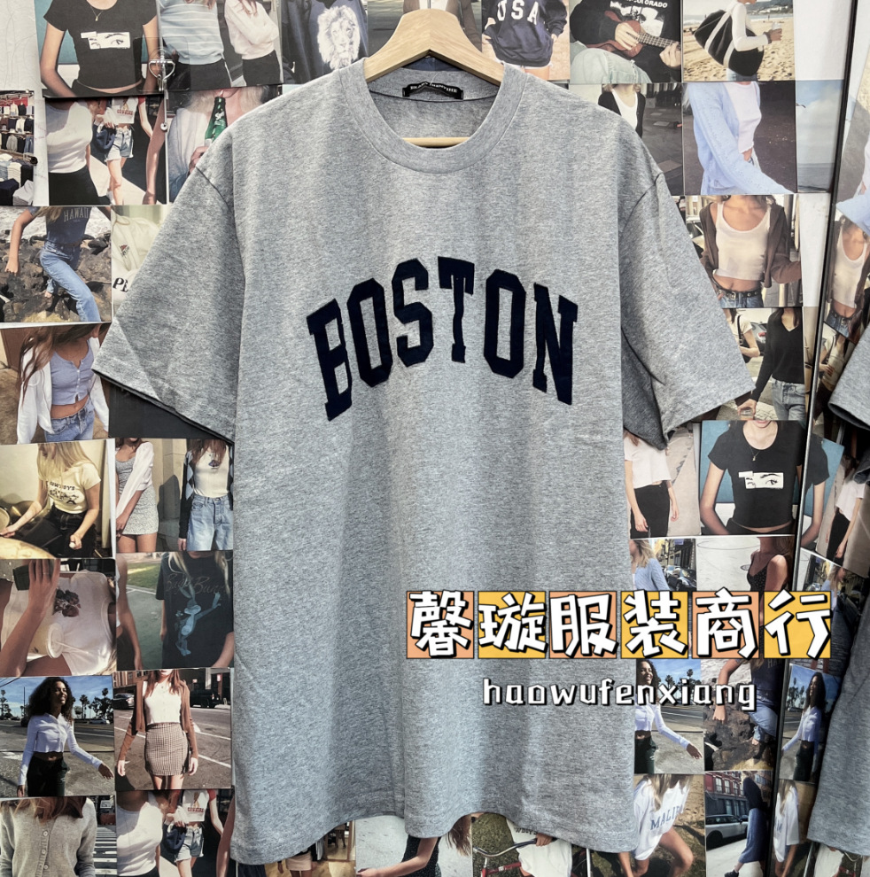 Главная страница > Серая футболка с круглым вырезом в стиле BM и вышивкой BOSTON, свободная футболка с короткими рукавами