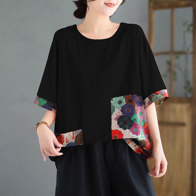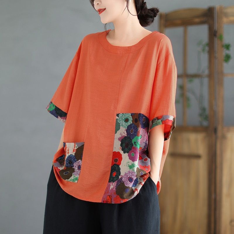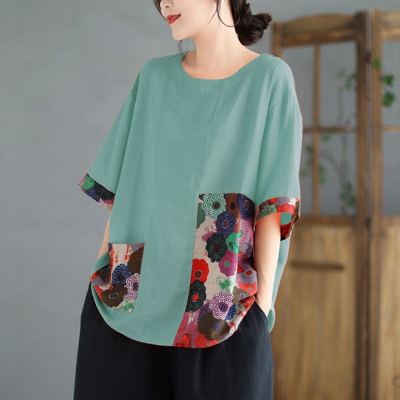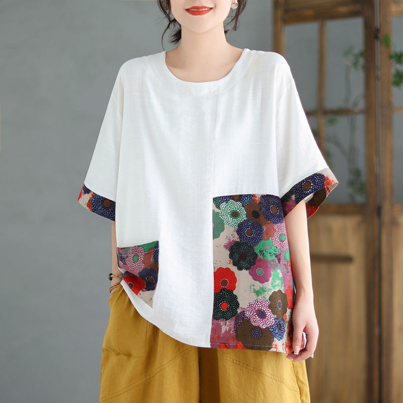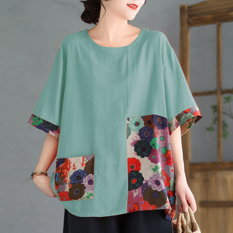 Главная страница > Новый женский свободный толстый женский топ больших размеров из хлопка и льна, женская футболка с короткими рукавами для матерей среднего и пожилого возраста, летняя мода