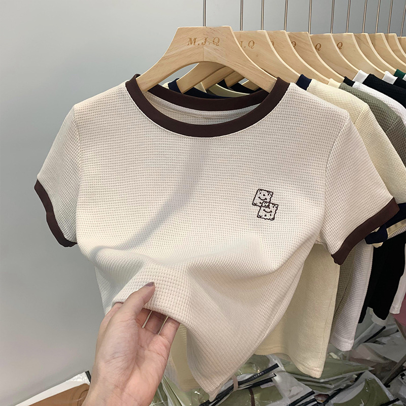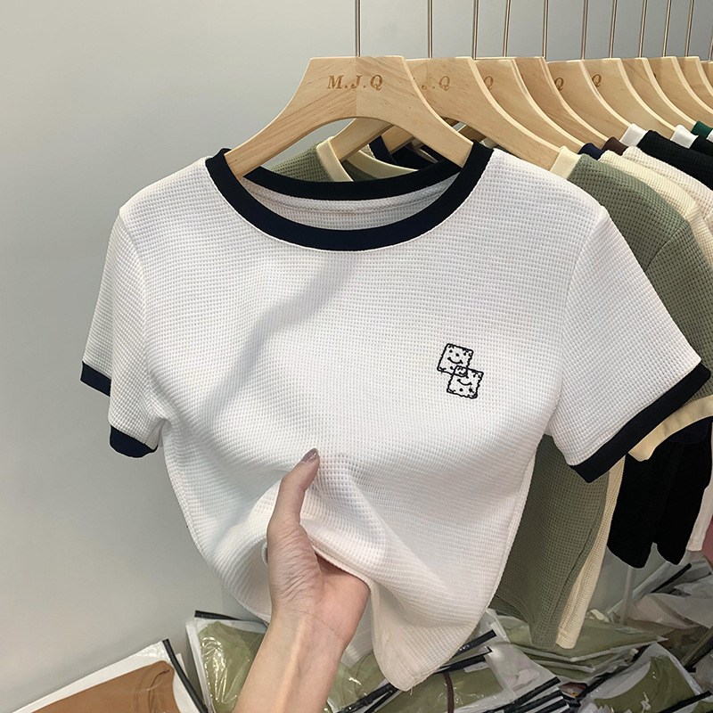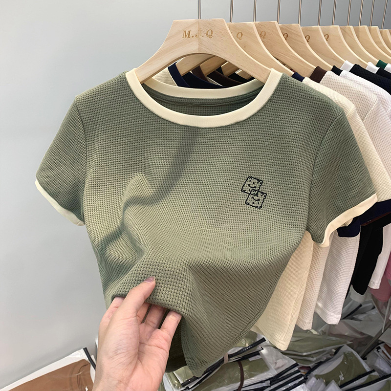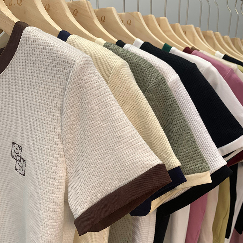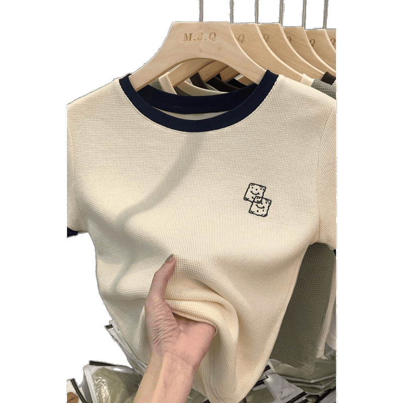 Главная страница > Реальный снимок женской футболки с правым плечом, коротким рукавом, новый дизайн 2025 года, контрастный цвет, свободная рубашка, короткий топ из ледяного шелка, вязаный топ