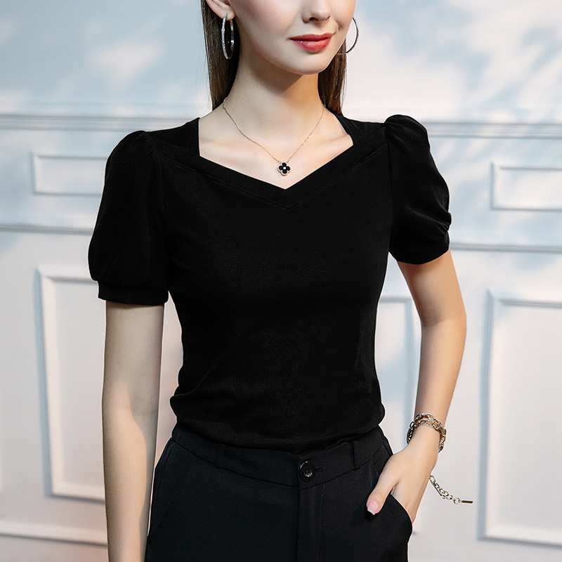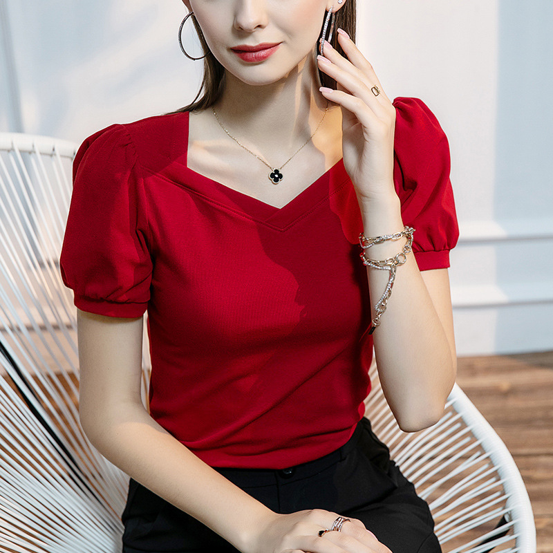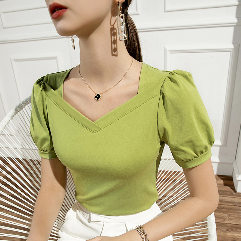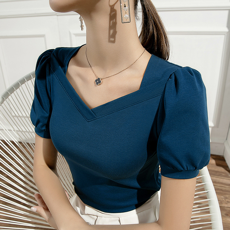 Главная страница > Летний новый французский винтажный рукав с пузырьками, футболка с короткими рукавами, тонкая хлопчатобумажный квадратный воротник весной и летом