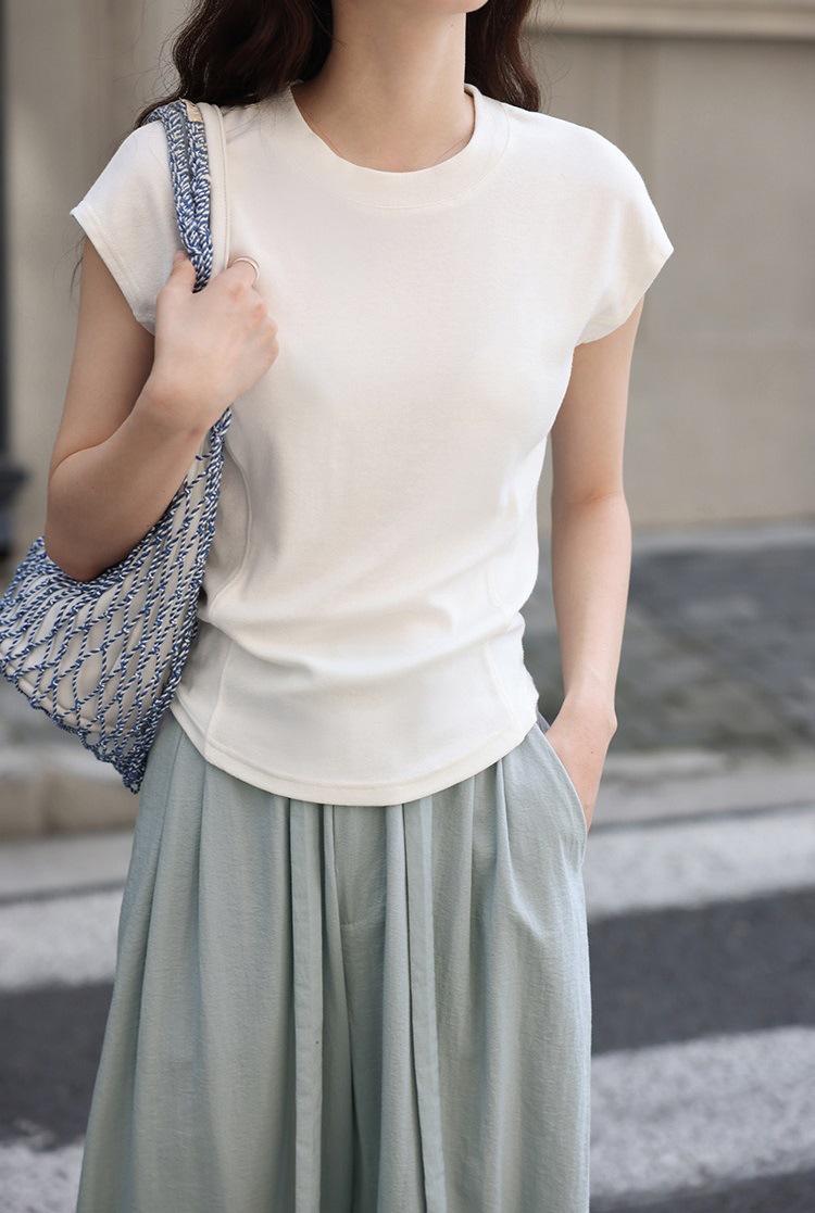 [Спот] 1313 Костная линия тонкая! Белая темпераментная футболка с рукавами женская короткая рубашка с тонким рукавом повседневная рубашка с круглым вырезом