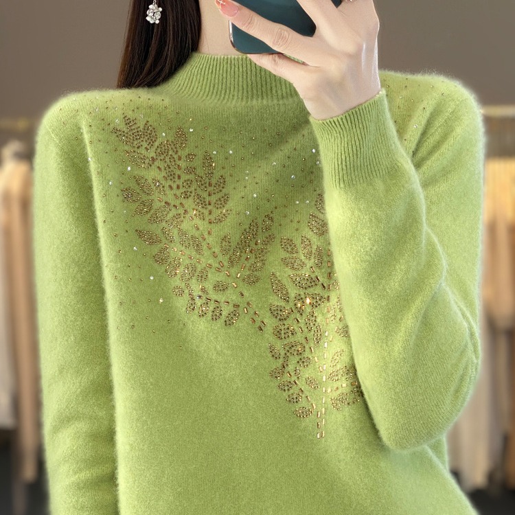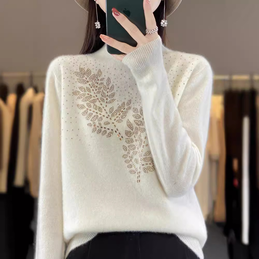 Оптовая продажа: Новинка осени-зимы 2025 – женский свитер с полувысоким воротником, украшенный стразами, трикотажная базовая кофта, внутренний слой, дропшиппинг