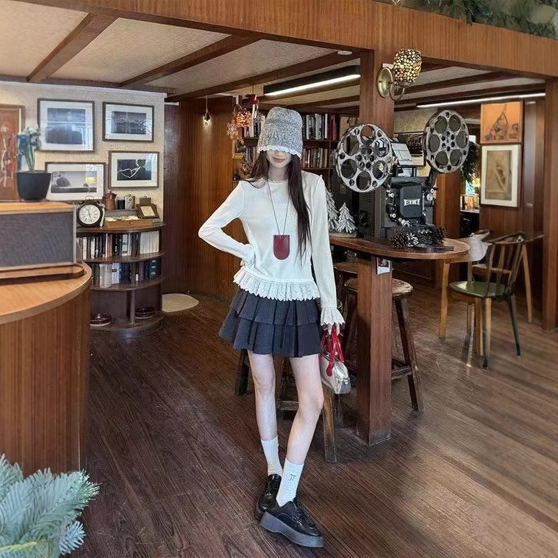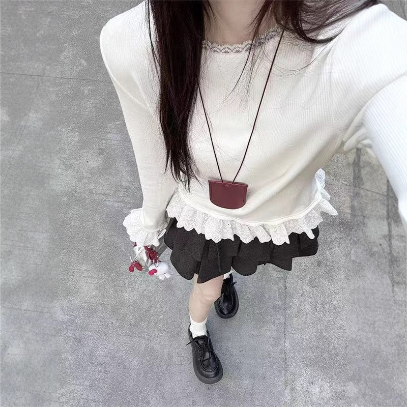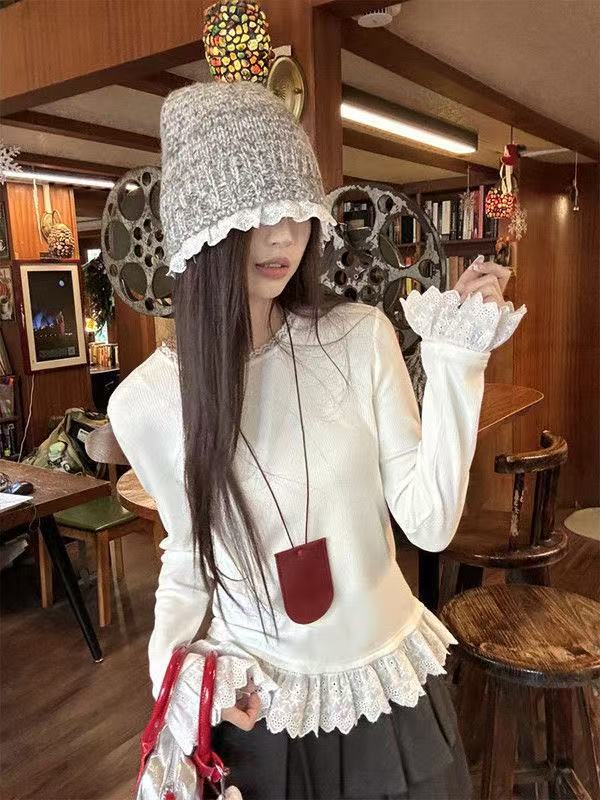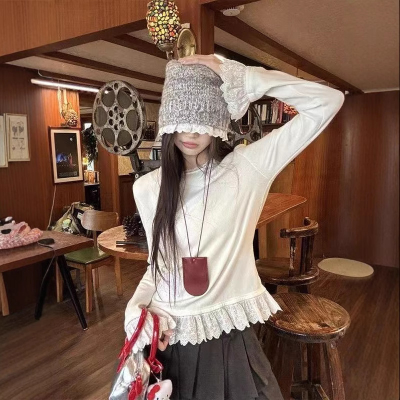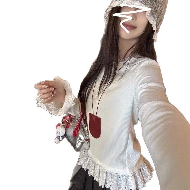 Кружевная трикотажная белая сшитая футболка с длинными рукавами женская весна и осень новая внутренняя рубашка