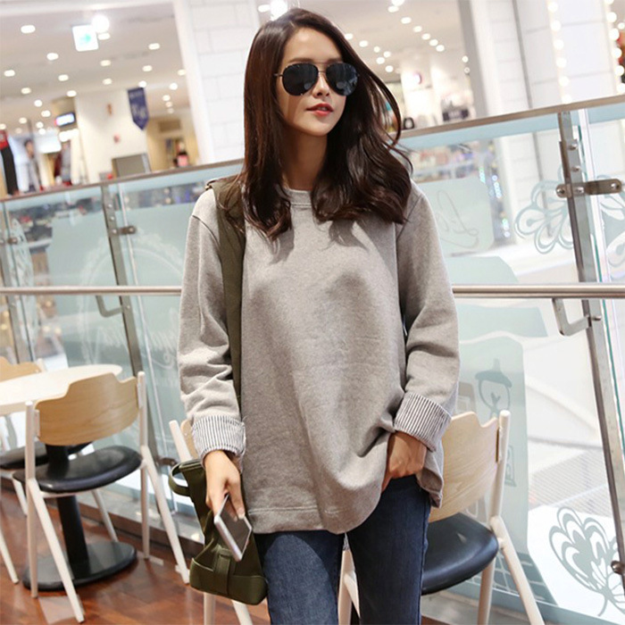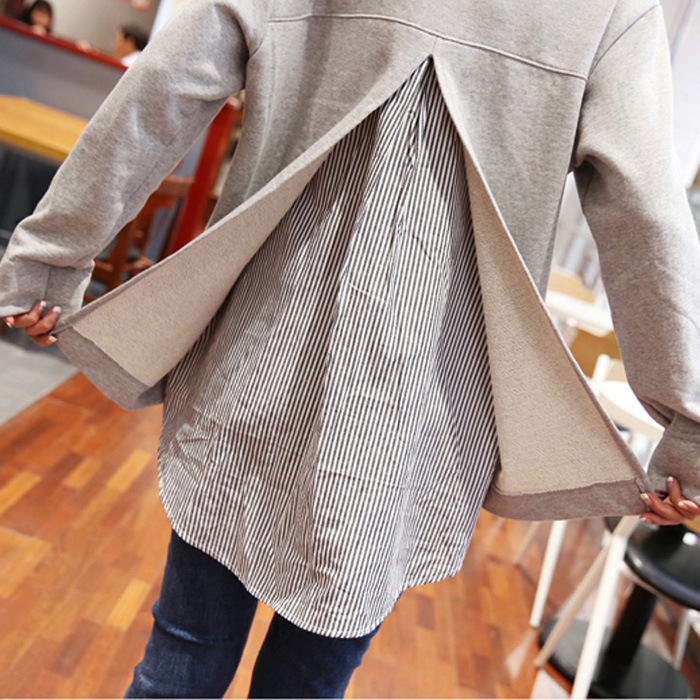 Главная страница > Весна-Осень 2021, женская футболка в полоску с имитацией двух частей, короткая спереди и длинным рукавом, свободная Студенческая футболка средней длины в Корейском стиле, осенняя кровавая