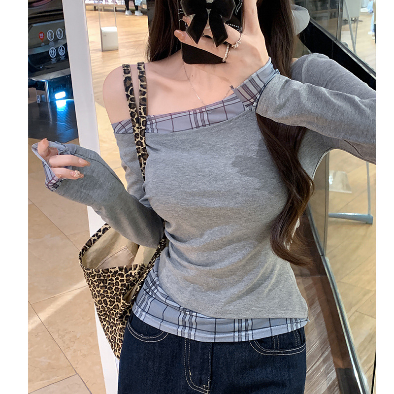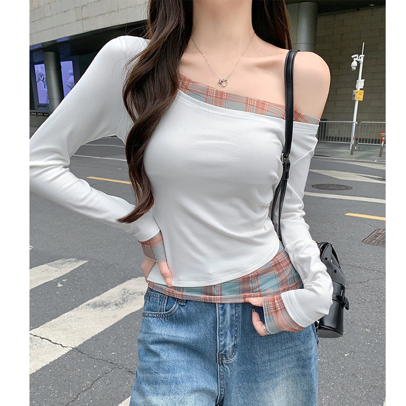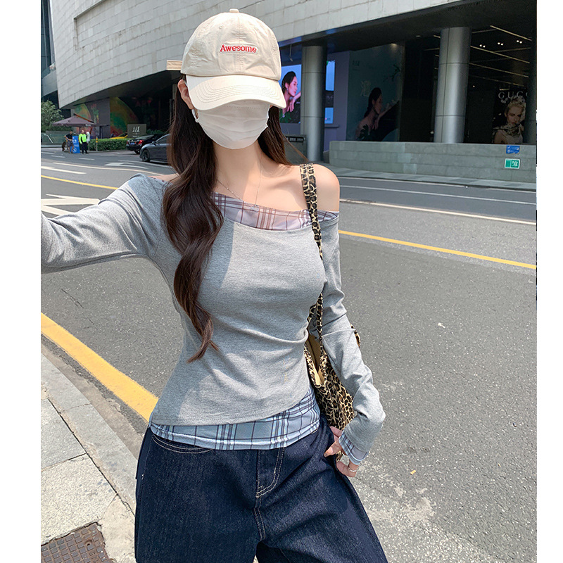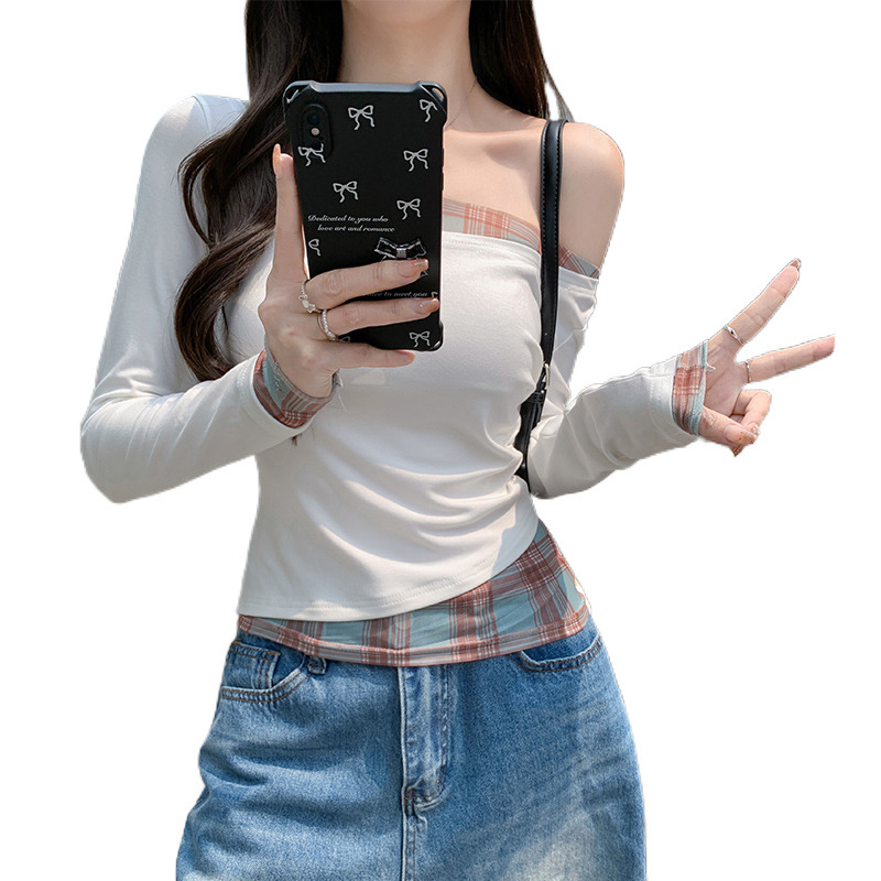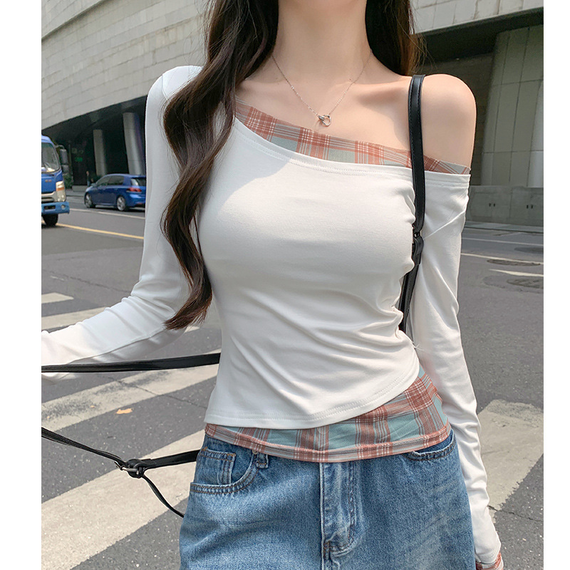 Главная страница > Женская футболка с длинным рукавом, косым плечом, летняя новинка 2025 года, дизайн с комбинированными вставками, утягивающий силуэт, реальная цена, реальный снимок.