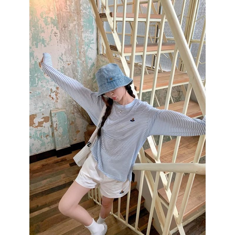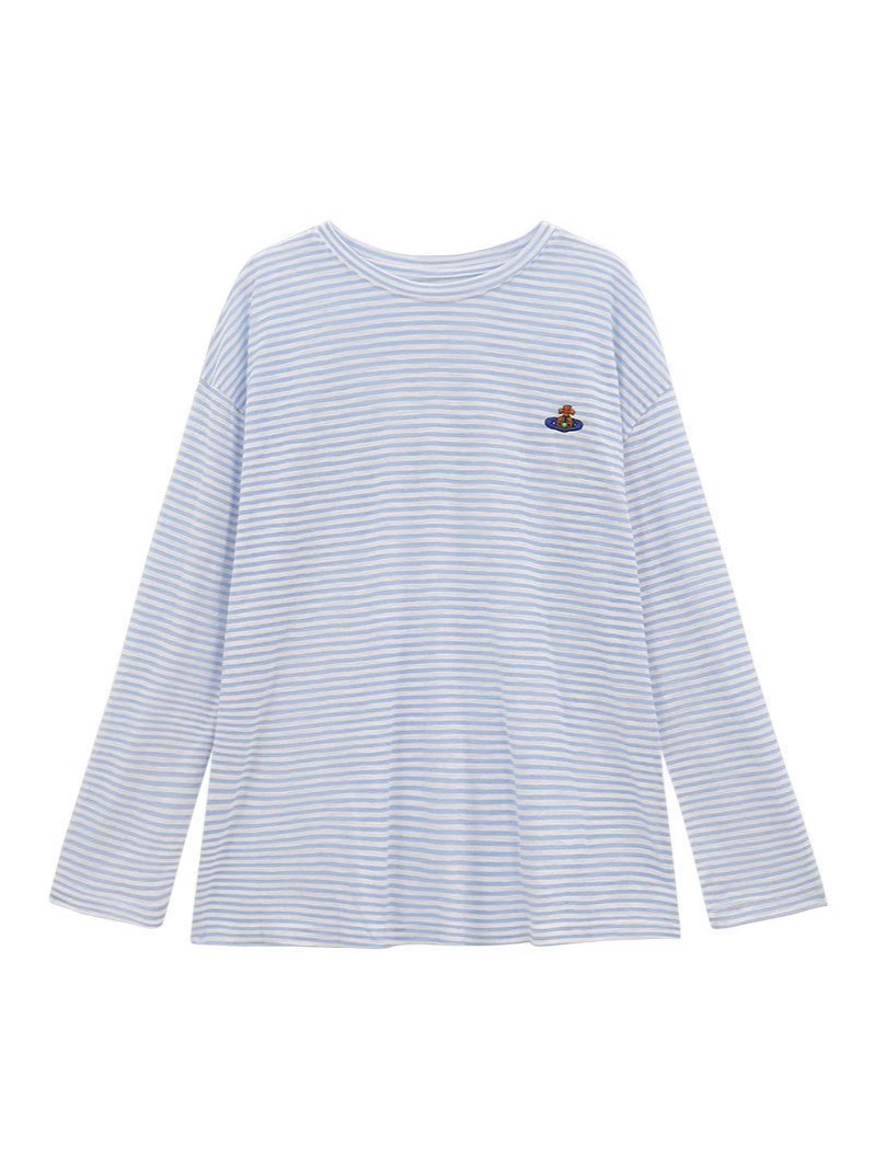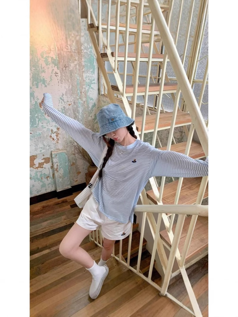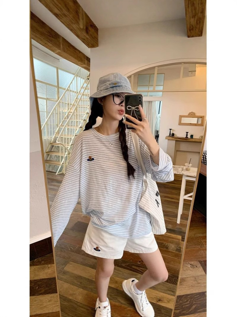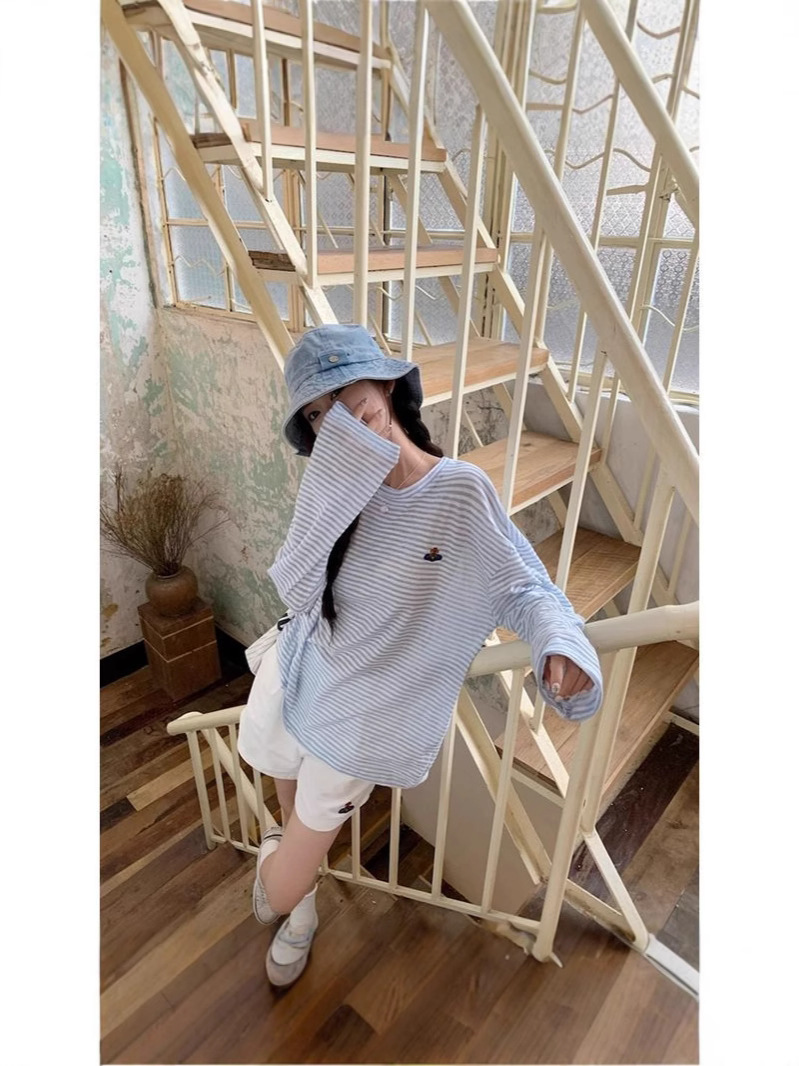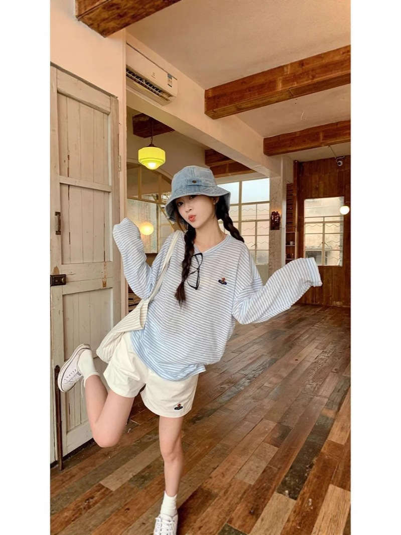 Главная страница > Дизайнерская повседневная и универсальная полосатая футболка контрастного цвета с длинными рукавами, женская летняя новая маленькая пуловерная футболка с круглым вырезом
