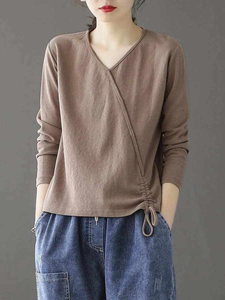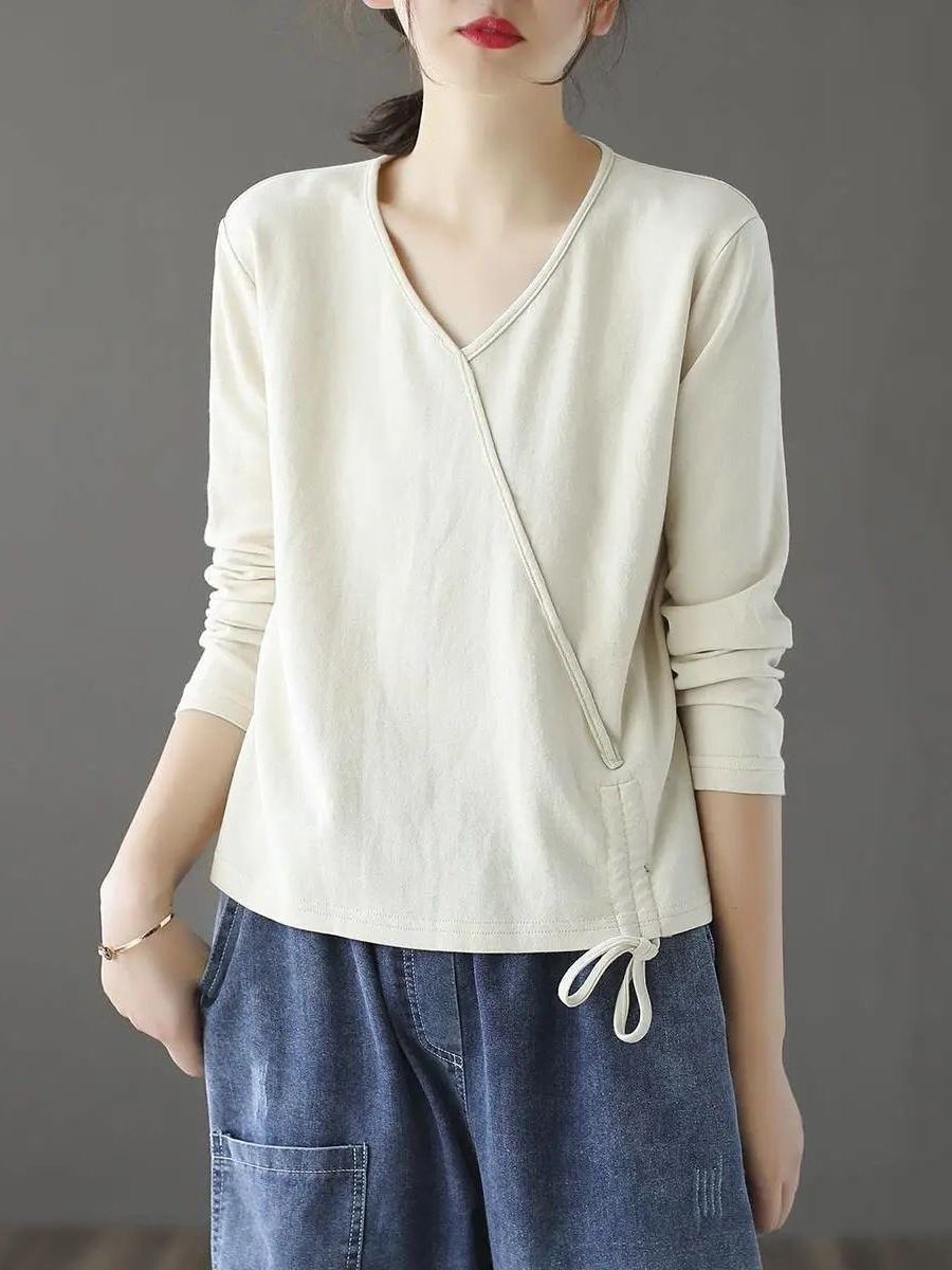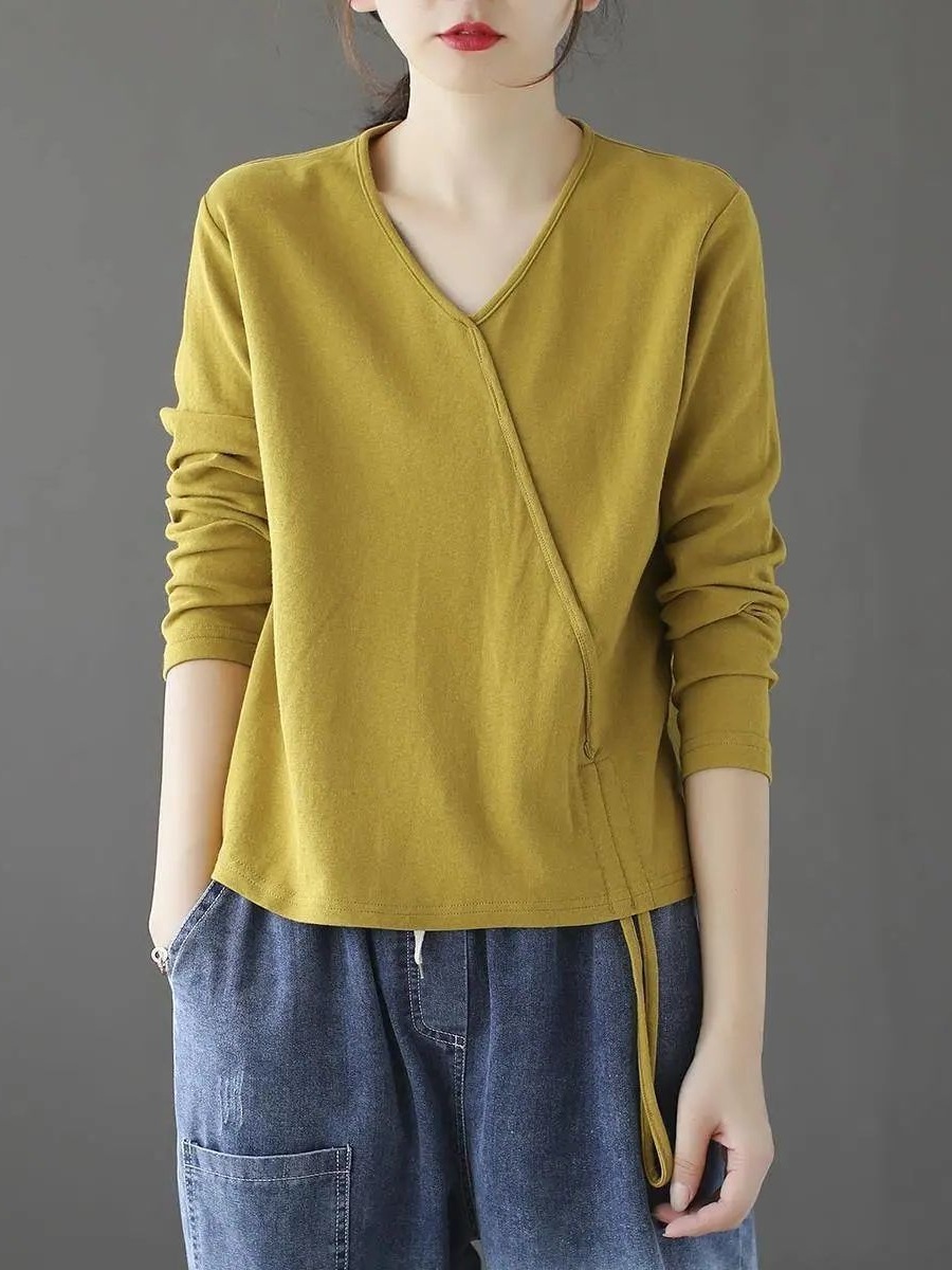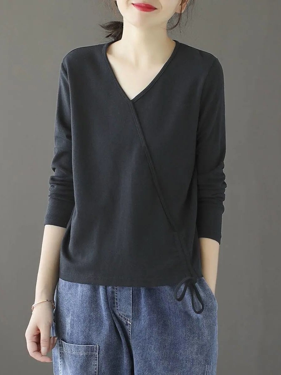 Главная страница > Весной и осенью универсальная Повседневная Свободная Винтажная футболка с завязками для полных девушек, женская футболка с V-образным вырезом, большие размеры, нижняя рубашка с длинным рукавом, женская