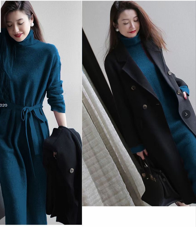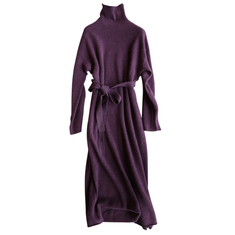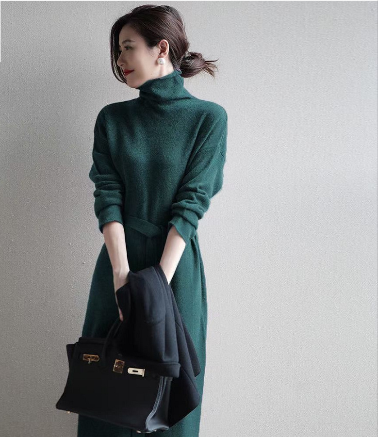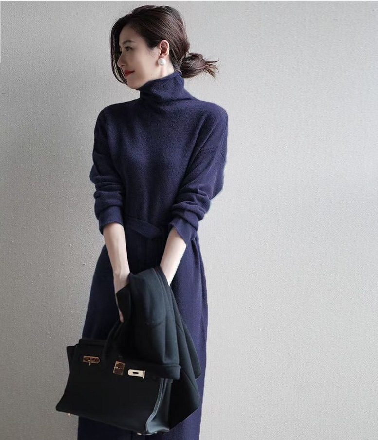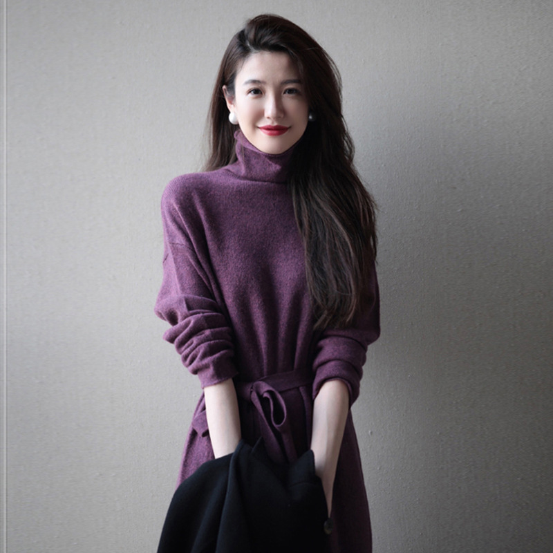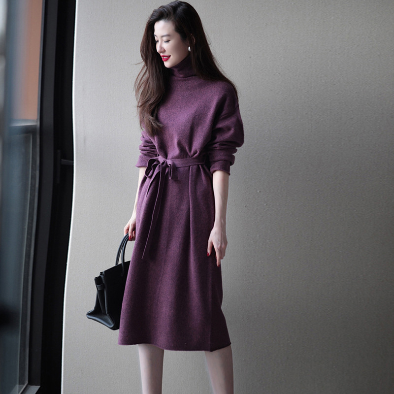Главная страница > Новое осенне-зимнее однотонное платье-водолазка с короткими рукавами в корейском стиле для женщин, универсальный женский свитер средней длины со шнуровкой.