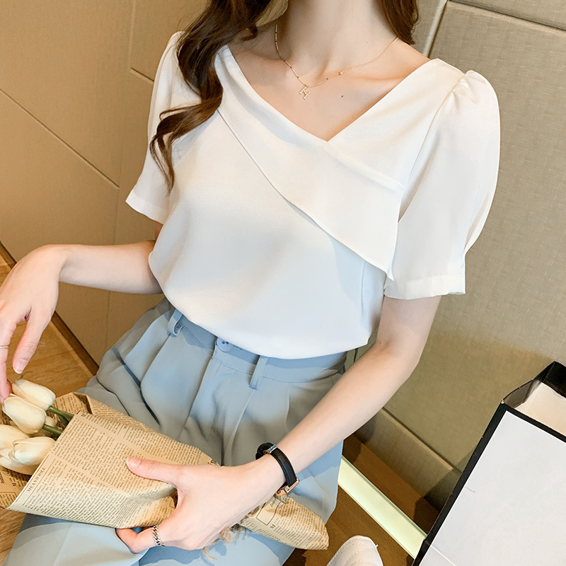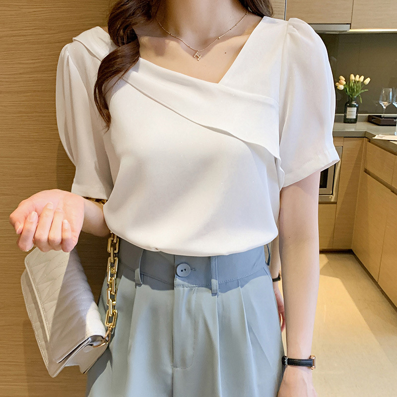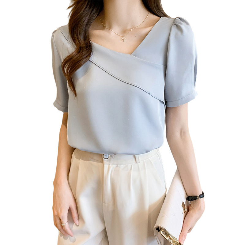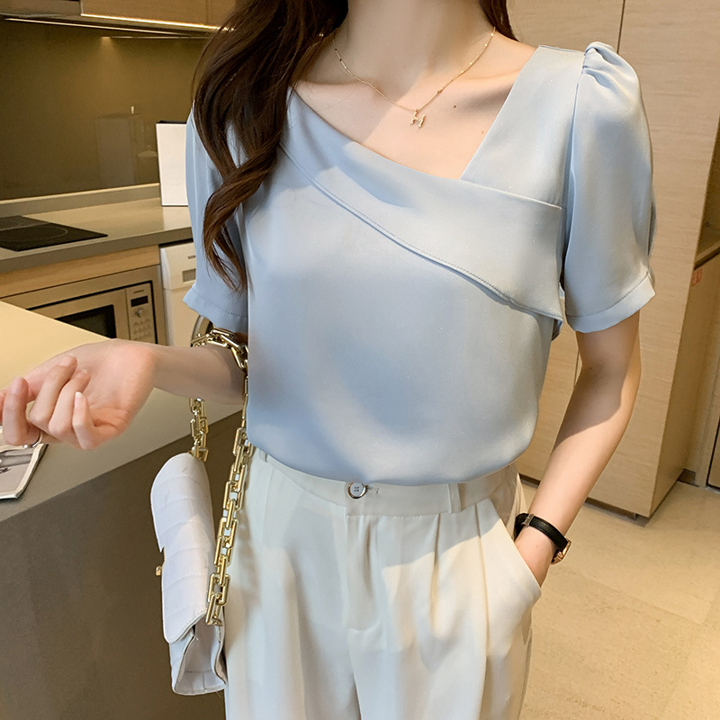 Главная страница > Спотовая съемка 2025 года Новый корейский дикий диагональный воротник с короткими рукавами модная рубашка женская топ летом