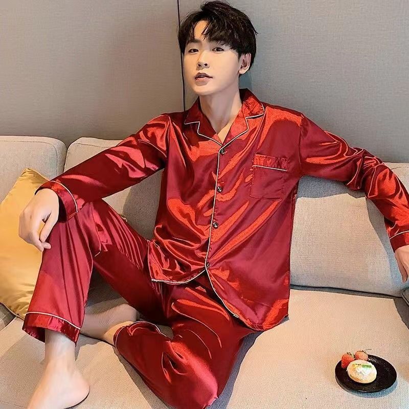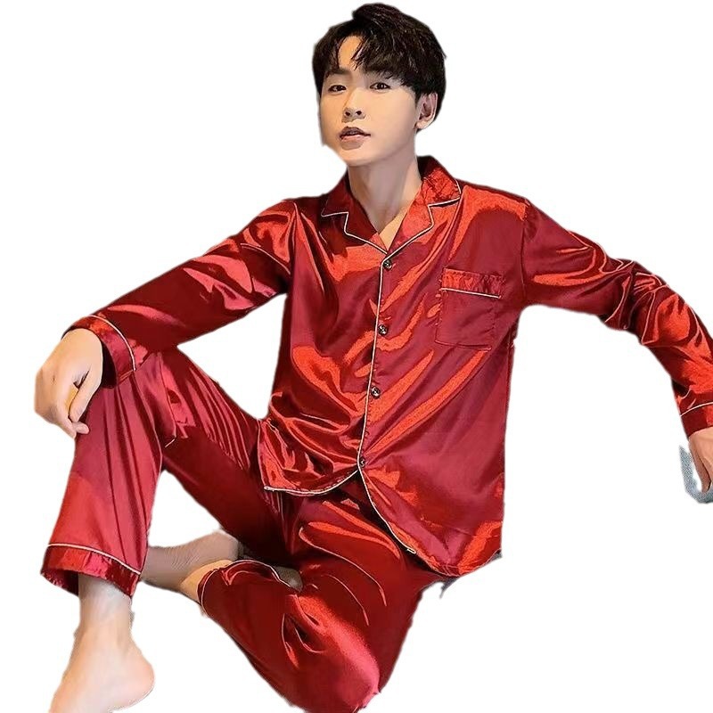 Главная страница > 2025 имитация шелковой пижамы для мужчин летом с длинными рукавами тонкий повседневный домашний костюм брюки весенний лед шелковый набор из двух частей