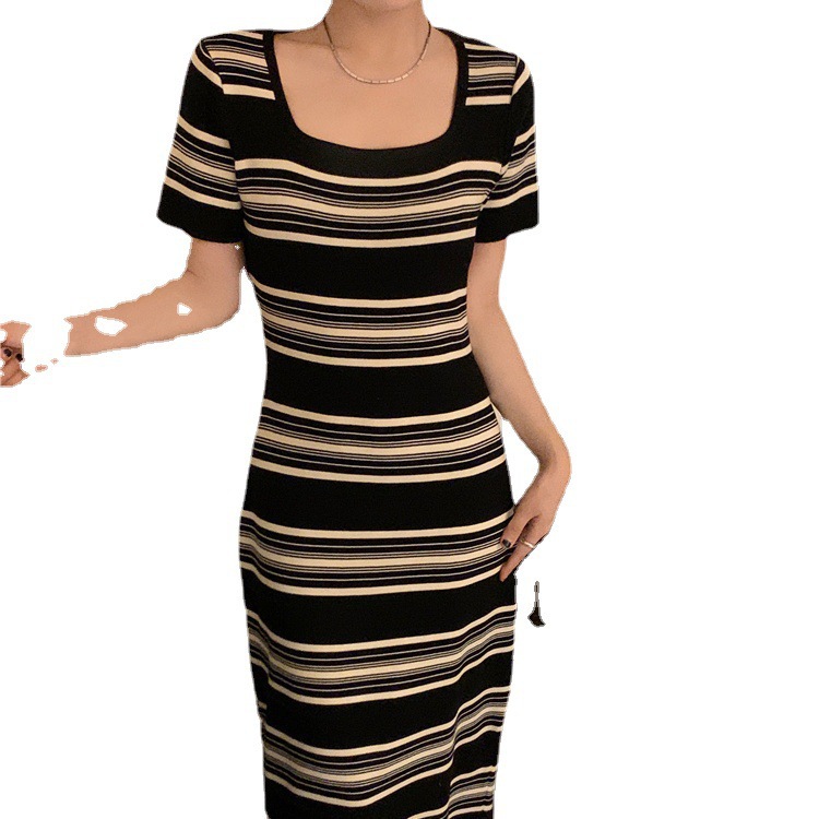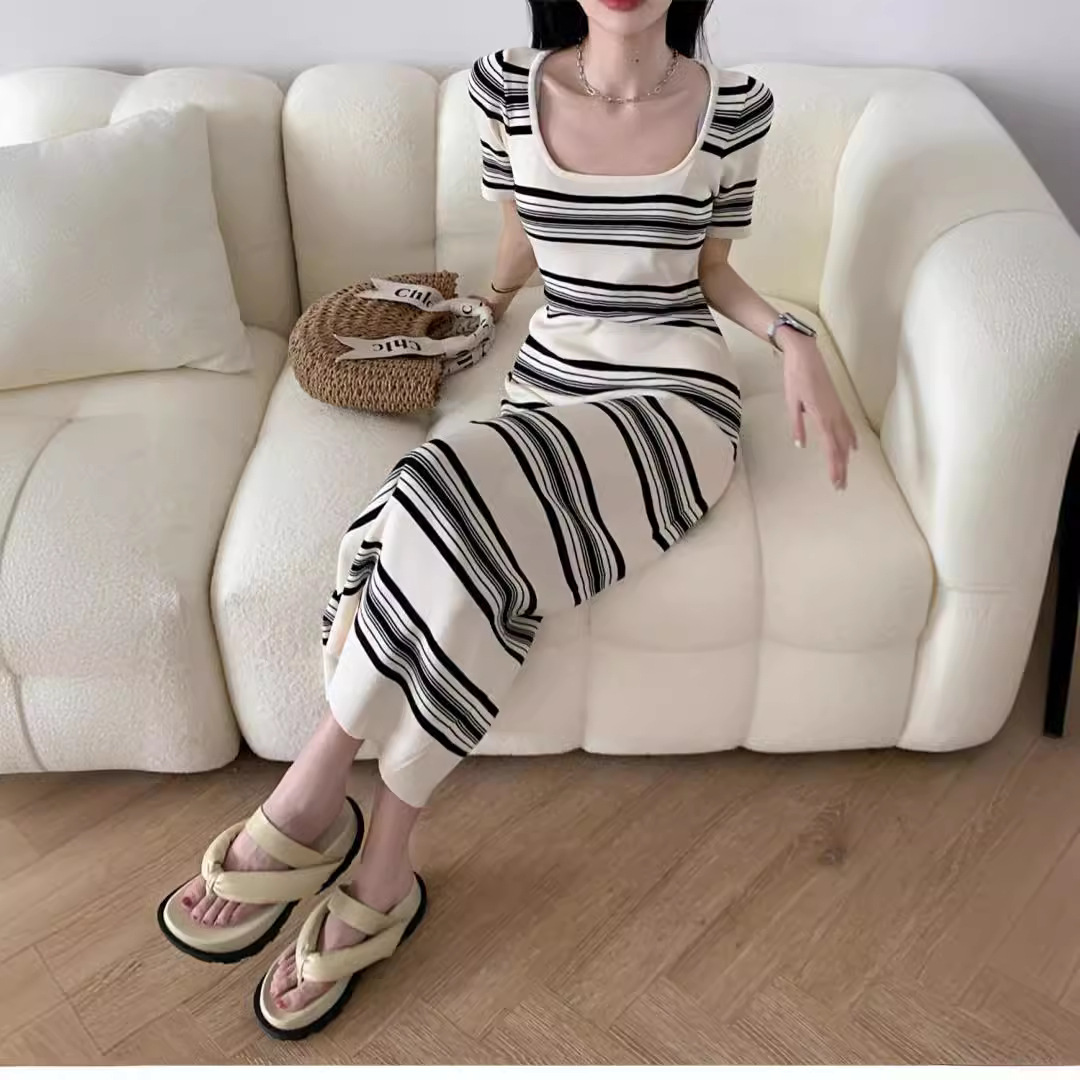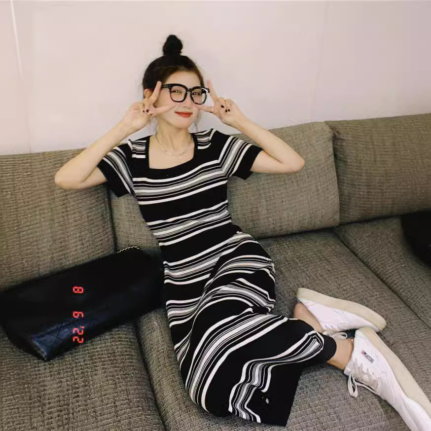 Трикотажное платье в полоску с короткими рукавами женское лето 2024 новый корейский ленивый ветер носить юбки средней и длинной одежды in