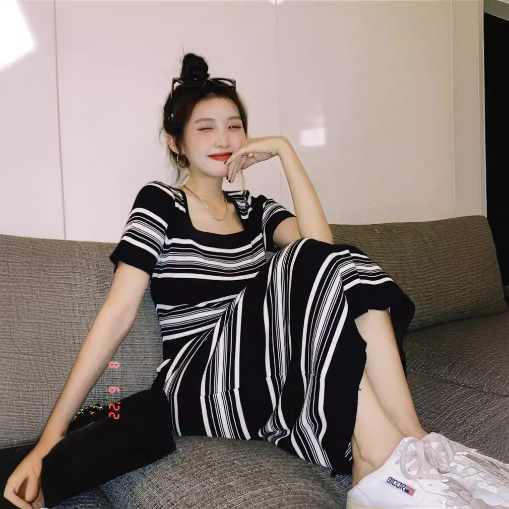 Главная страница > Трикотажное платье в полоску с короткими рукавами женское лето 2024 новый корейский ленивый ветер носить юбки средней и длинной одежды in