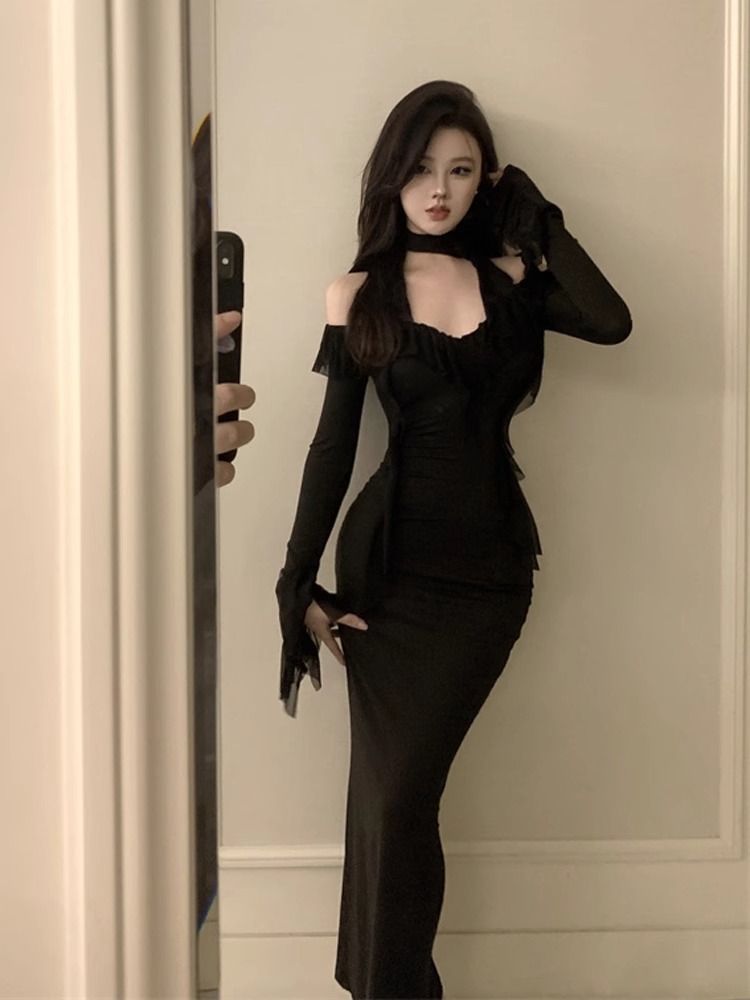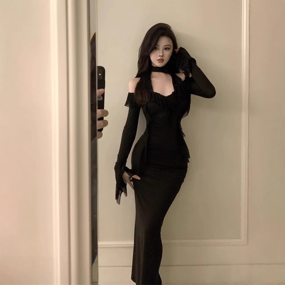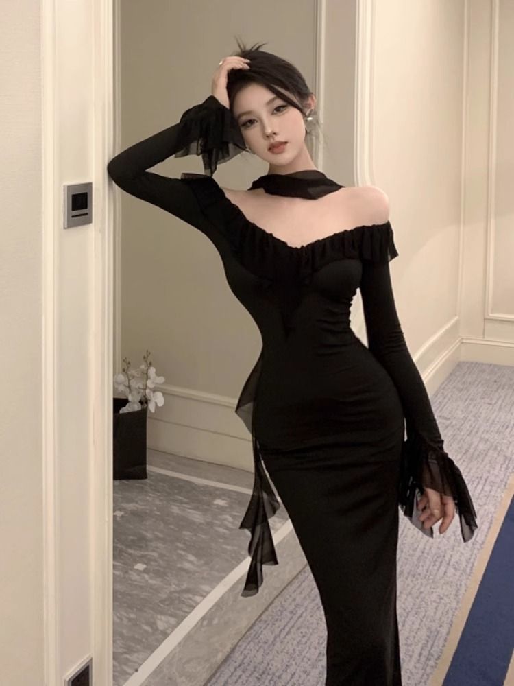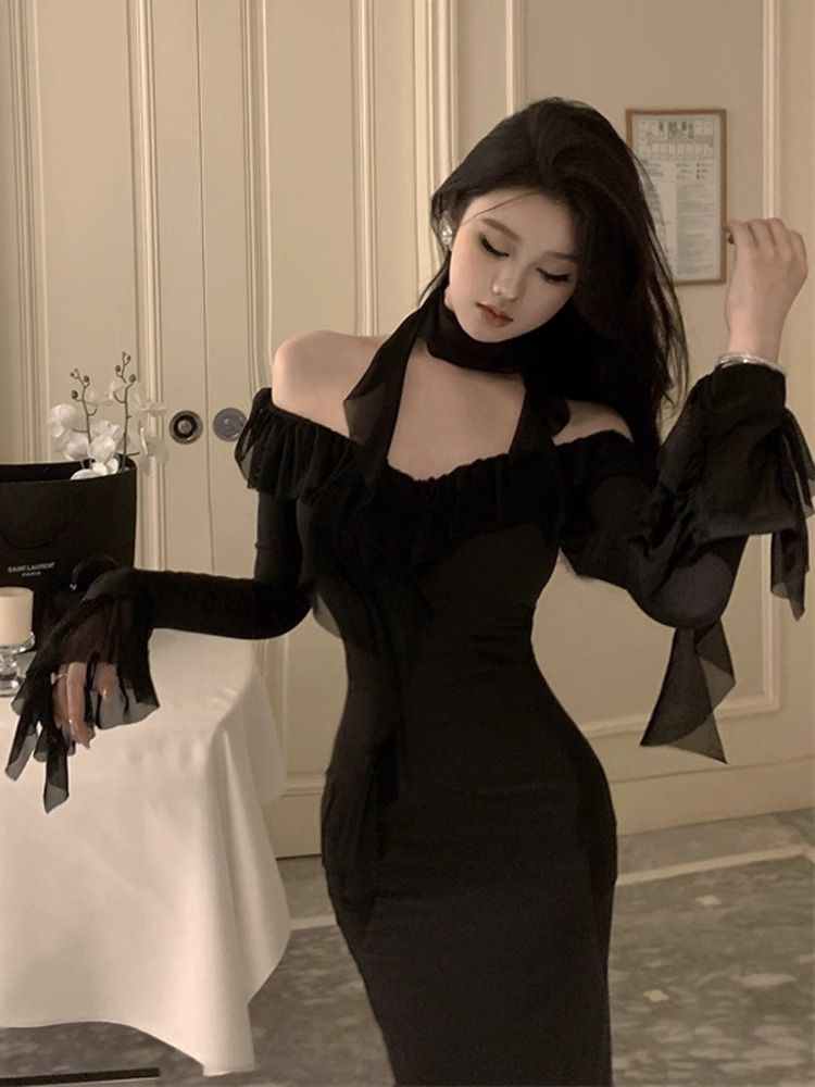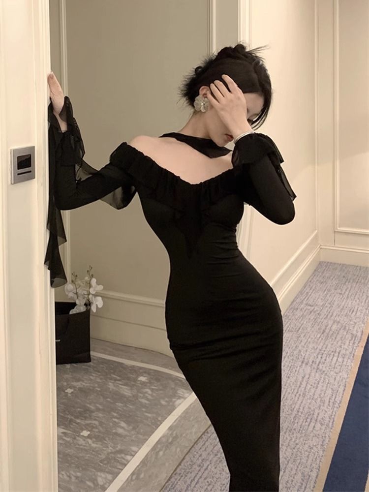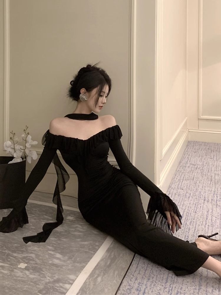 Главная страница > 2024 новый стиль французского стиля Хепберн стиль черное платье на плечо женское весеннее и осеннее платье средней и длинной