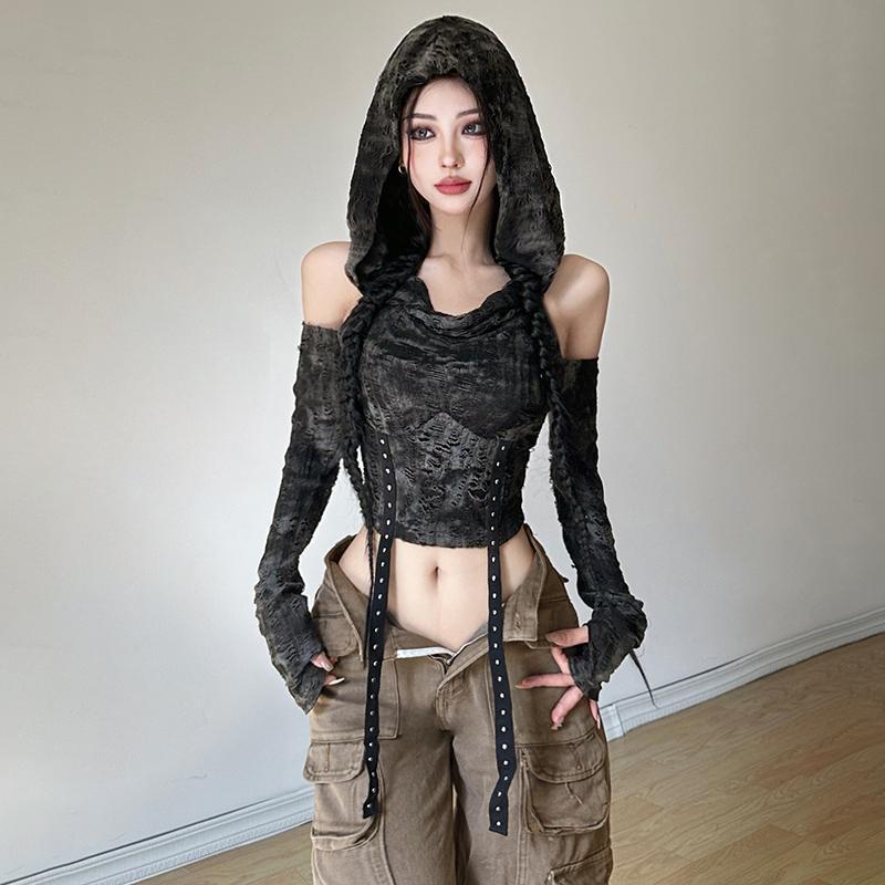 Чистая желанность y2k горячая девушка с открытыми плечами тонкая с капюшоном футболка с длинными рукавами женская осенний и зимний темперамент дикий черный топ