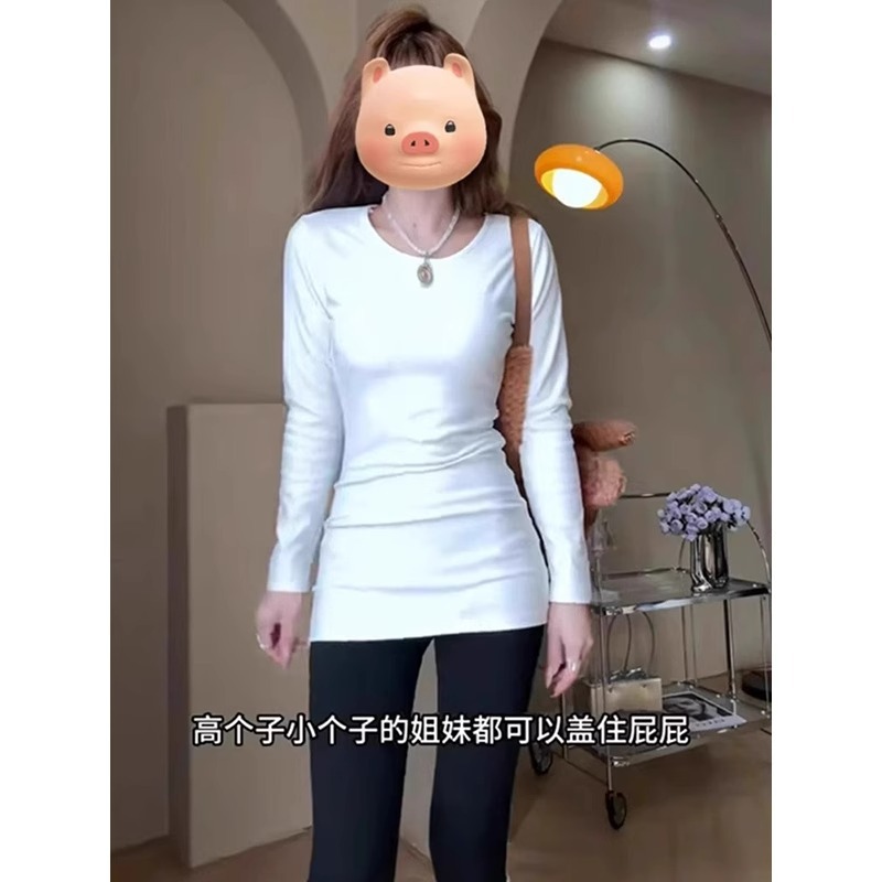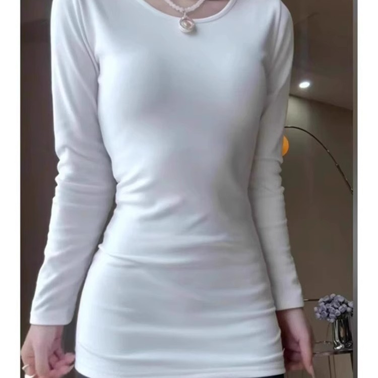 Главная страница > Белая нижняя рубашка средней длины для женщин весной, однотонная, стройнящая и очень красивая футболка с длинными рукавами и талией.