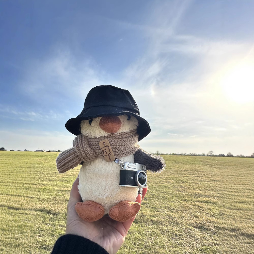 Черная шапка, шарф, камера, пингвин
