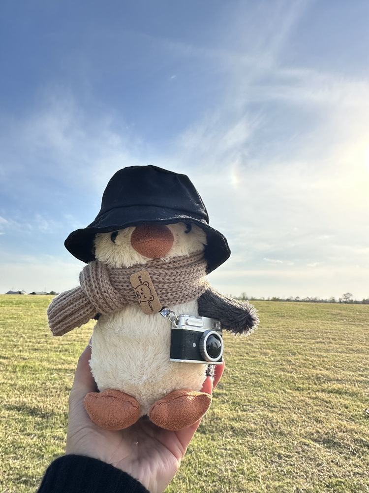 Синяя шапка, шарф, камера, пингвин