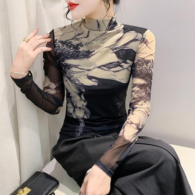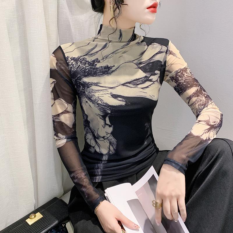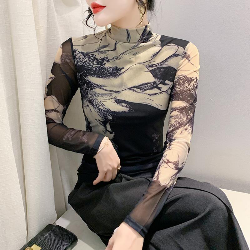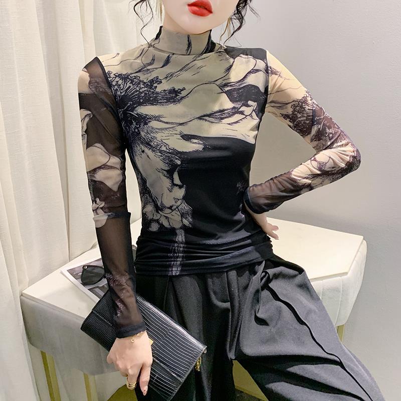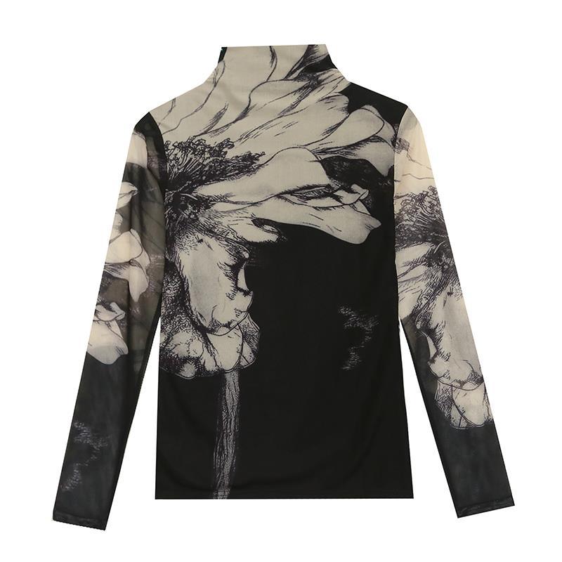 Главная страница > Европейские товары женская одежда 2023 осенне-зимняя мода в западном стиле Сетчатая футболка с длинными рукавами и высоким воротником Женская Цветочная футболка с цветочным принтом Топ Real shot