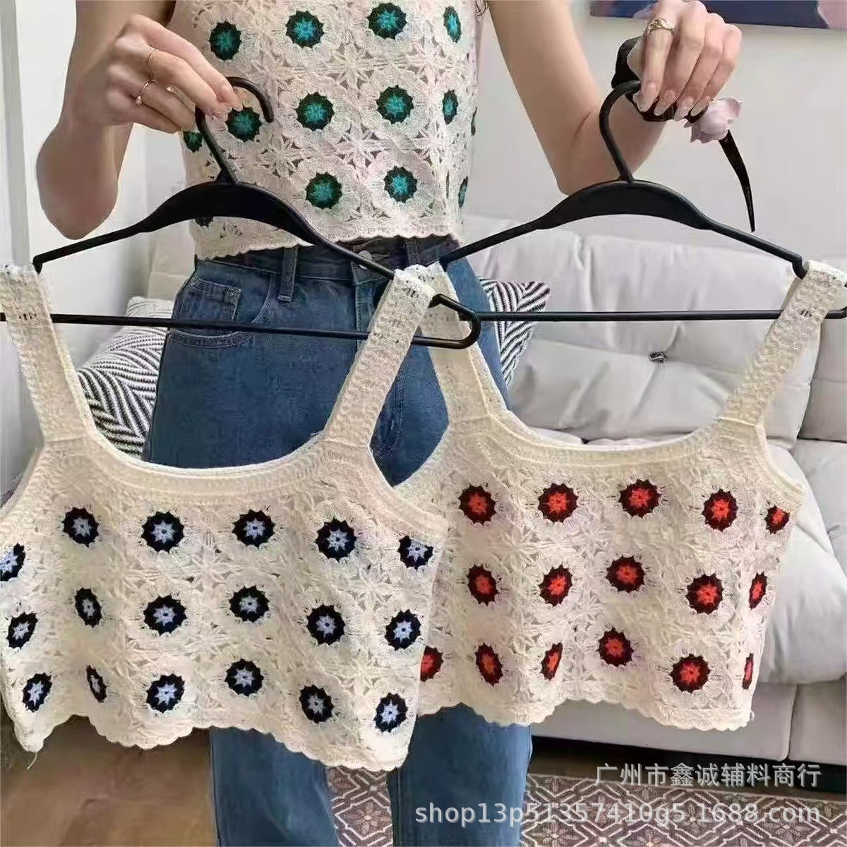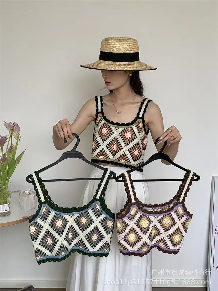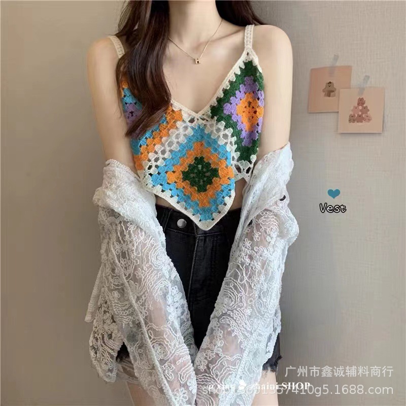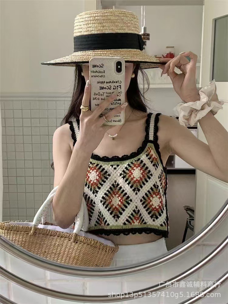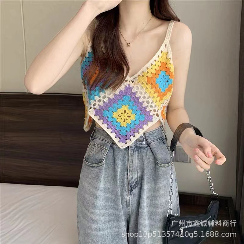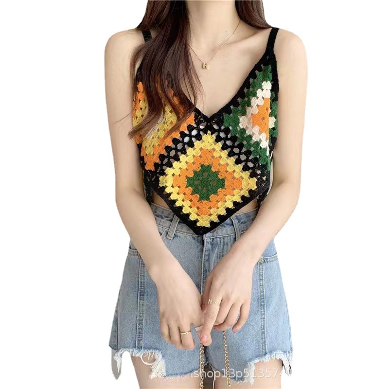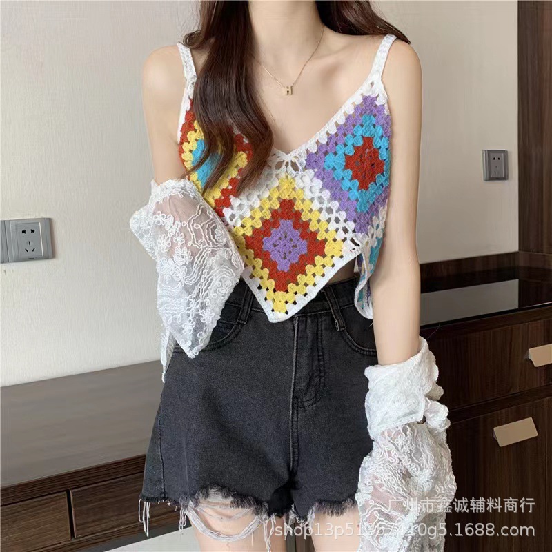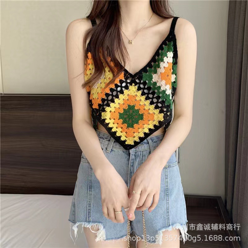 Главная страница > Трансграничный европейский и американский Контрастный ЦВЕТНОЙ слинг с вышивкой, женский сексуальный вышитый полый ромб, универсальный короткий жилет, Внешний Топ