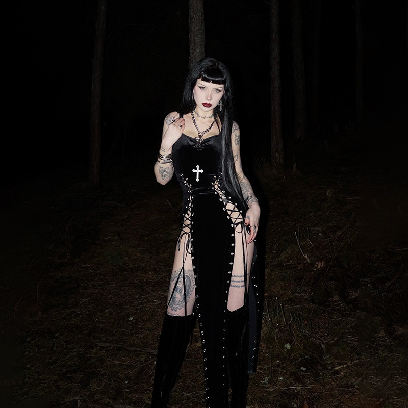 Главная страница > CF25095 темное готическое платье с высоким разрезом и бретельками, новинка 2025 года, тонкая сексуальная юбка для женщин