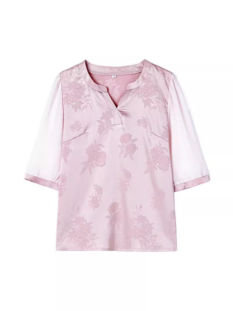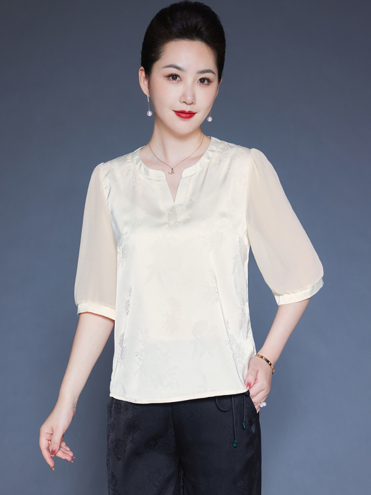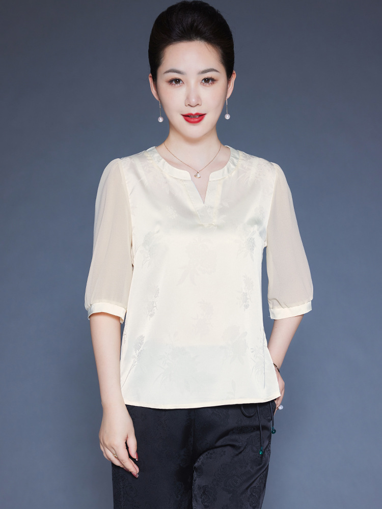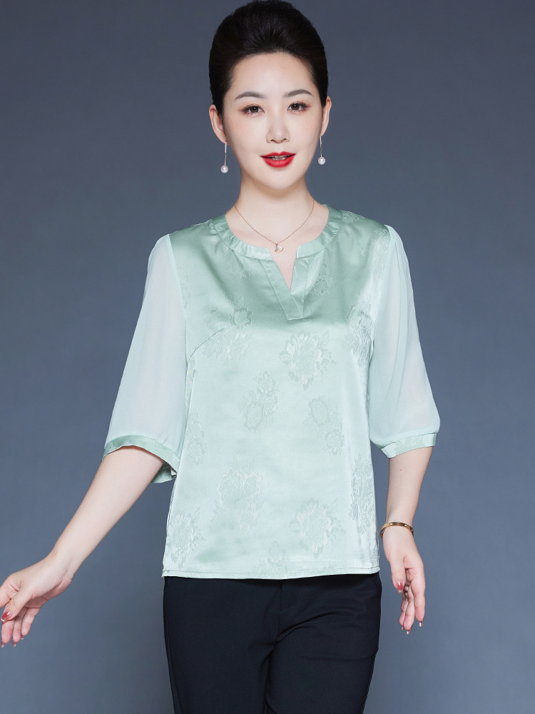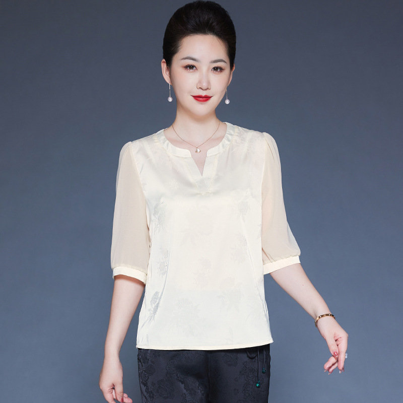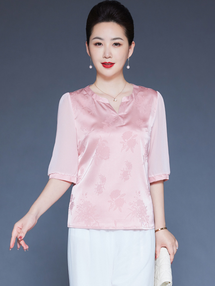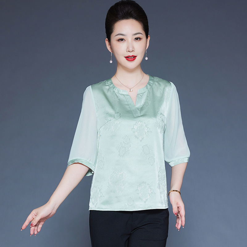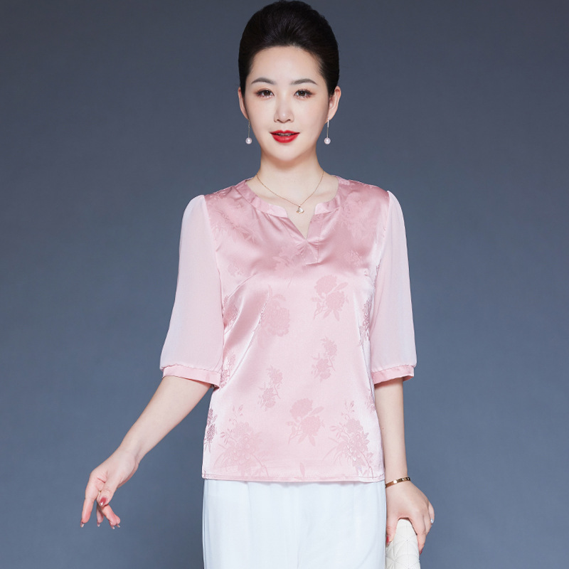 Главная страница > Мама Летний шелковый топ высокого класса с короткими рукавами с принтом иностранные футболки среднего и пожилого возраста с V-образным вырезом шелковая рубашка