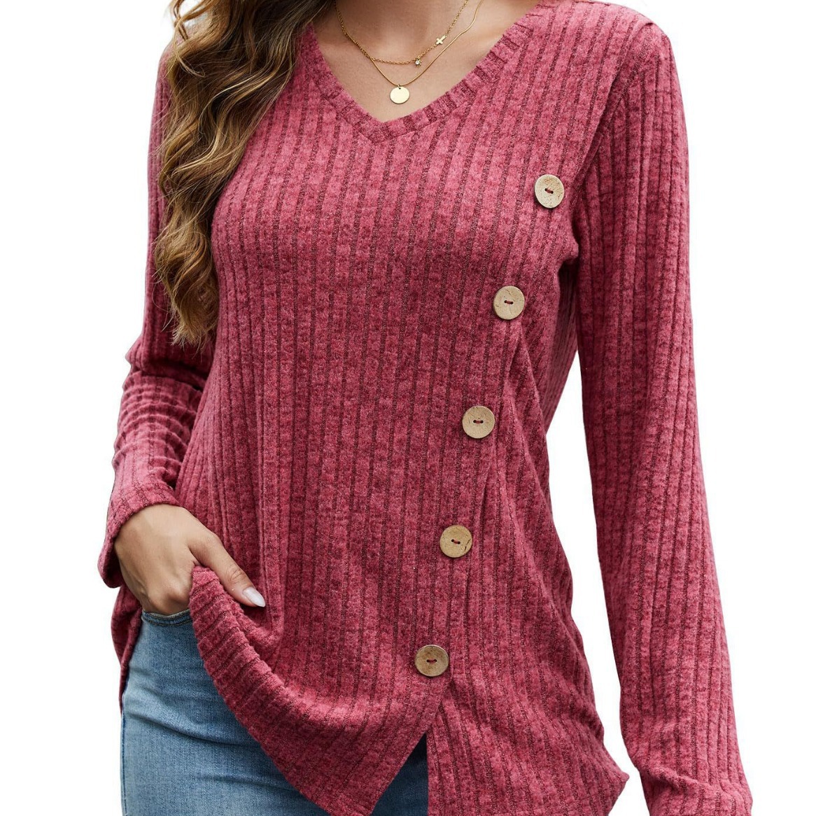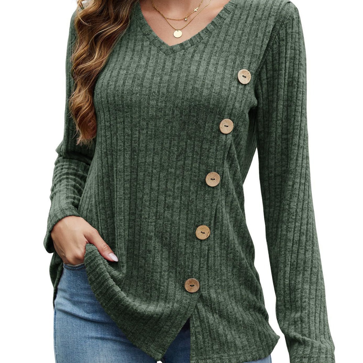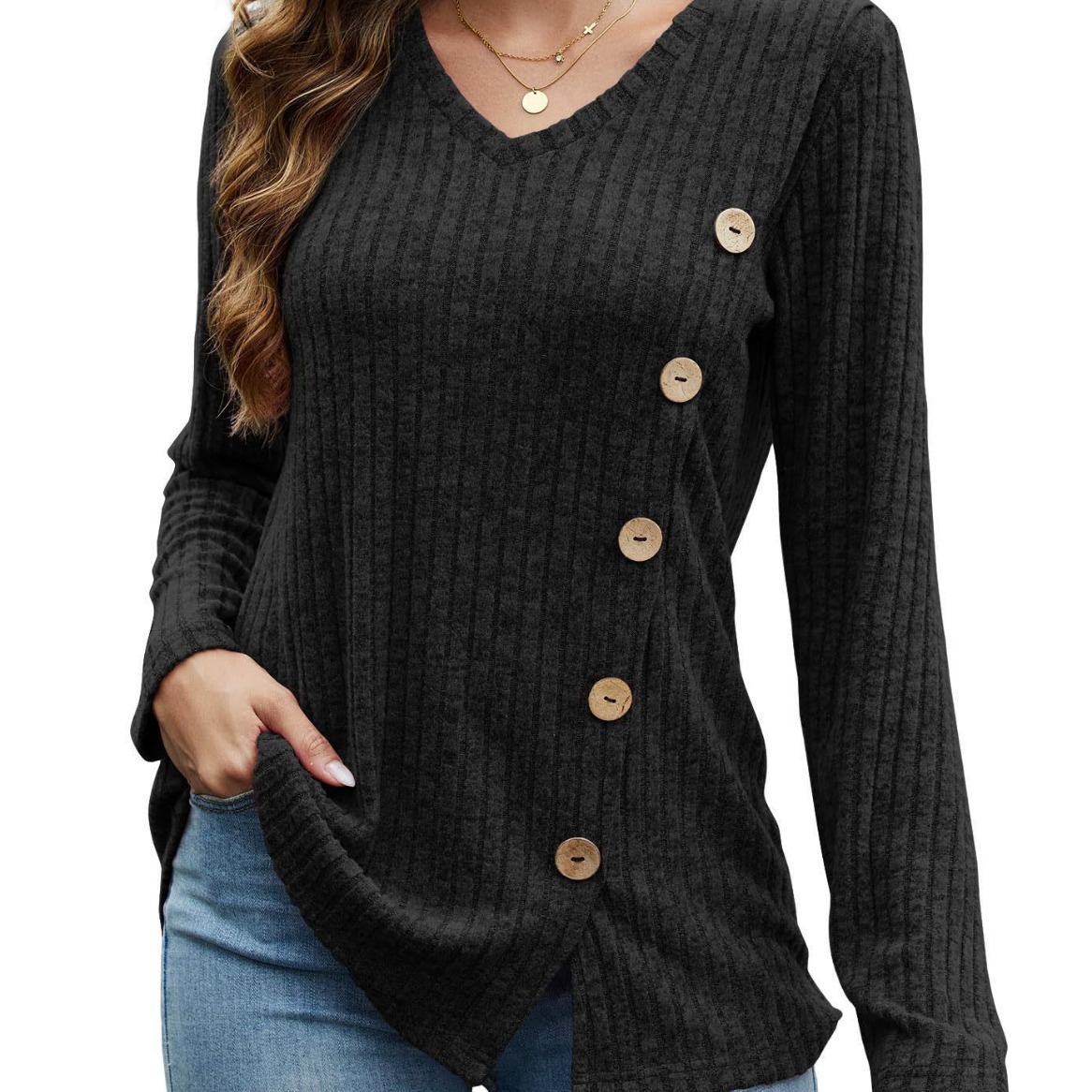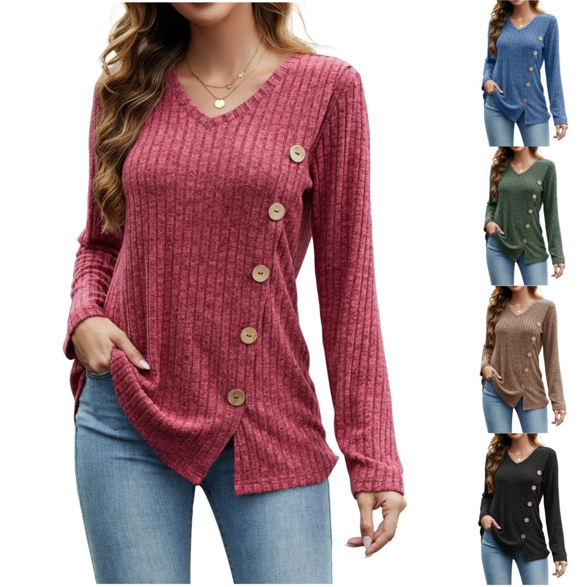 Главная страница > Amazon 2023 Европа и США трансграничная внешняя торговля женская одежда осень-зима новая V-образная пуговица с открытыми вилками свободная футболка с длинными рукавами топ
