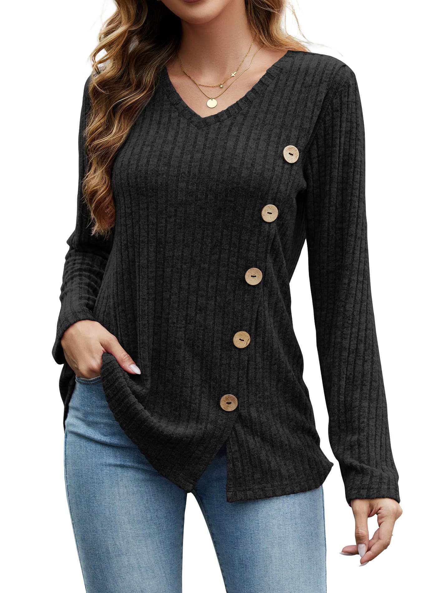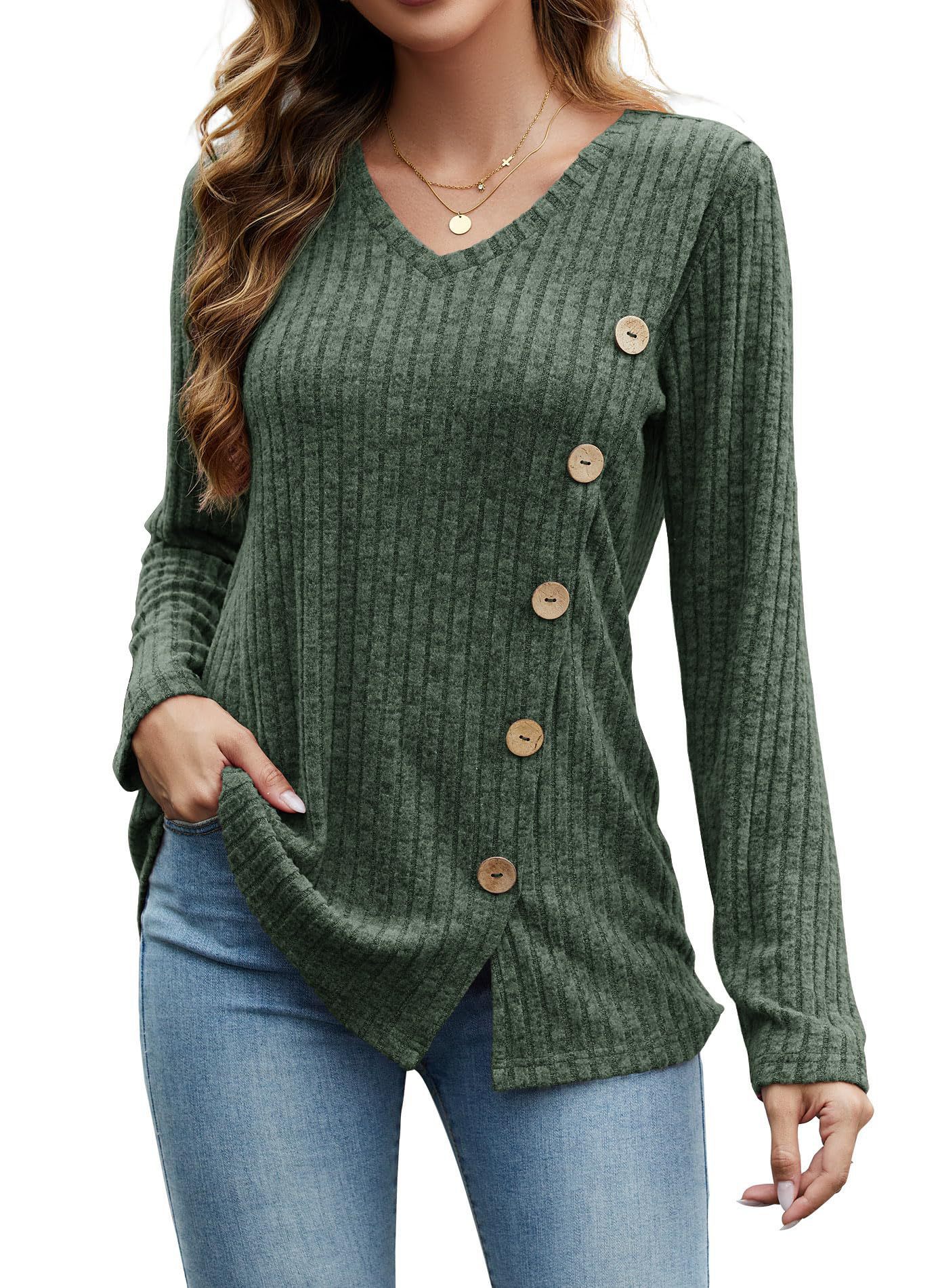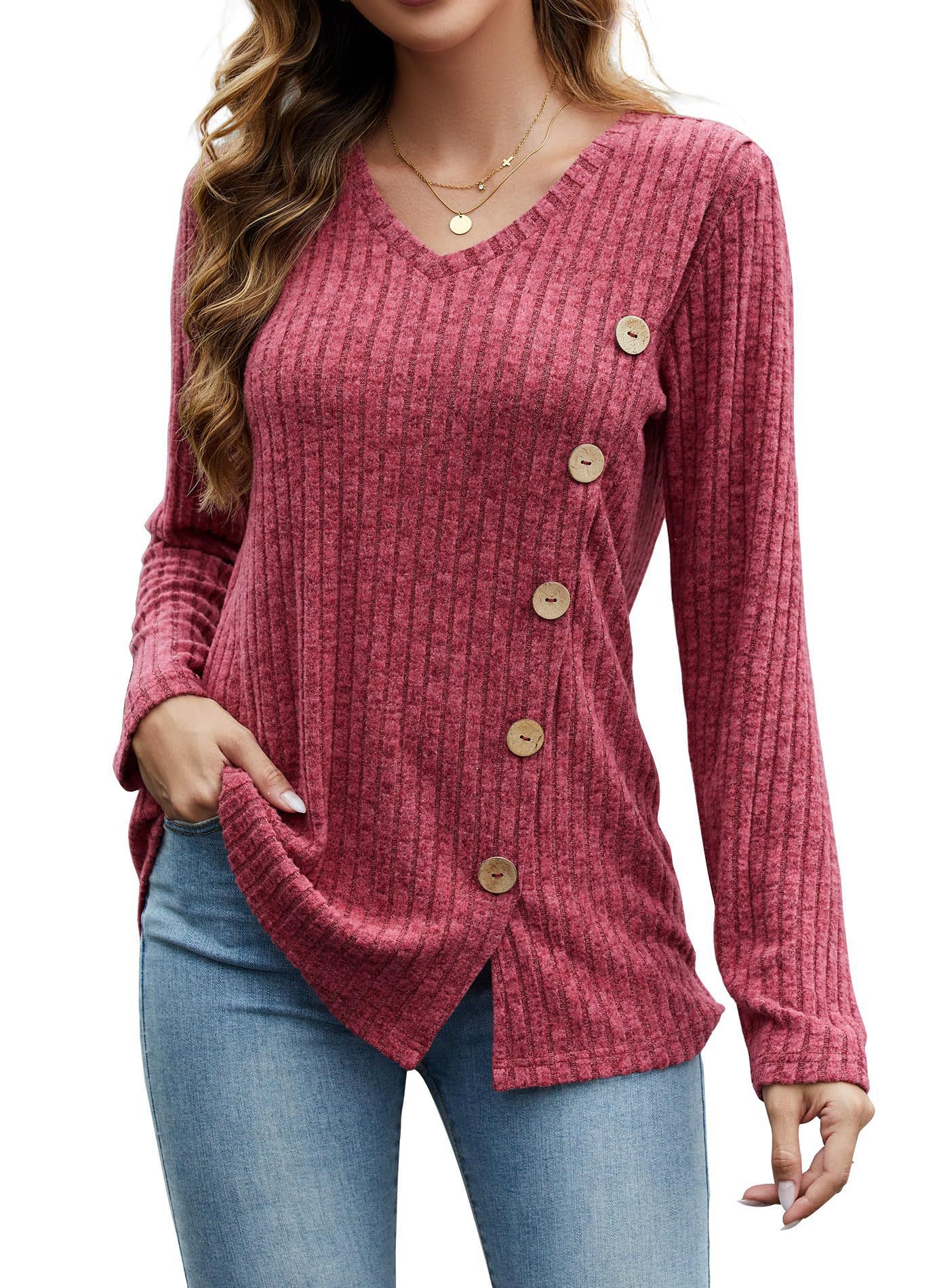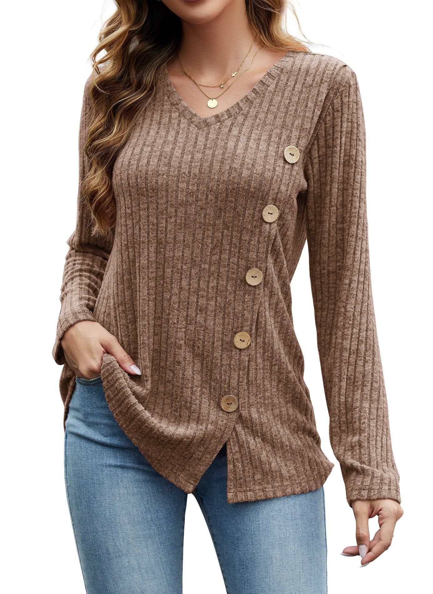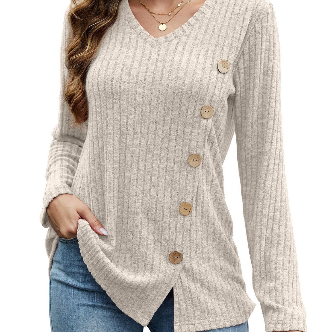 Главная страница > Amazon 2023 Европа и США трансграничная внешняя торговля женская одежда осень-зима новая V-образная пуговица с открытыми вилками свободная футболка с длинными рукавами топ