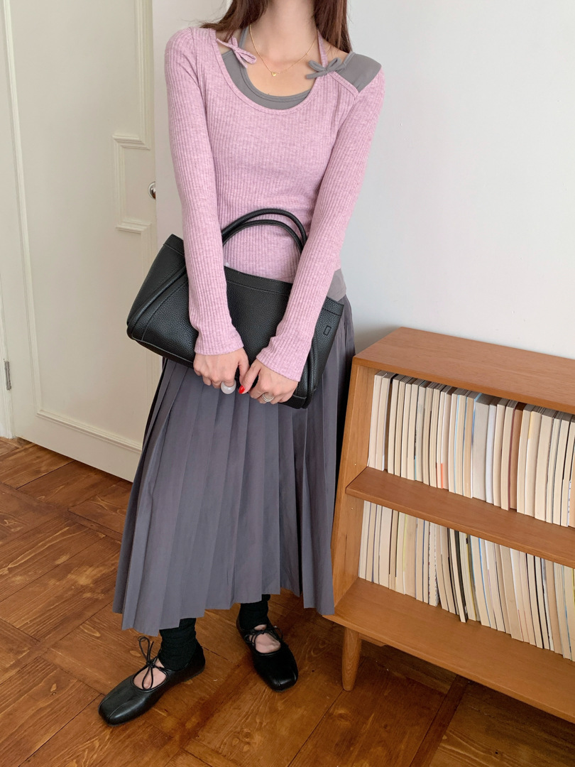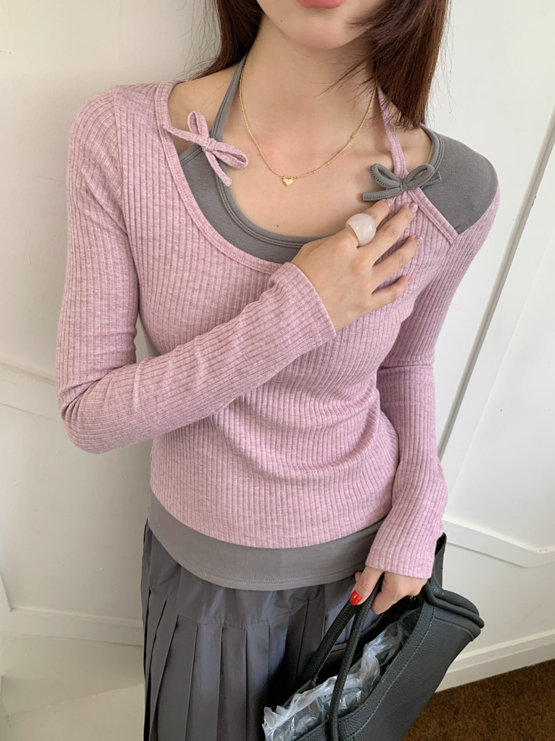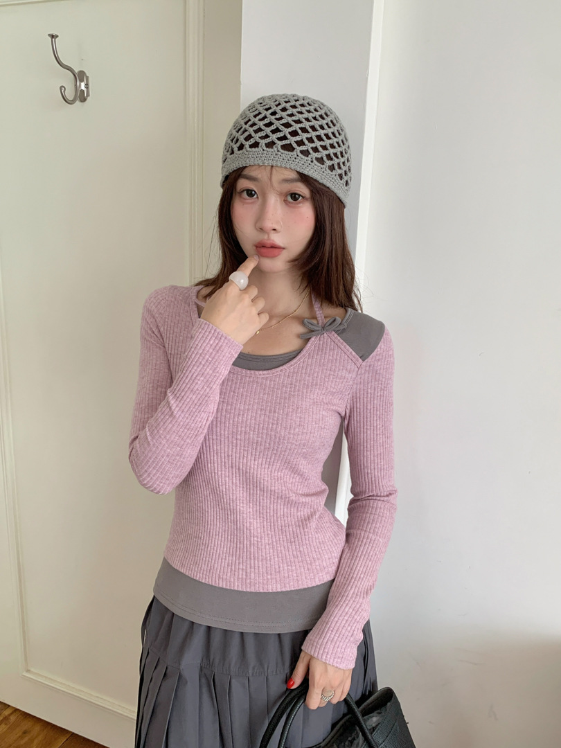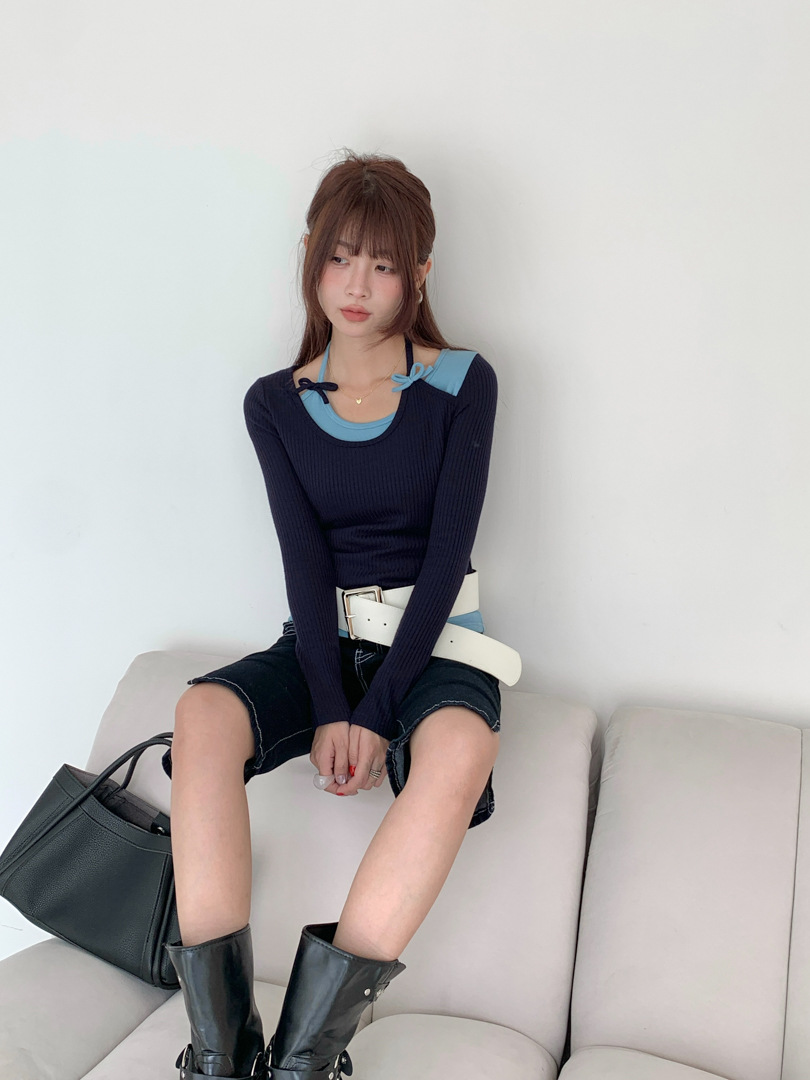 Главная страница > GAGD 设计感假两件拼接挂脖修身显瘦长袖T恤 25秋款针织打底衫女