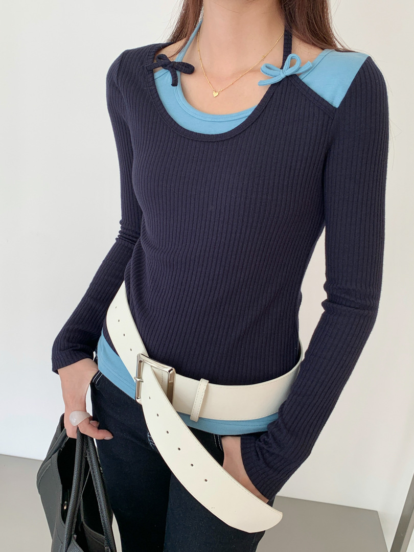 GAGD 设计感假两件拼接挂脖修身显瘦长袖T恤 25秋款针织打底衫女