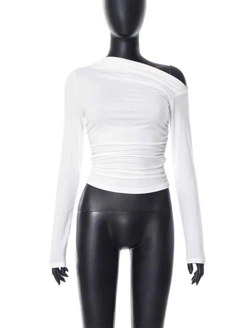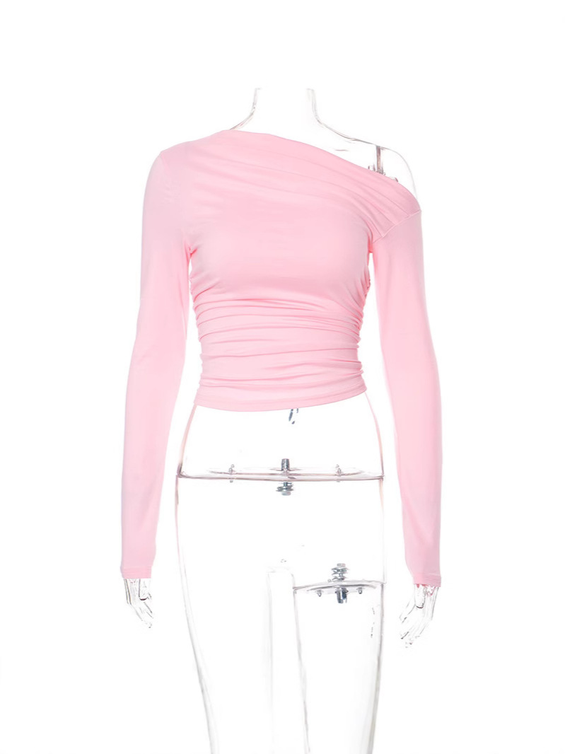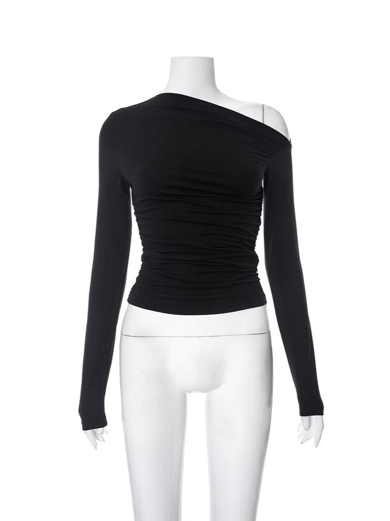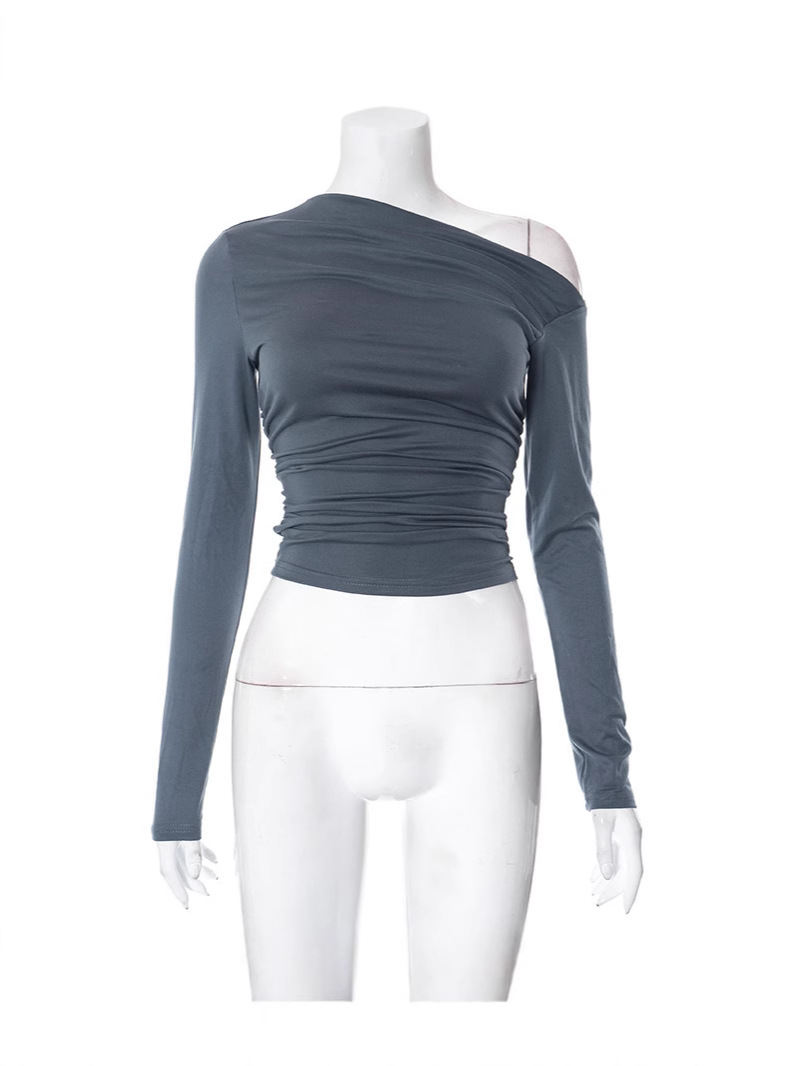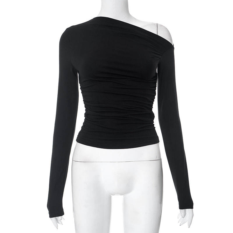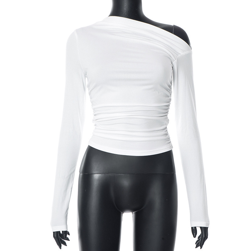 Главная страница > 2025 европейские и американские трансграничные женские весенние новые сплошные сплошные косые плечи с длинными рукавами, плиссированные короткие топы, футболки женские сплошные