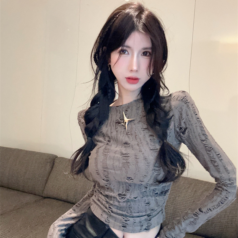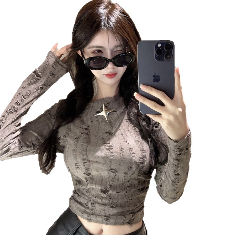 Главная страница > 2025 Весна и осень Новая горячая женская одежда в европейском и американском стиле Pure Desire Slim Fit Navel Street fashion Футболка с длинным рукавом и круглым вырезом для женщин