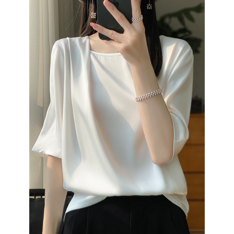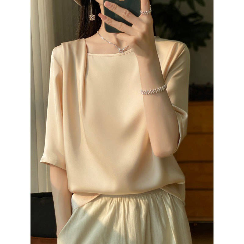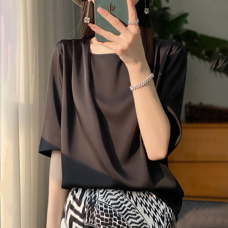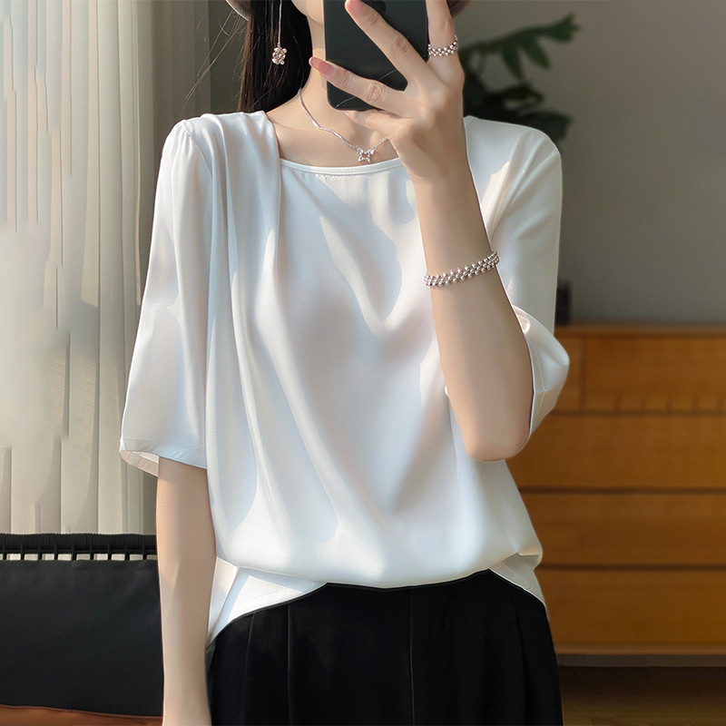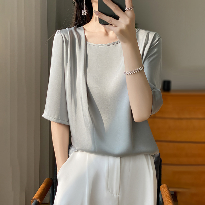 Ацетатная футболка с искусственными шелками для женщин с короткими рукавами и тонким нерегулярным наклонным плечевым воротником
