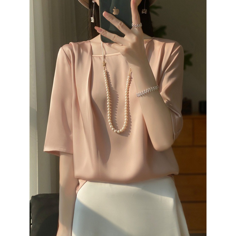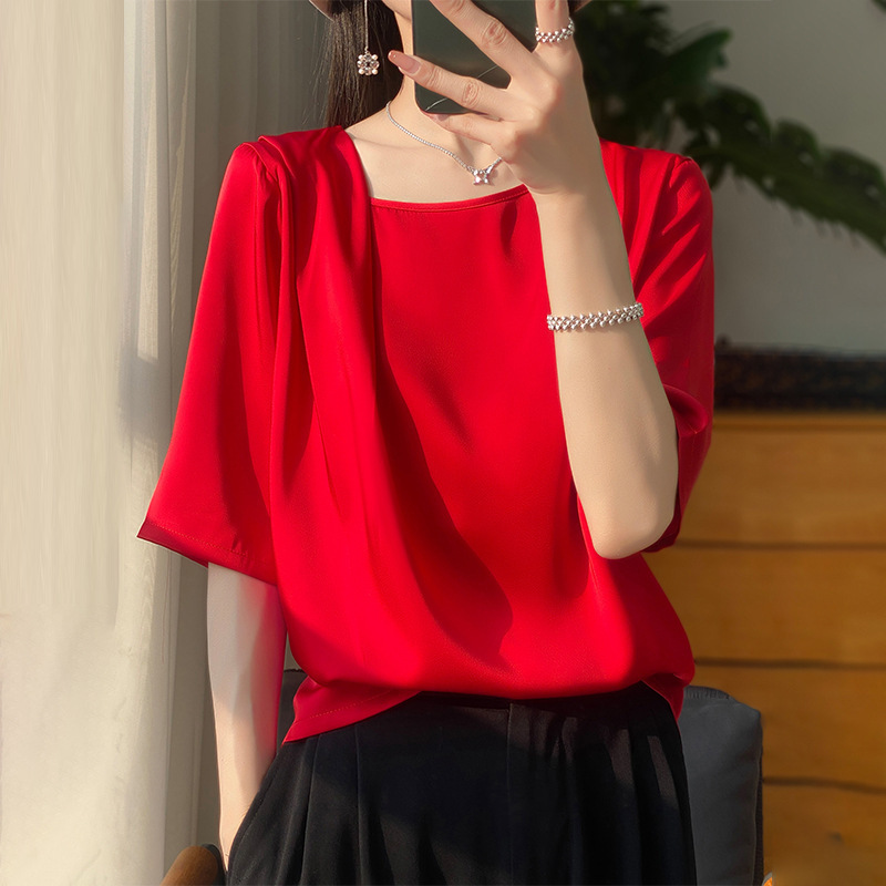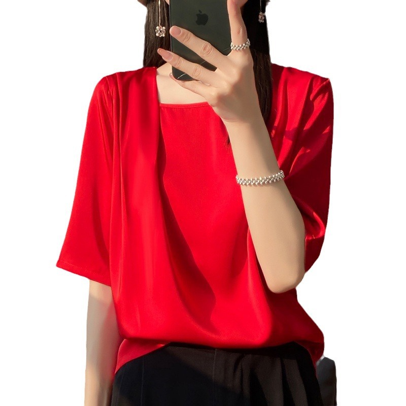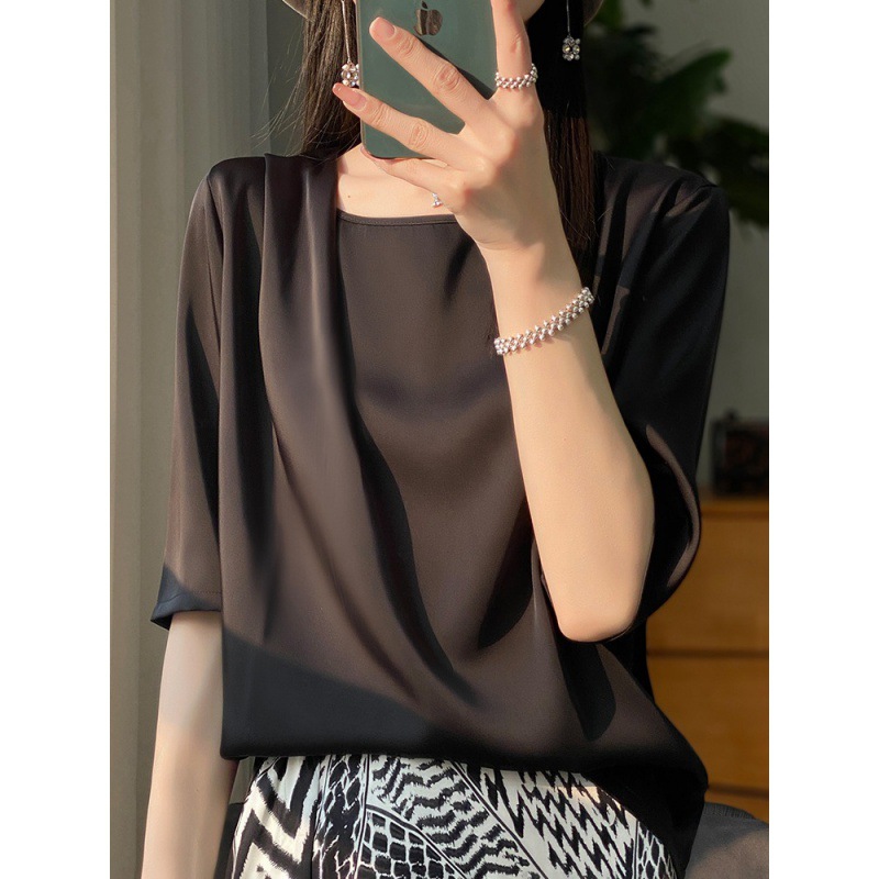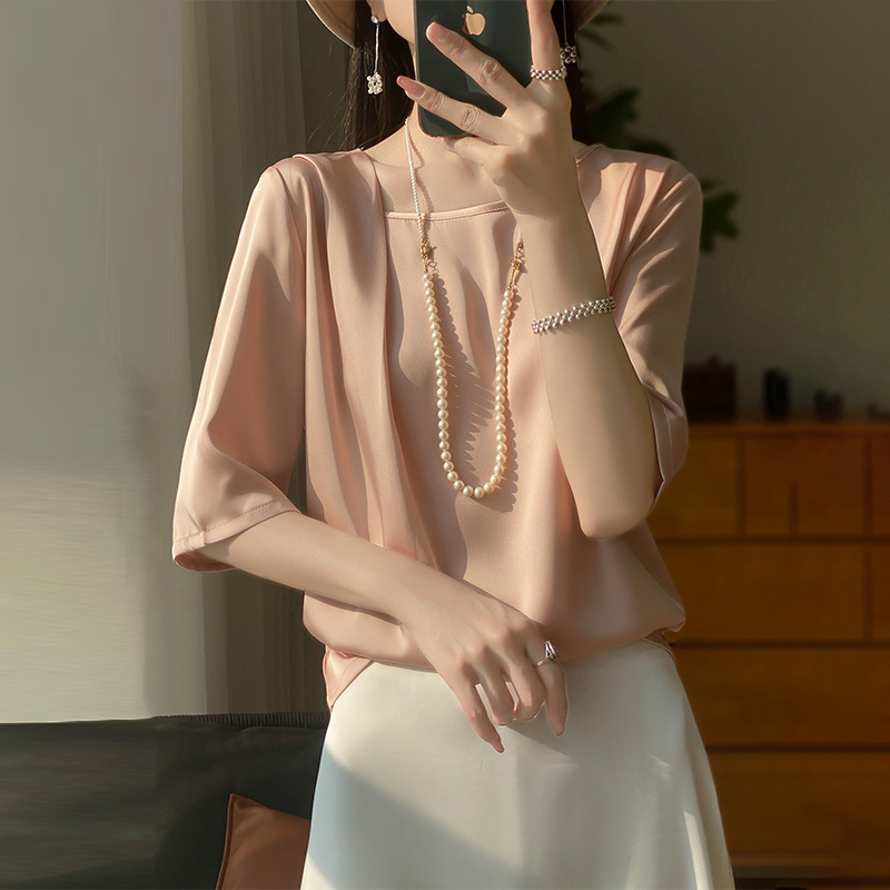 Ацетатная футболка с искусственными шелками для женщин с короткими рукавами и тонким нерегулярным наклонным плечевым воротником