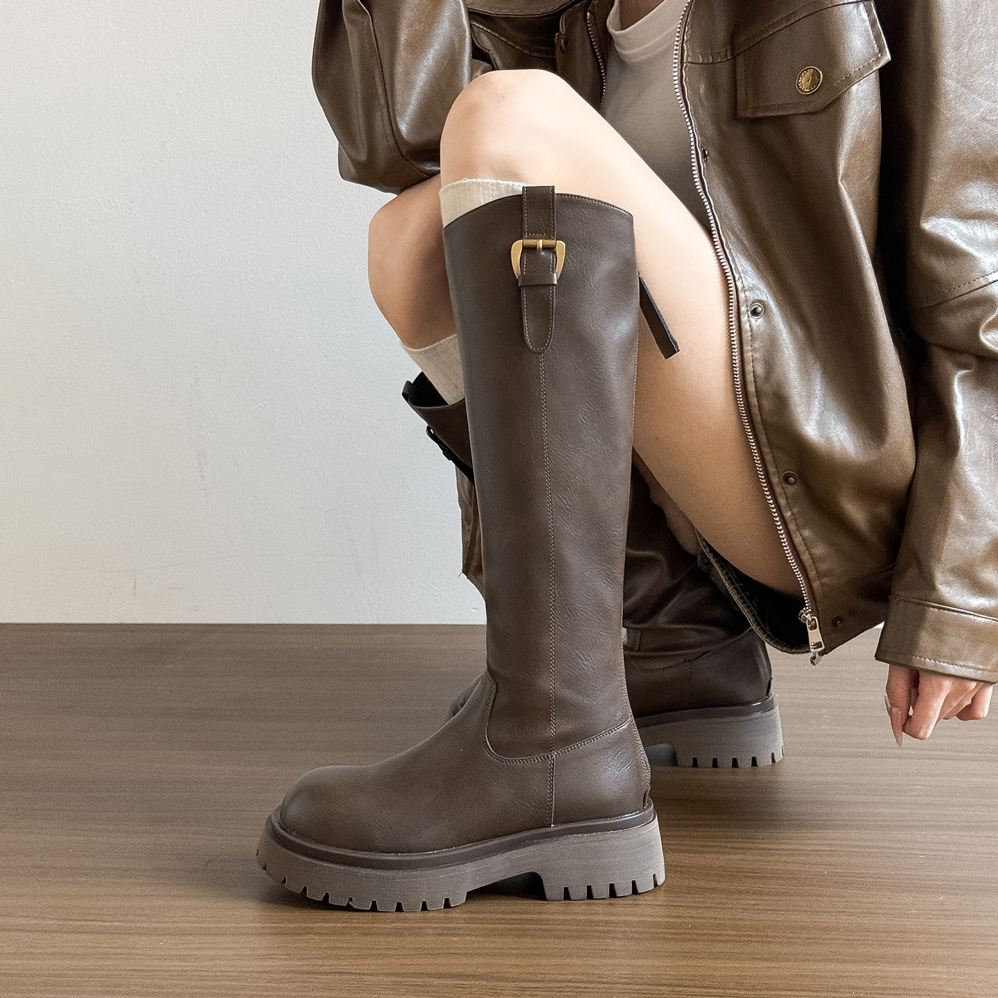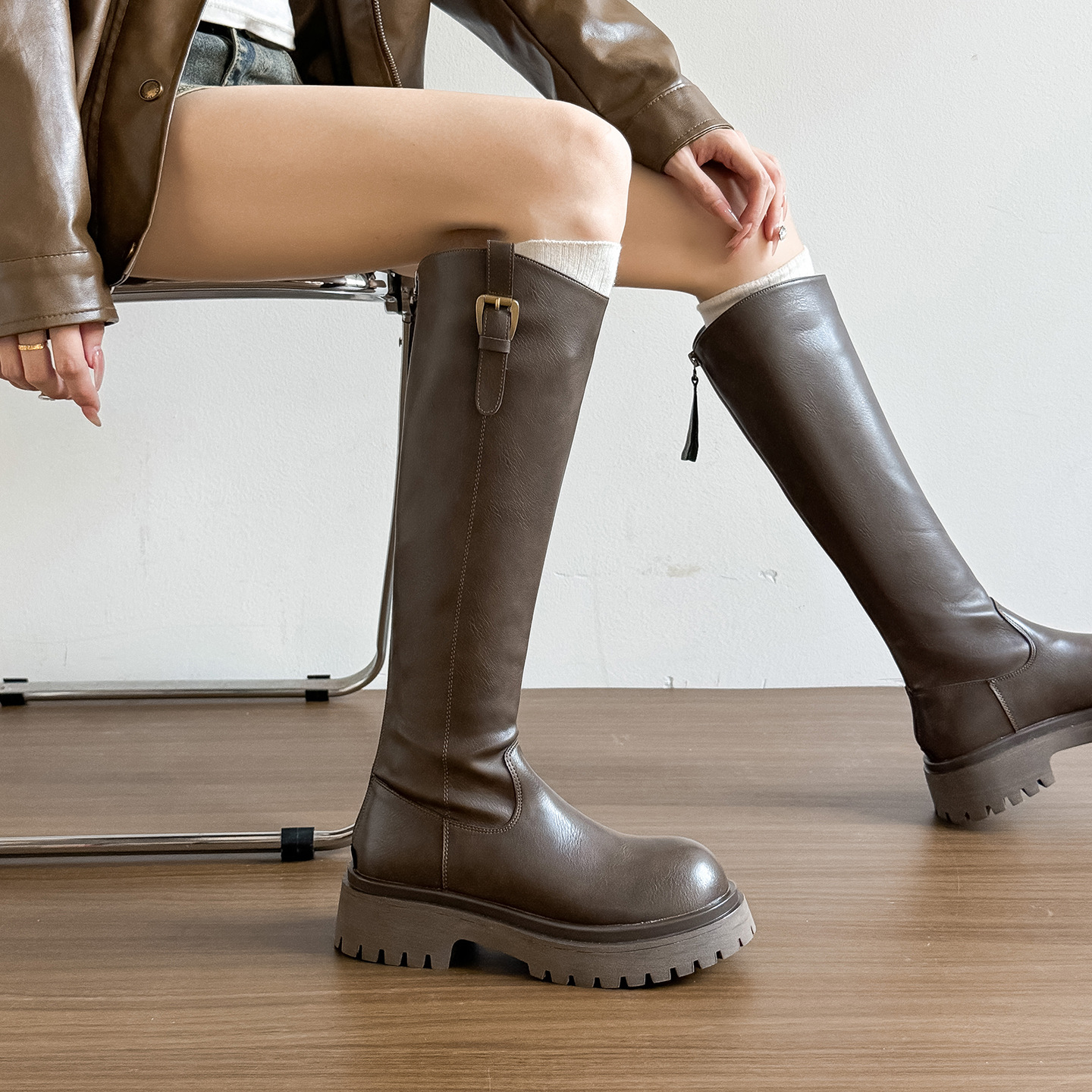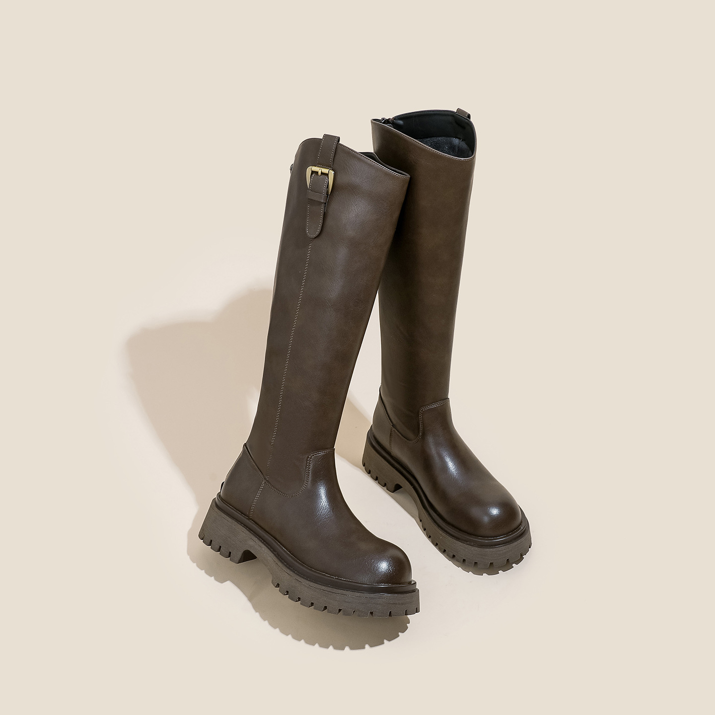 Главная страница > Женские ботинки-сапоги на толстой подошве, осень-зима 2025, высокие до колена, с тонкой пряжкой, красивые коричневые.