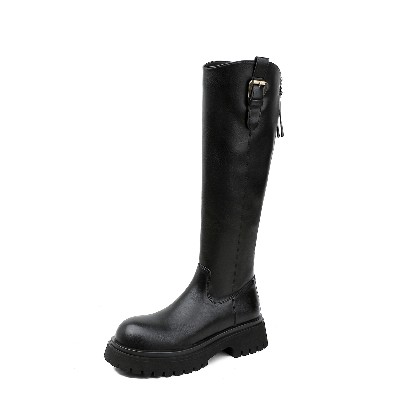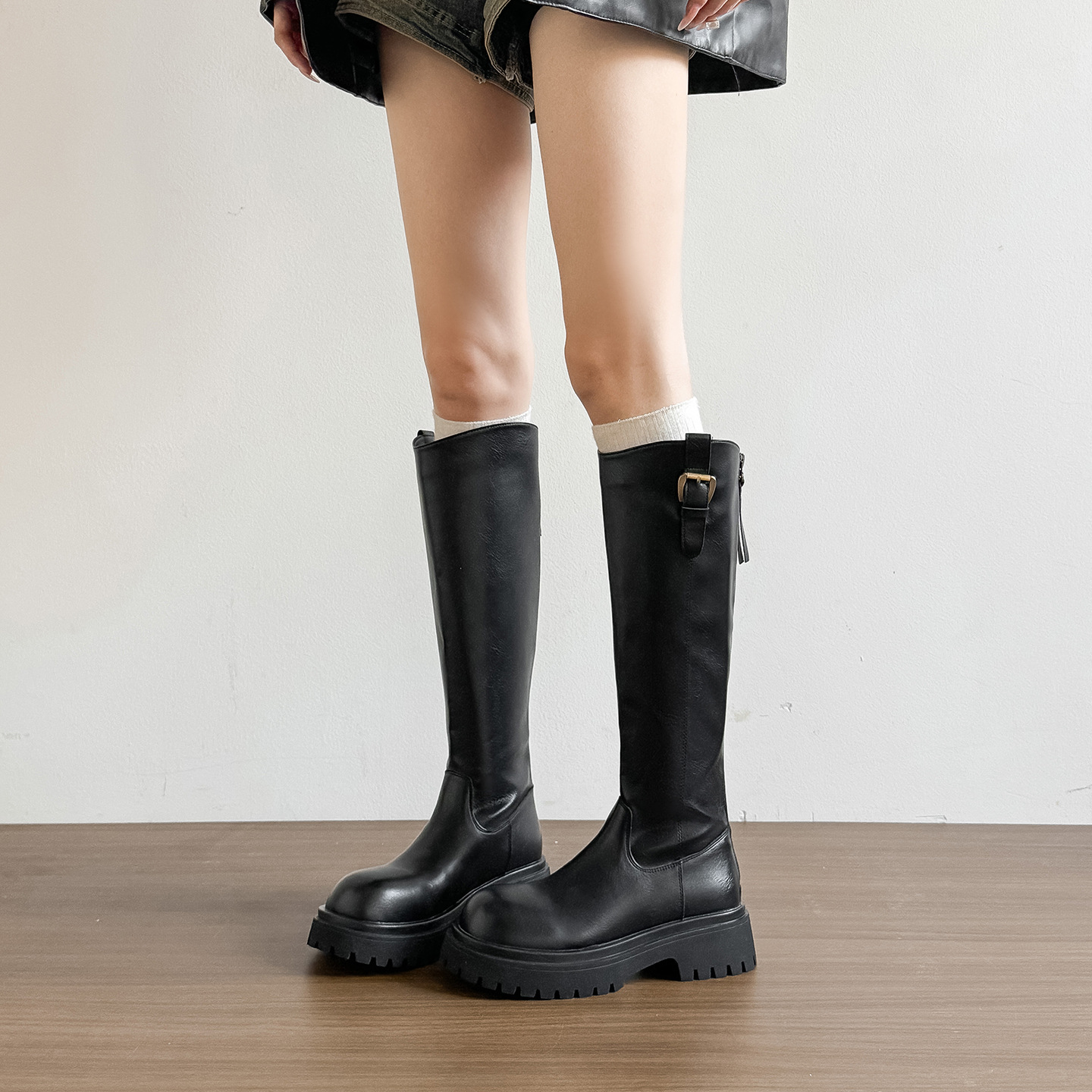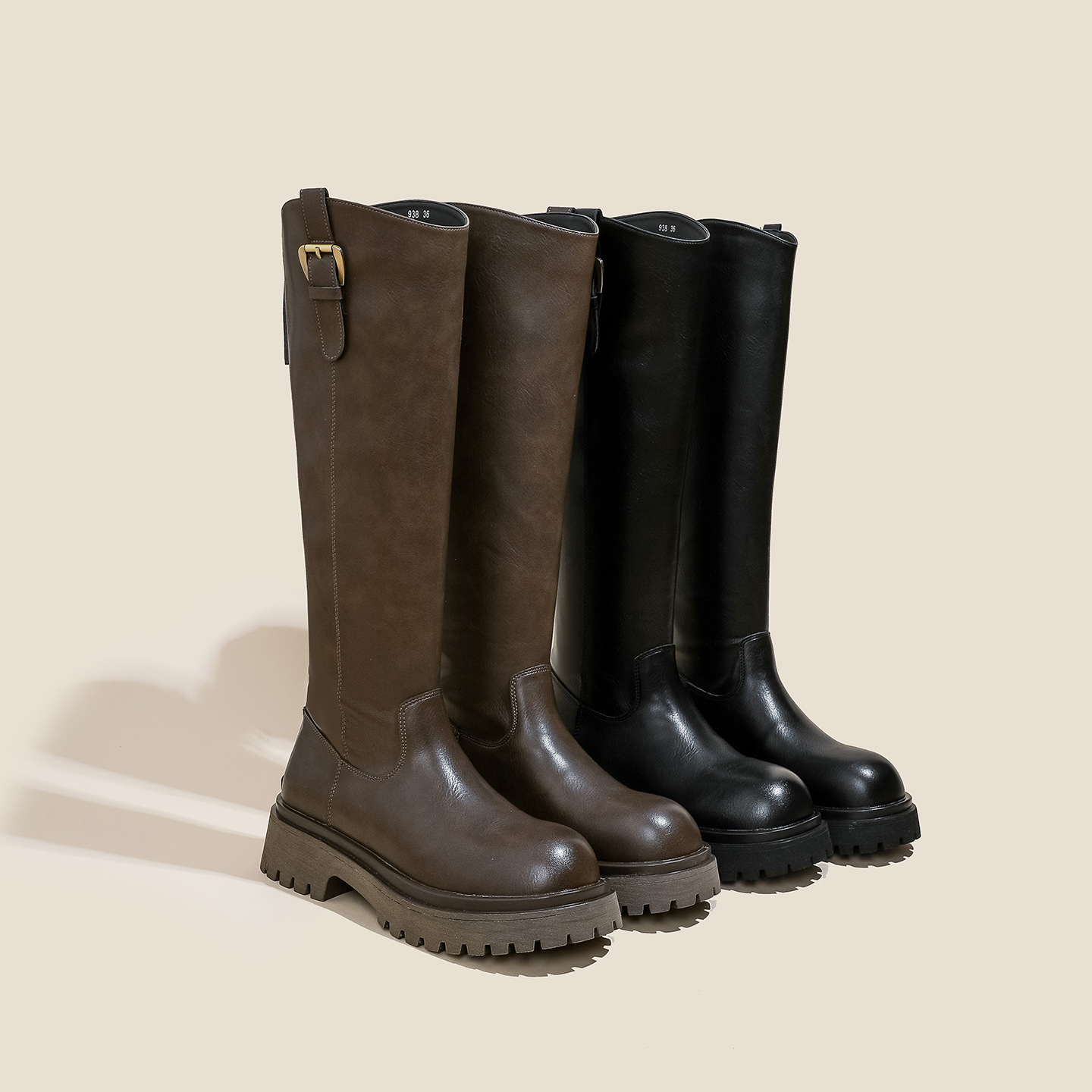 Главная страница > Женские ботинки-сапоги на толстой подошве, осень-зима 2025, высокие до колена, с тонкой пряжкой, красивые коричневые.