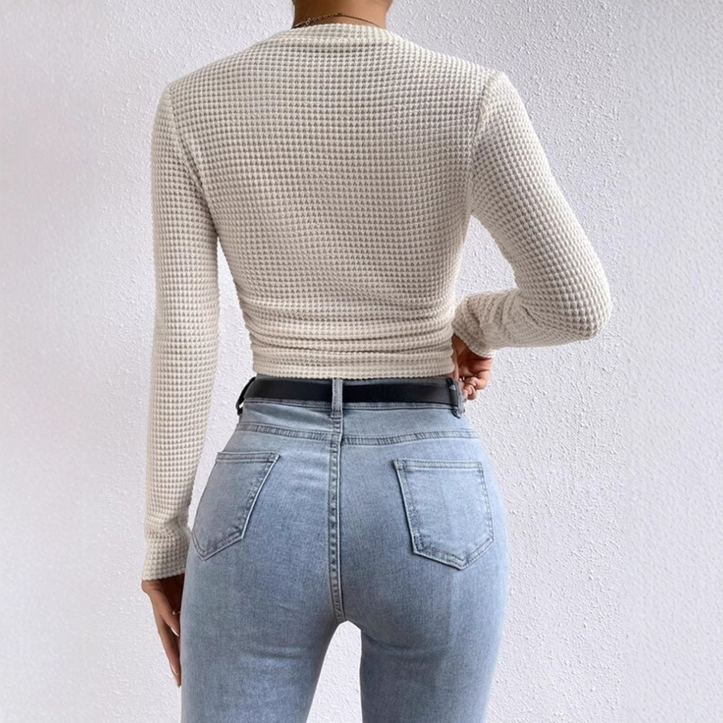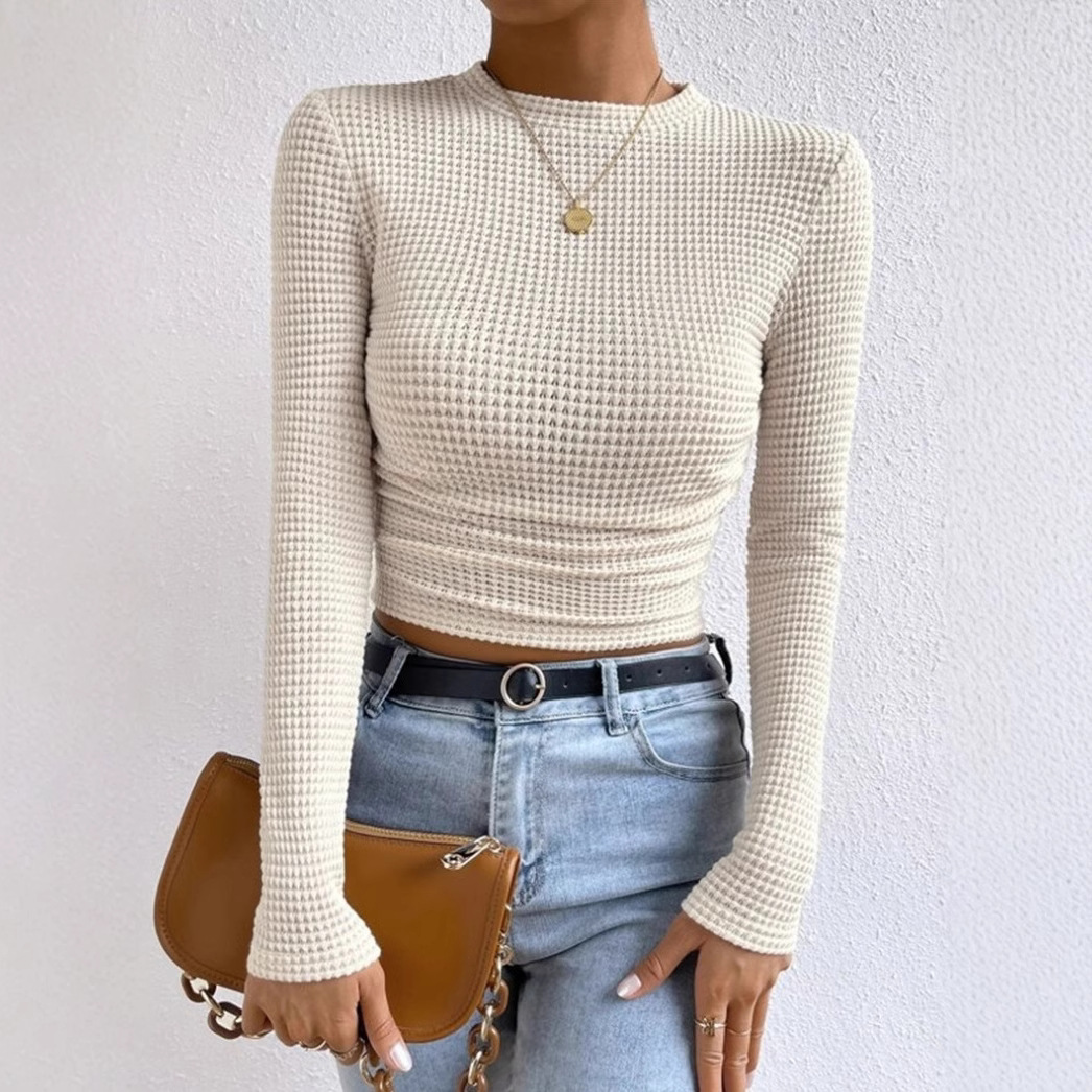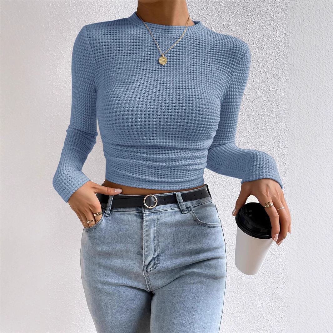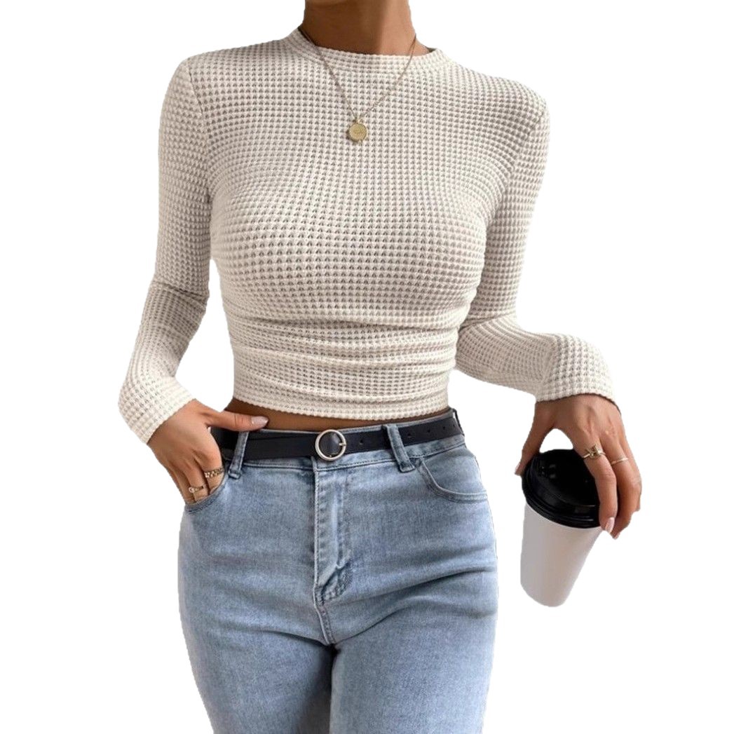 Главная страница > Универсальная женская футболка с длинными рукавами и круглым вырезом в клетку, с драпированными деталями, в стиле slim-fit, для осени и зимы 2025 года, вдохновленная тенденциями Европы и Америки, доступная на Amazon и AliExpress.