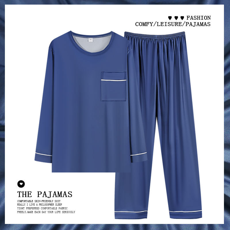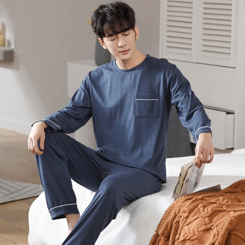 Главная страница > Осенняя Новая мужская пижама из искусственного хлопка с круглым вырезом и длинным рукавом, комплект из двух предметов, зрелое чувство, темно-синий однотонный, повседневная домашняя одежда