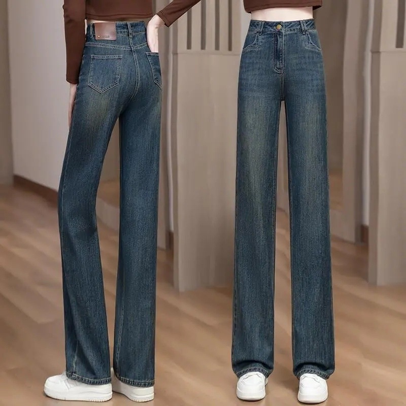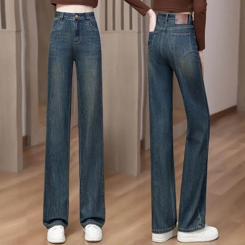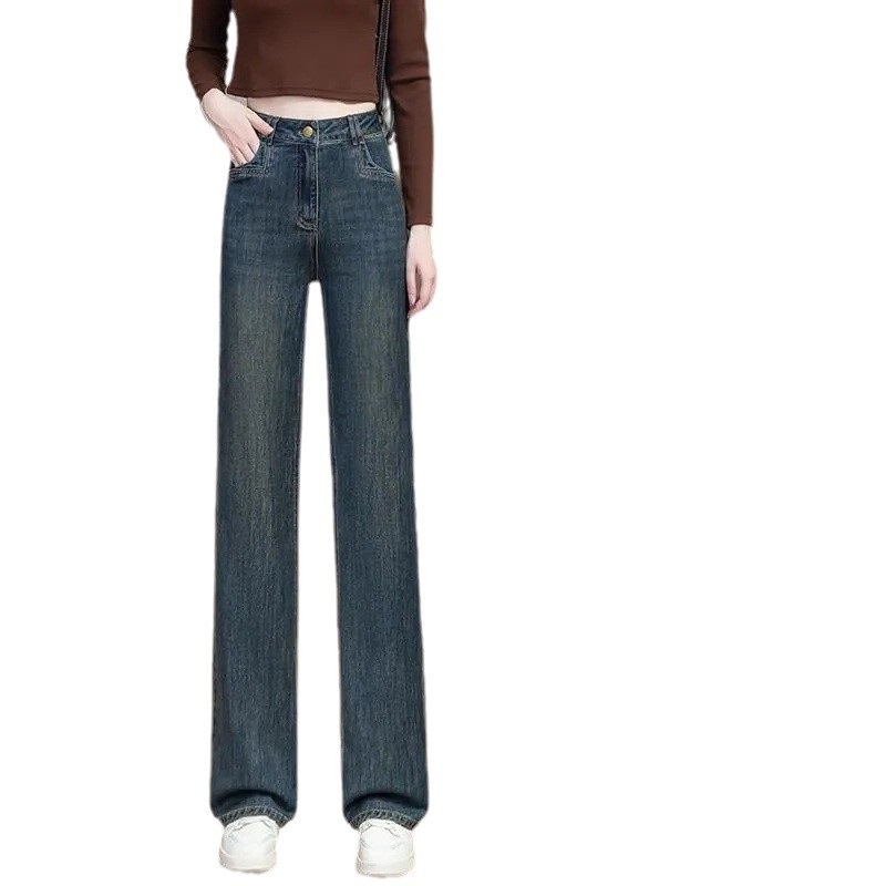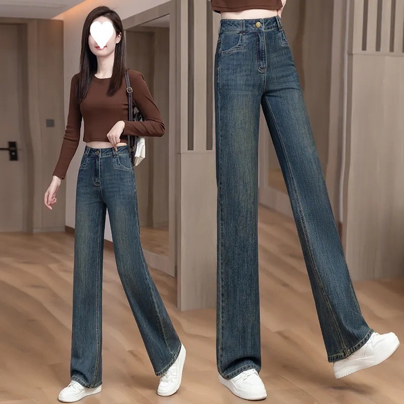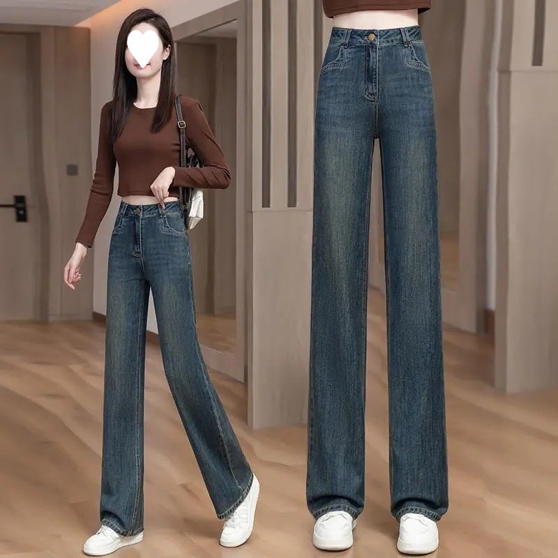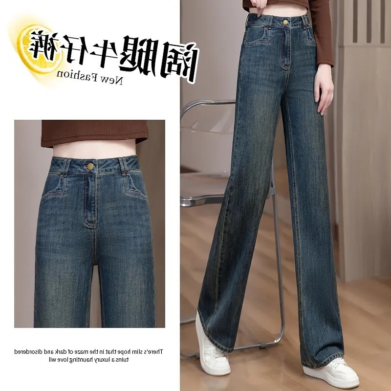 Главная страница > 2025 женские весенние узкие широкие джинсы с высокой талией, весенне-осенние длинные брюки, свободные драпированные прямые брюки длиной до пола