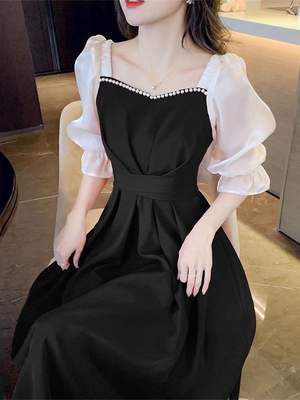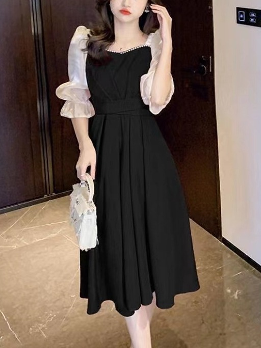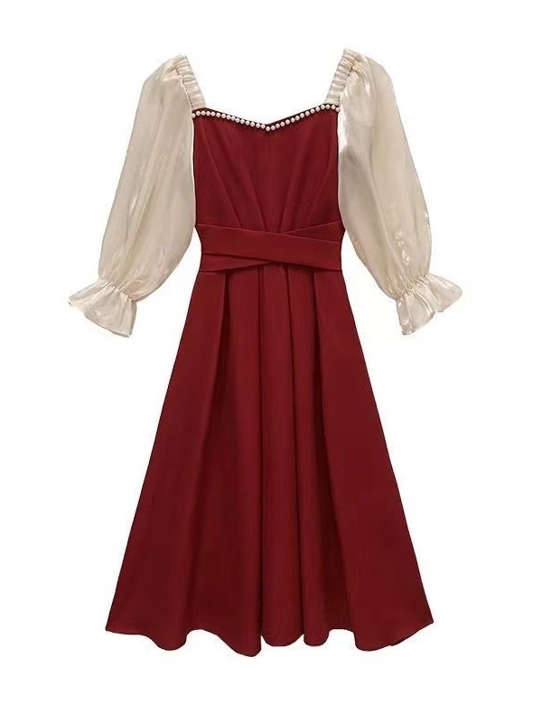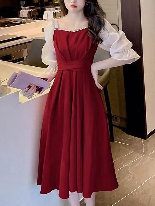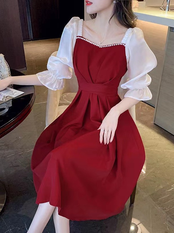 Главная страница > Красное платье-трапеция для женщин, лето 2025, новая модель, французский стиль, с завышенной талией, стройнящее, средней длины, для подружек невесты, вечернее платье