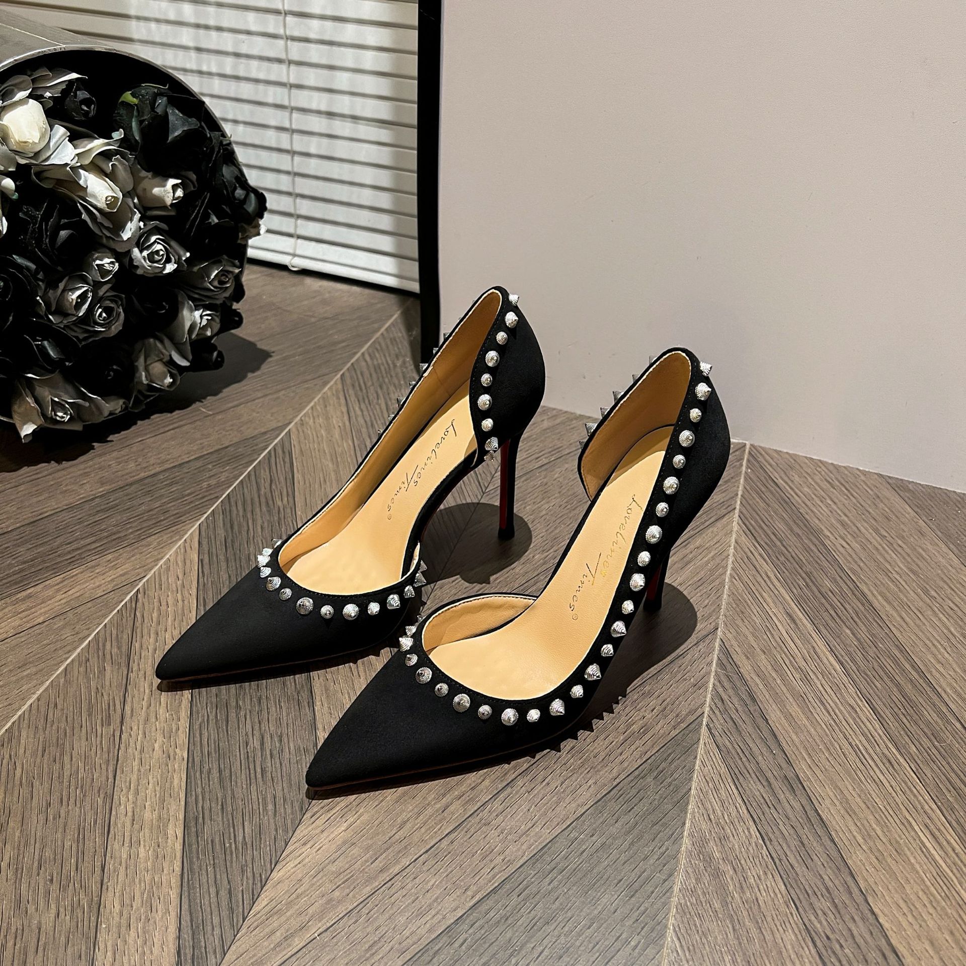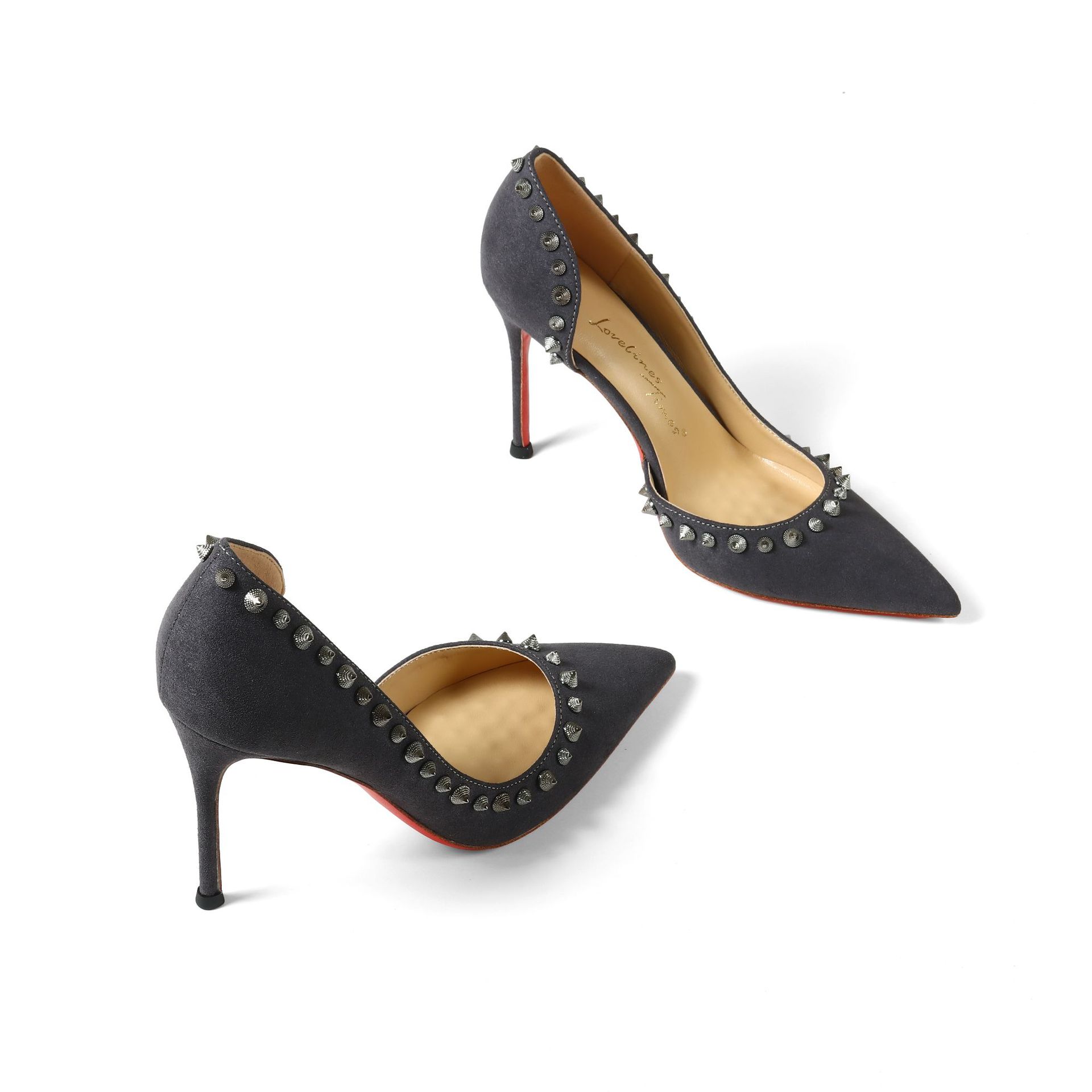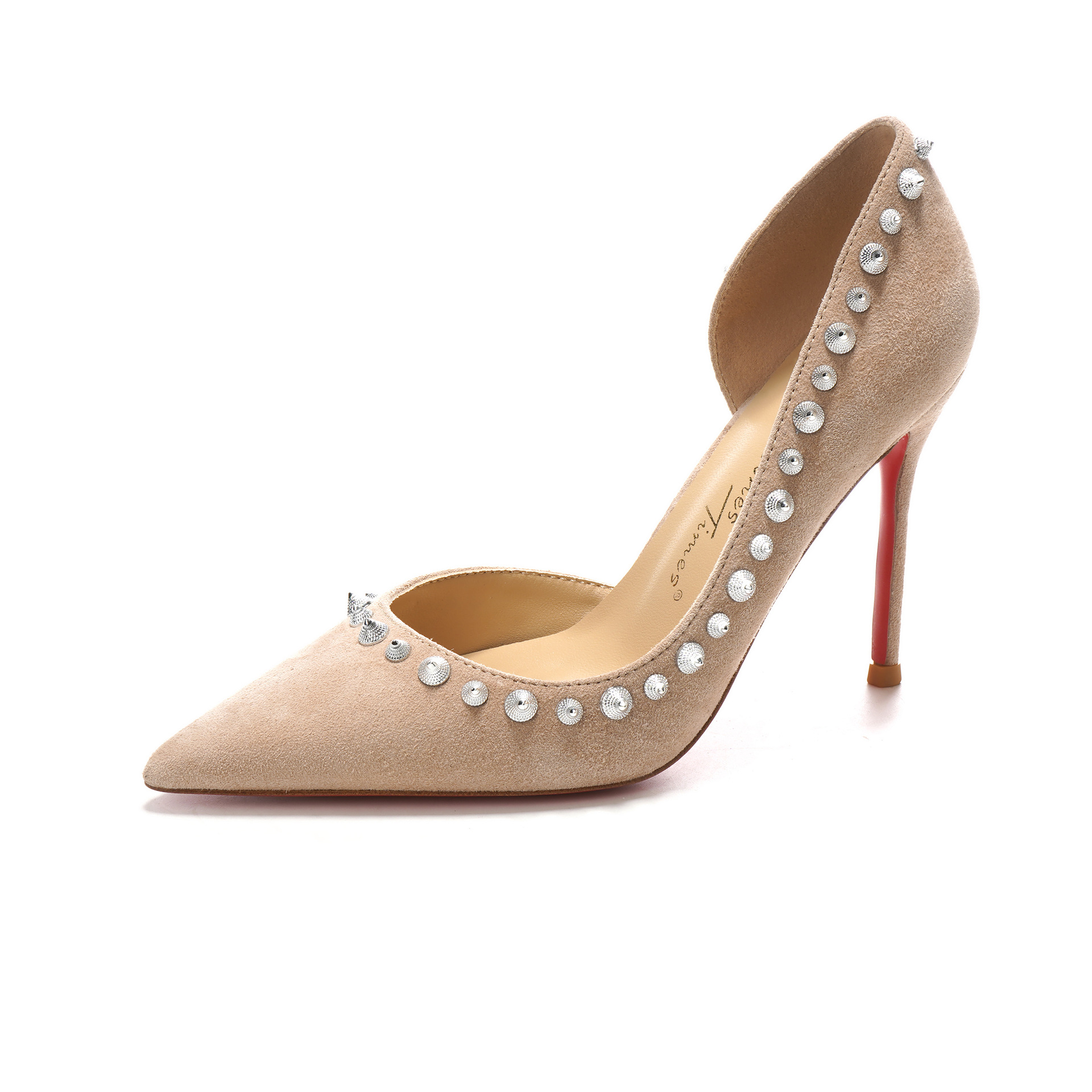 Главная страница > Женские туфли на высоком каблуке во французском стиле, из замши, цвета нюд-розовый, с шипами, на красной подошве, с неглубоким вырезом и боковыми вырезами.