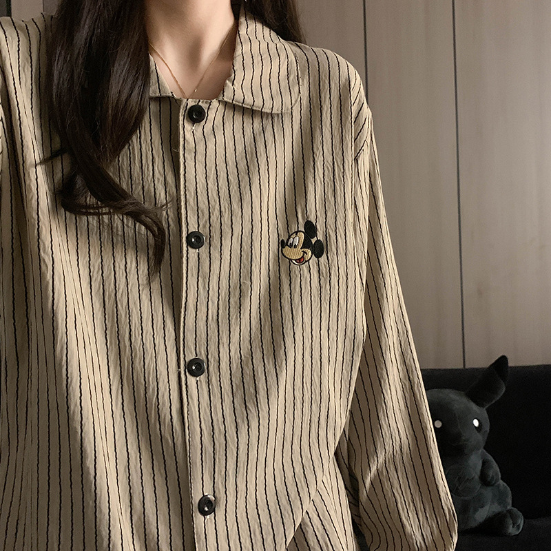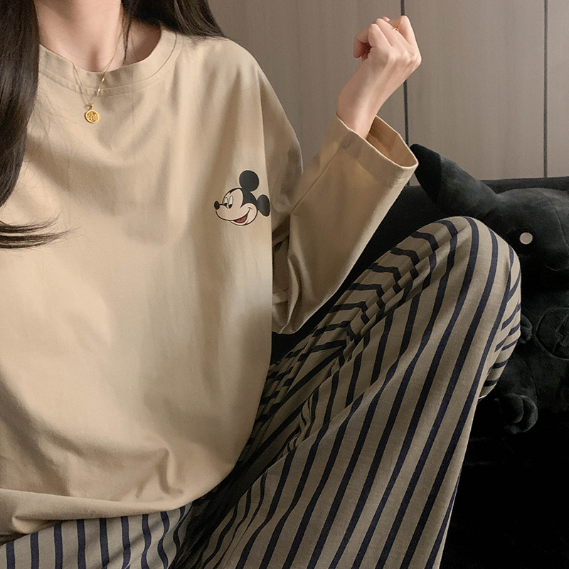 Кофейная полоска с простым узором и круглым вырезом, длинные рукава Микки + брюки