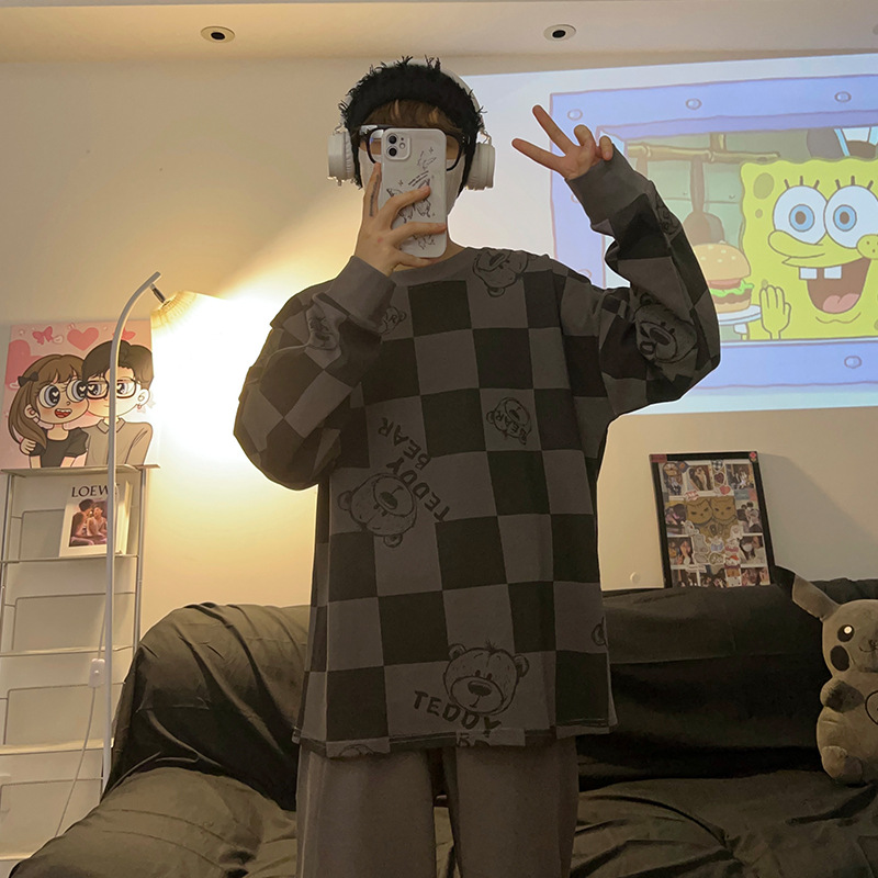 Клетчатый медведь с простым узором и круглым вырезом, длинные рукава + брюки