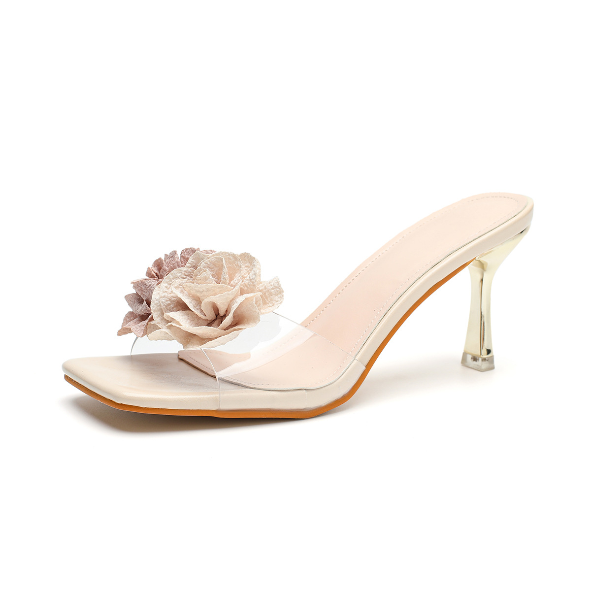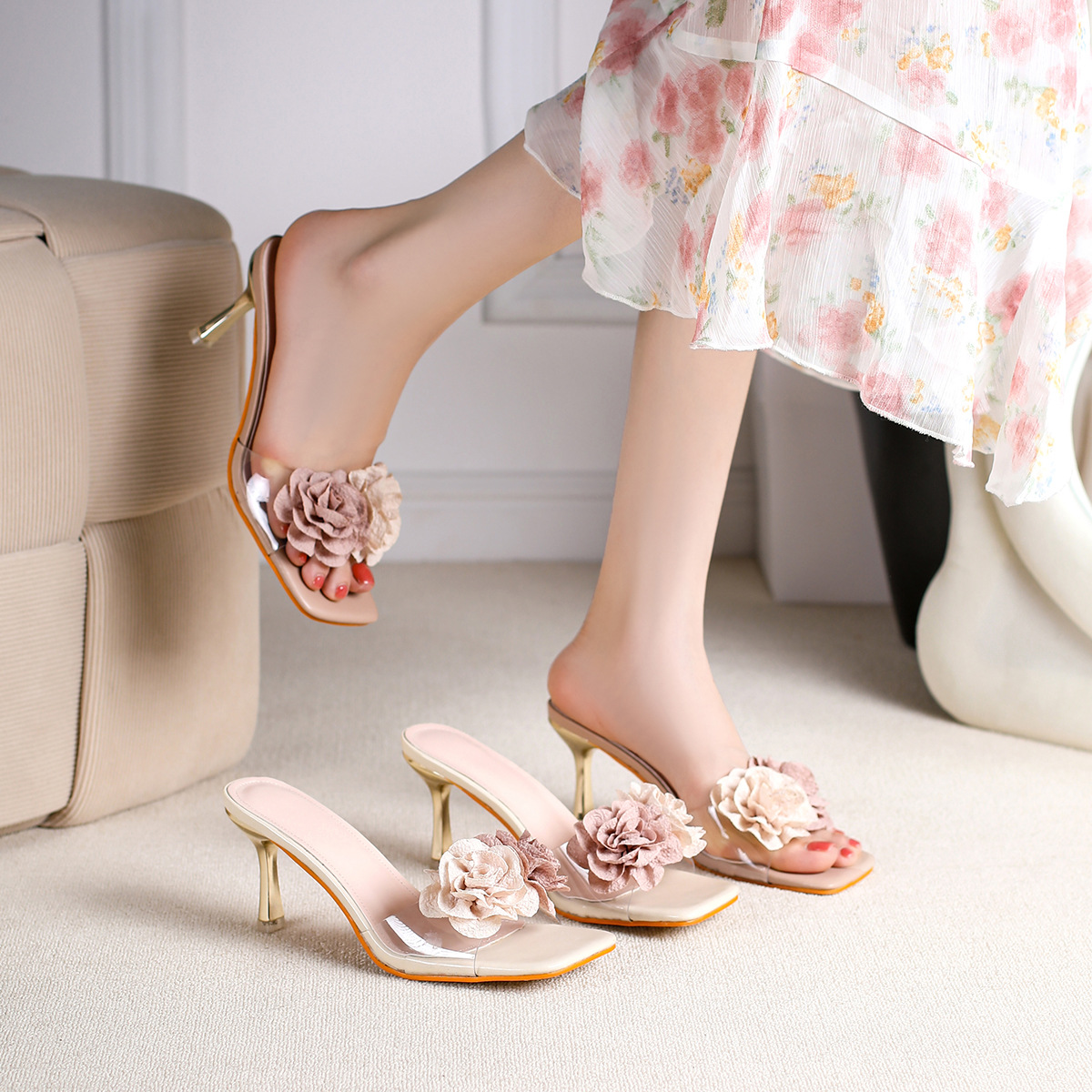 Главная страница > Женские босоножки на высоком каблуке с квадратным носком, летняя новинка 2025 года, с камелиями, универсальные балетки на шпильке с открытым носком.