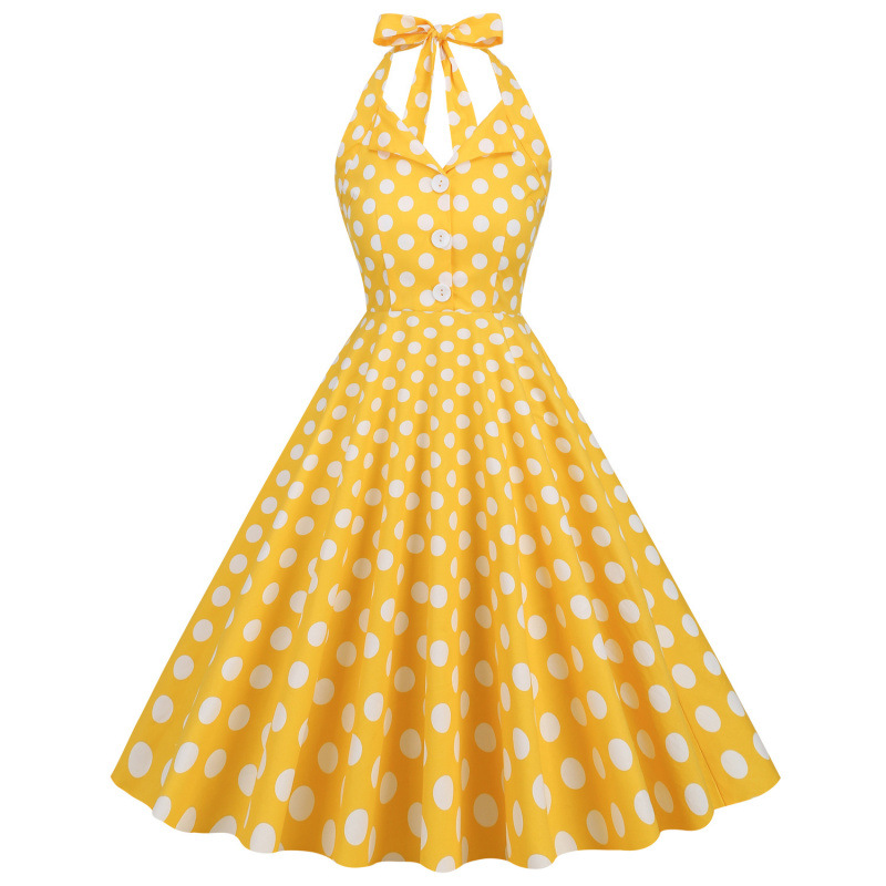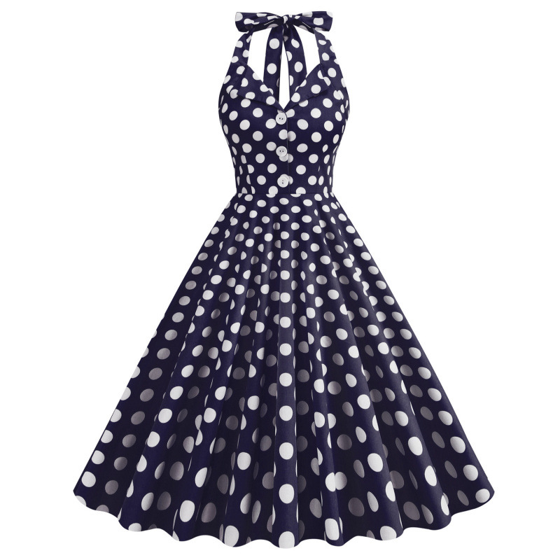 Главная страница > Женское платье в стиле Хепберн 2025 года с лацканами, в горошек, с халтером, без спинки, средней длины, с широким подолом, ретро