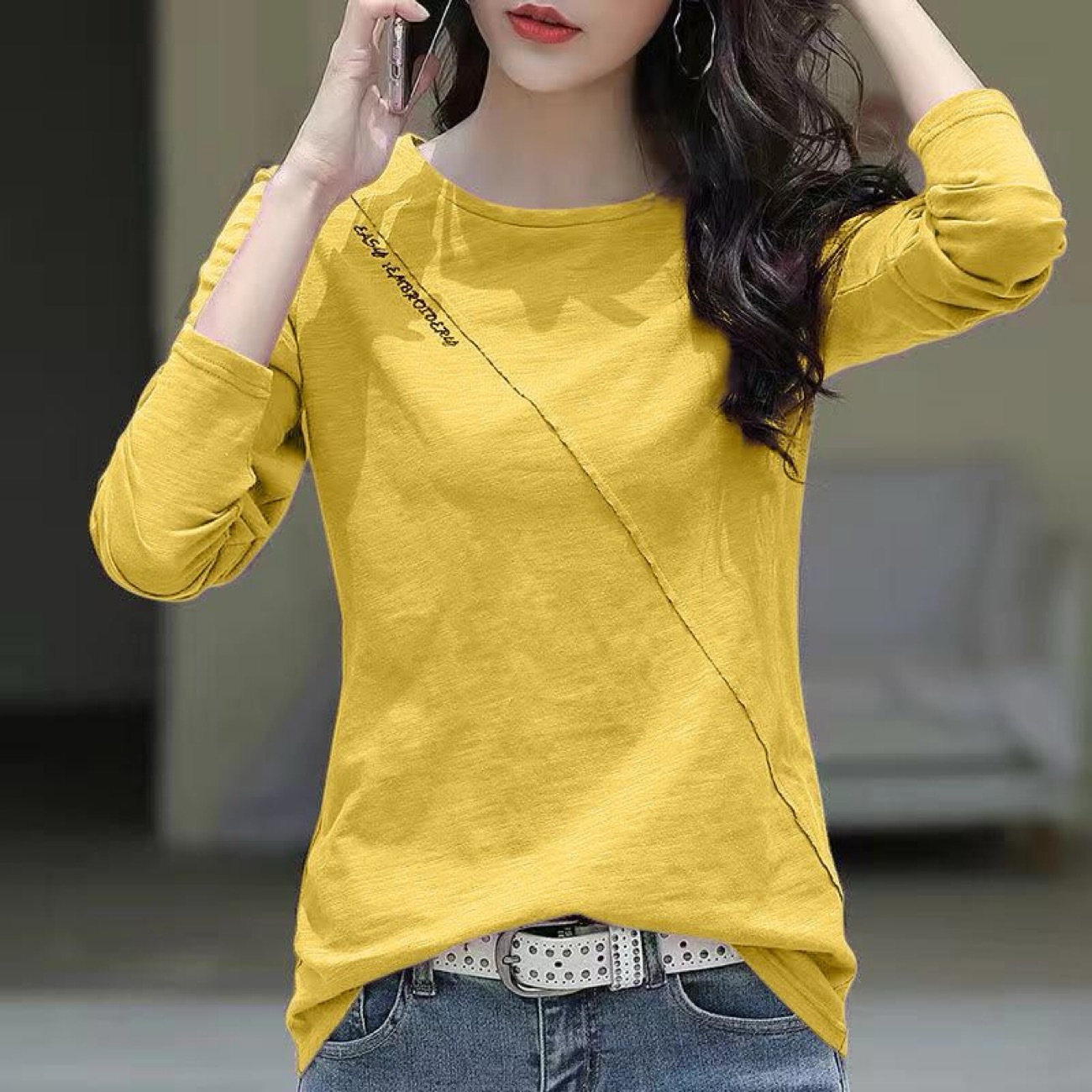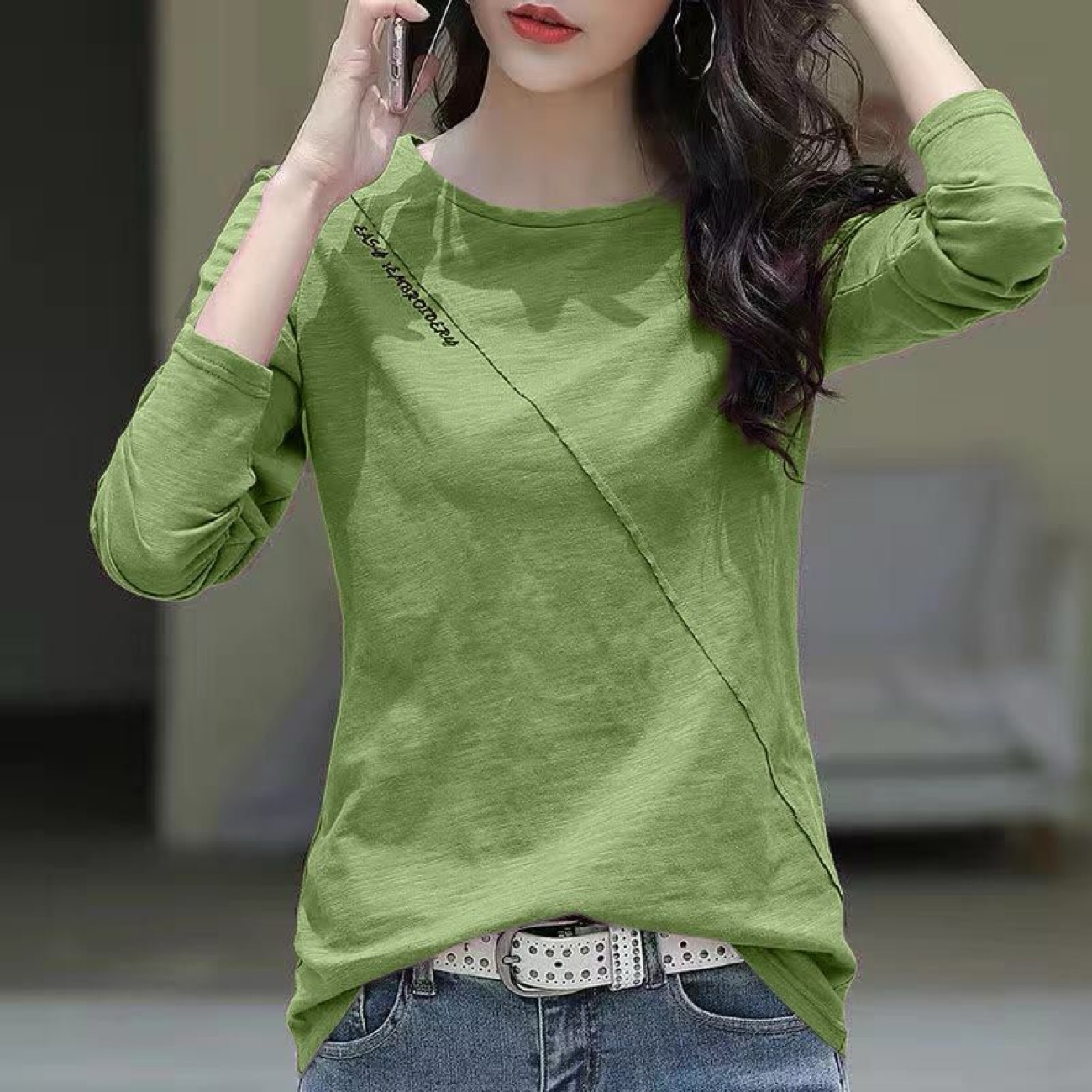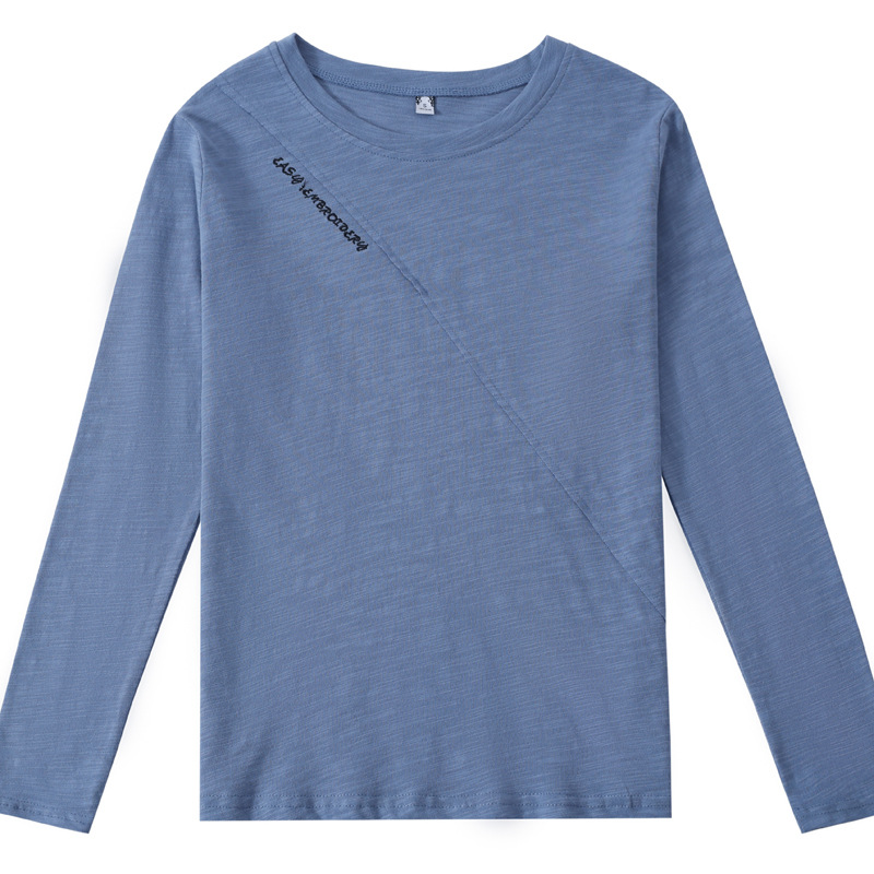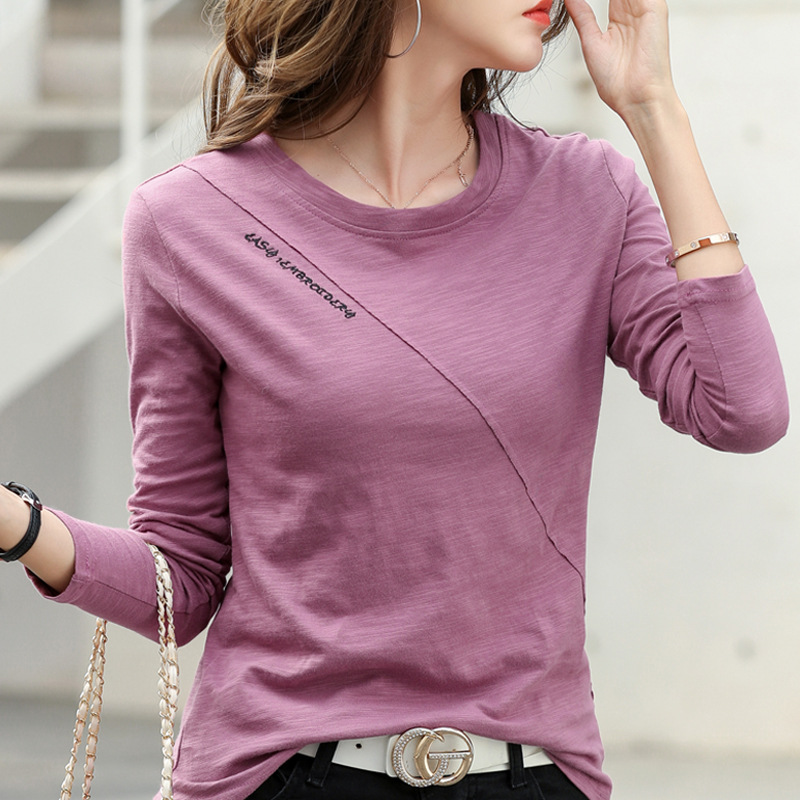 Главная страница > Женская футболка с длинным рукавом, свободного кроя, из вышитого бамбукового хлопка, новинка 2025 года, женская нижняя одежда, базовая футболка с вышивкой.