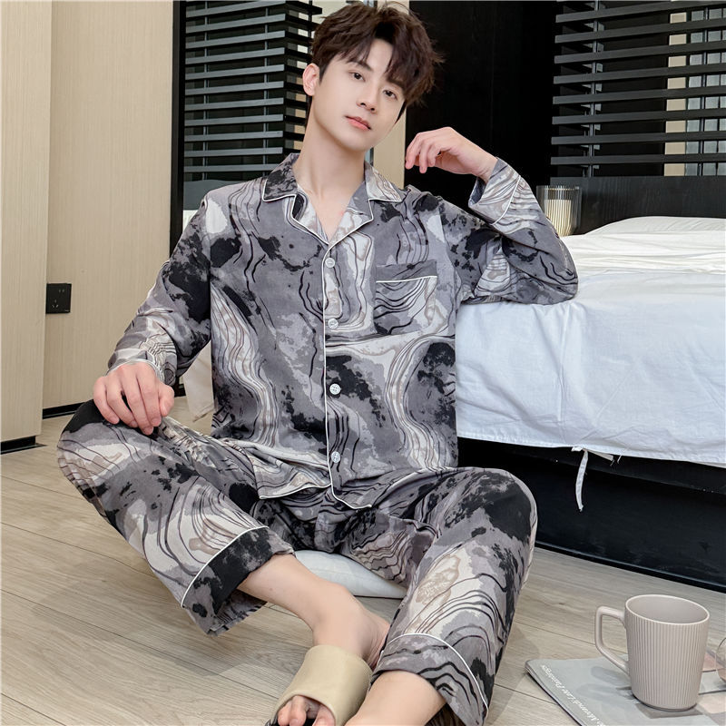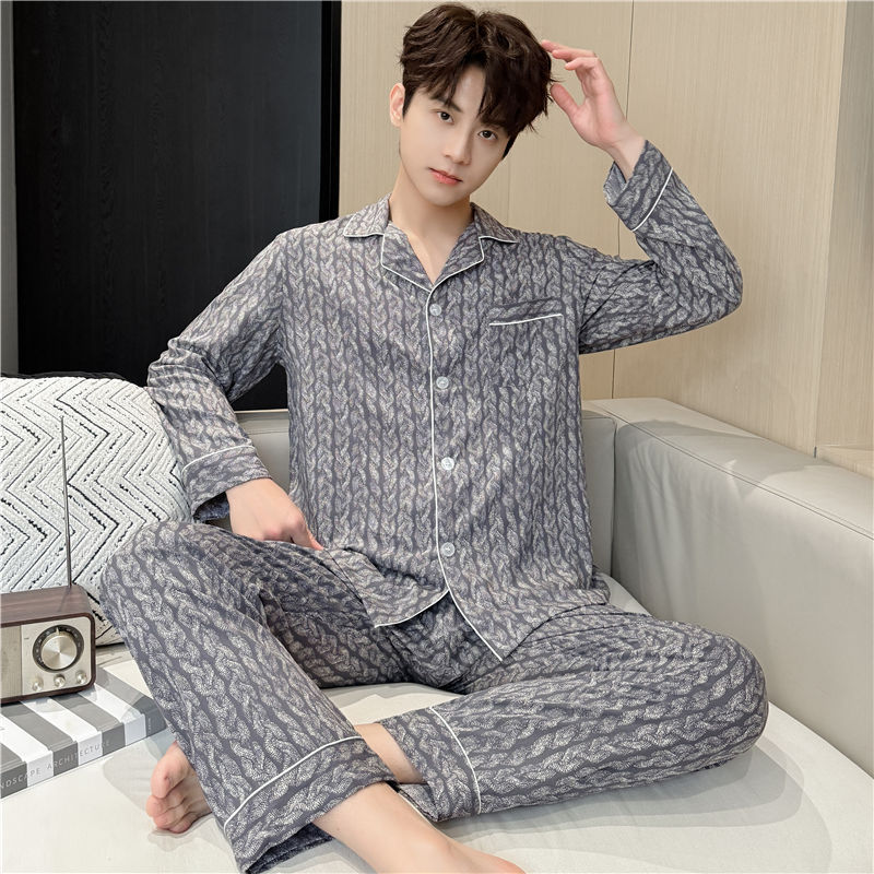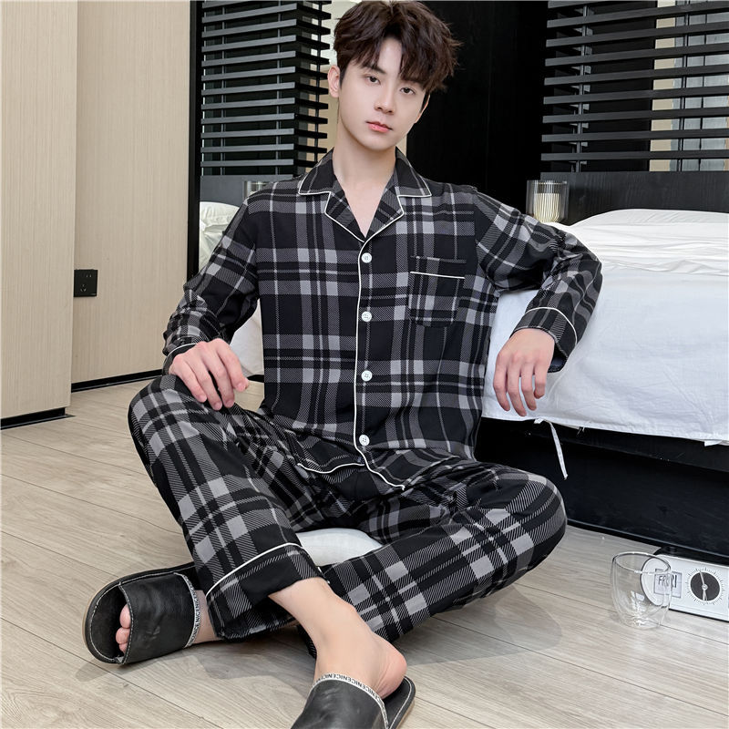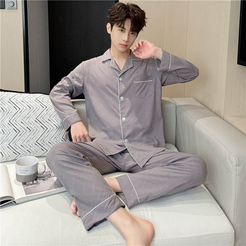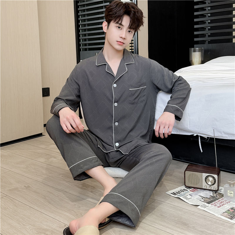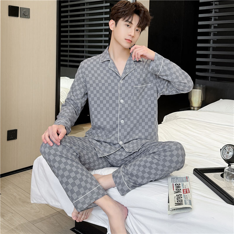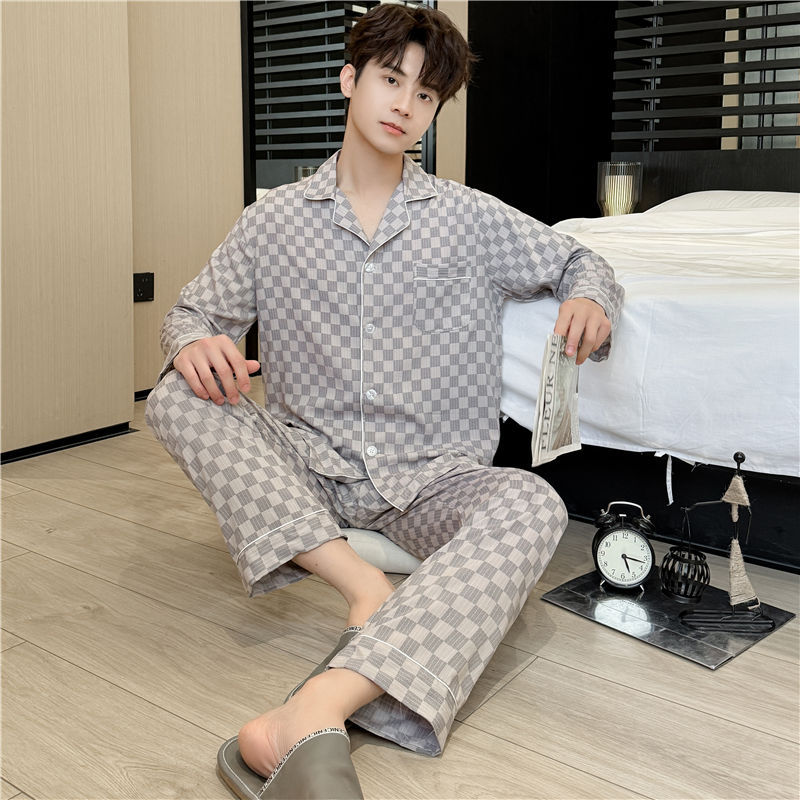 Главная страница > Хлопково-шелковые пижамы мужские весенне-осенние с длинными рукавами большого размера, элитный костюм, летняя домашняя одежда в клетку с тонкими лацканами и принтом